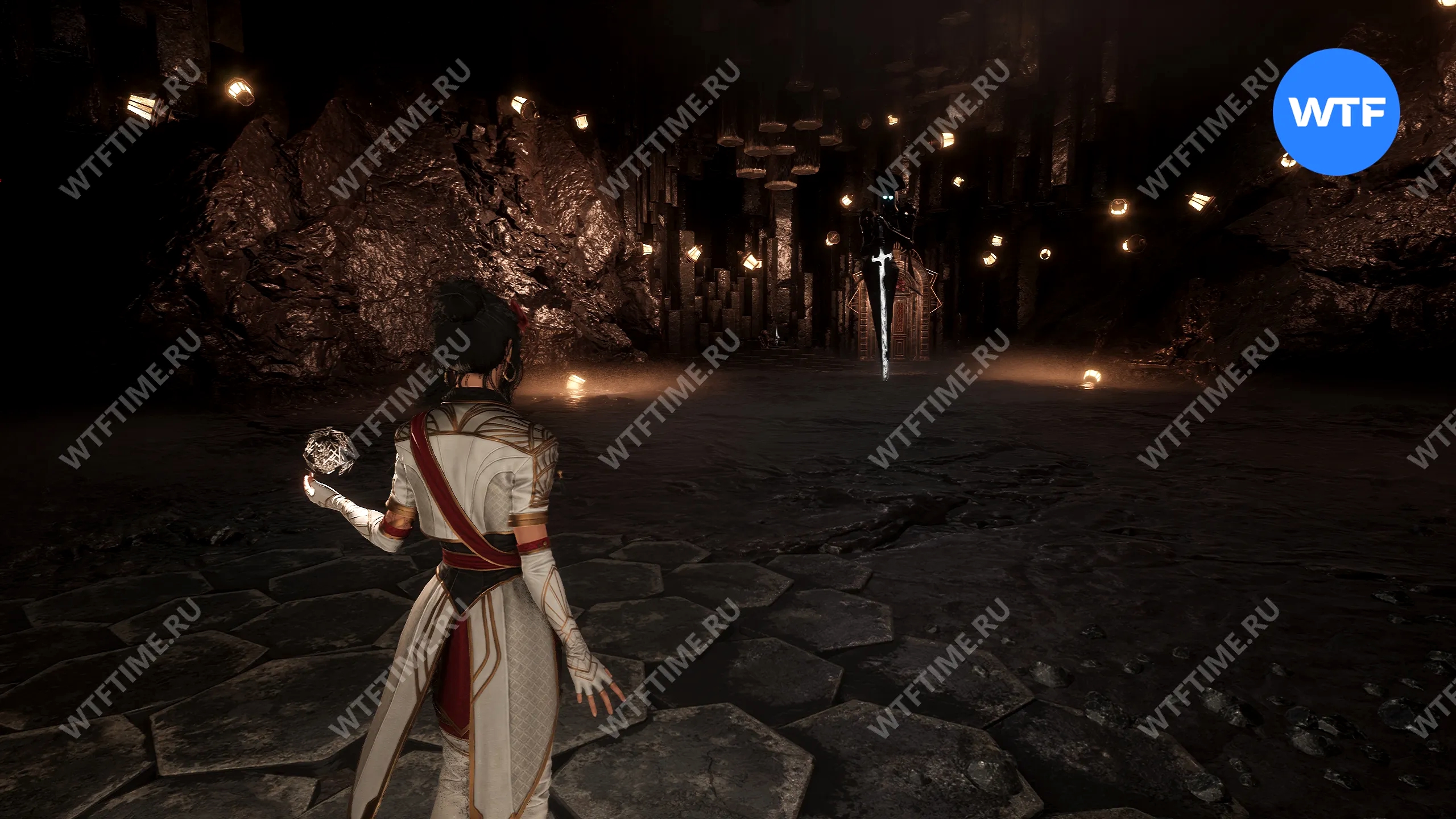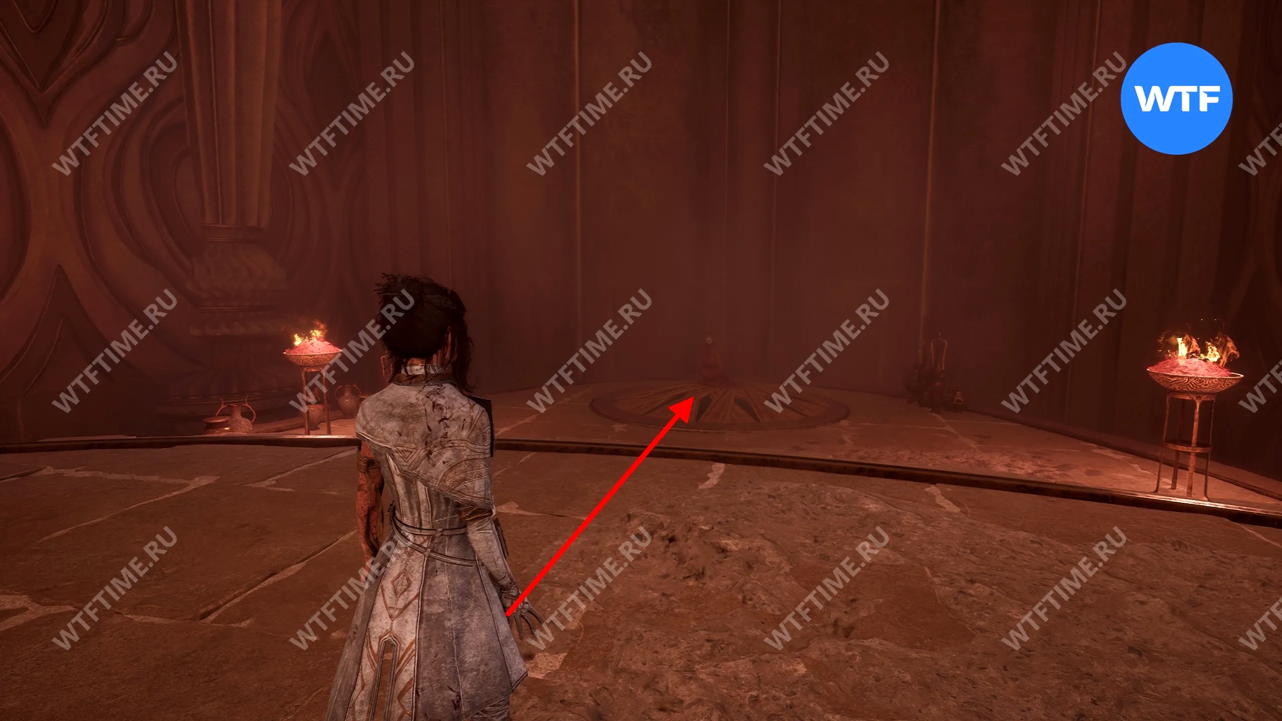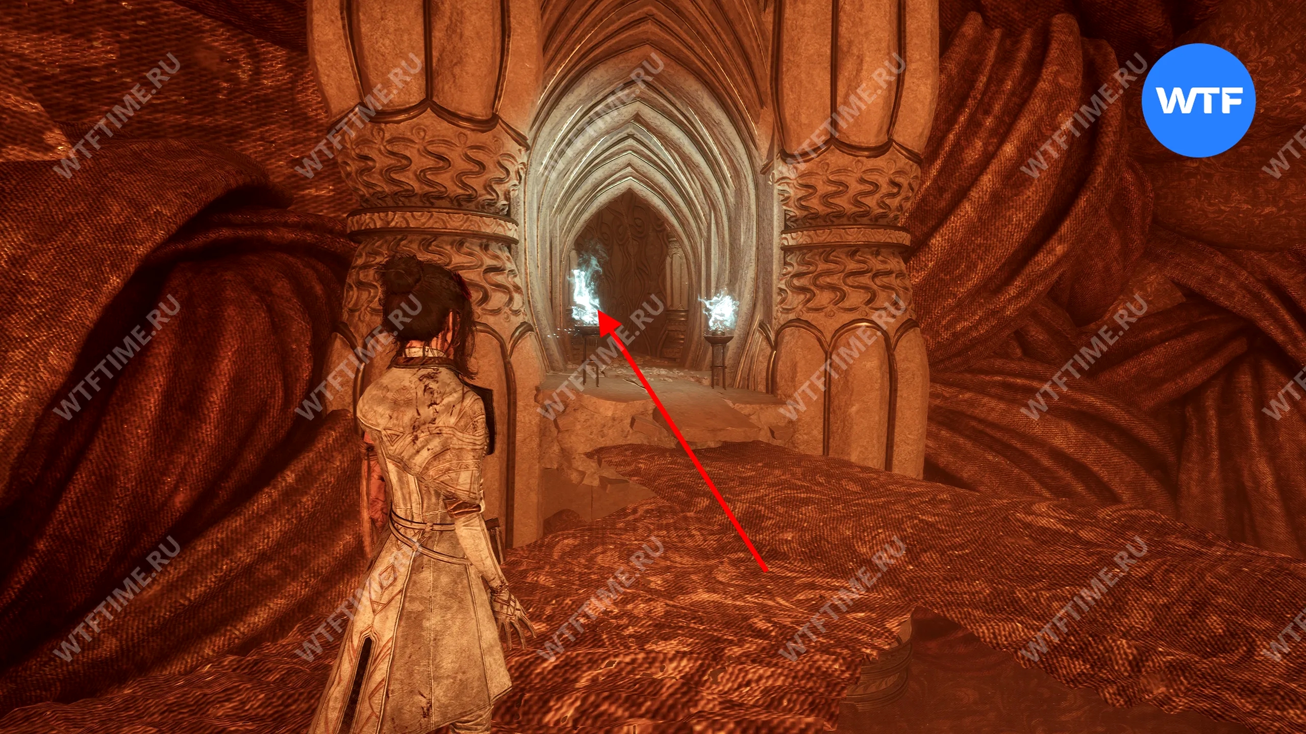 Затем бегите в комнату справа и доберитесь по коврам до арки с факелами. Пройдите немного вперед и воспользуйтесь следующим лифтом, чтобы перенестись в другую область.