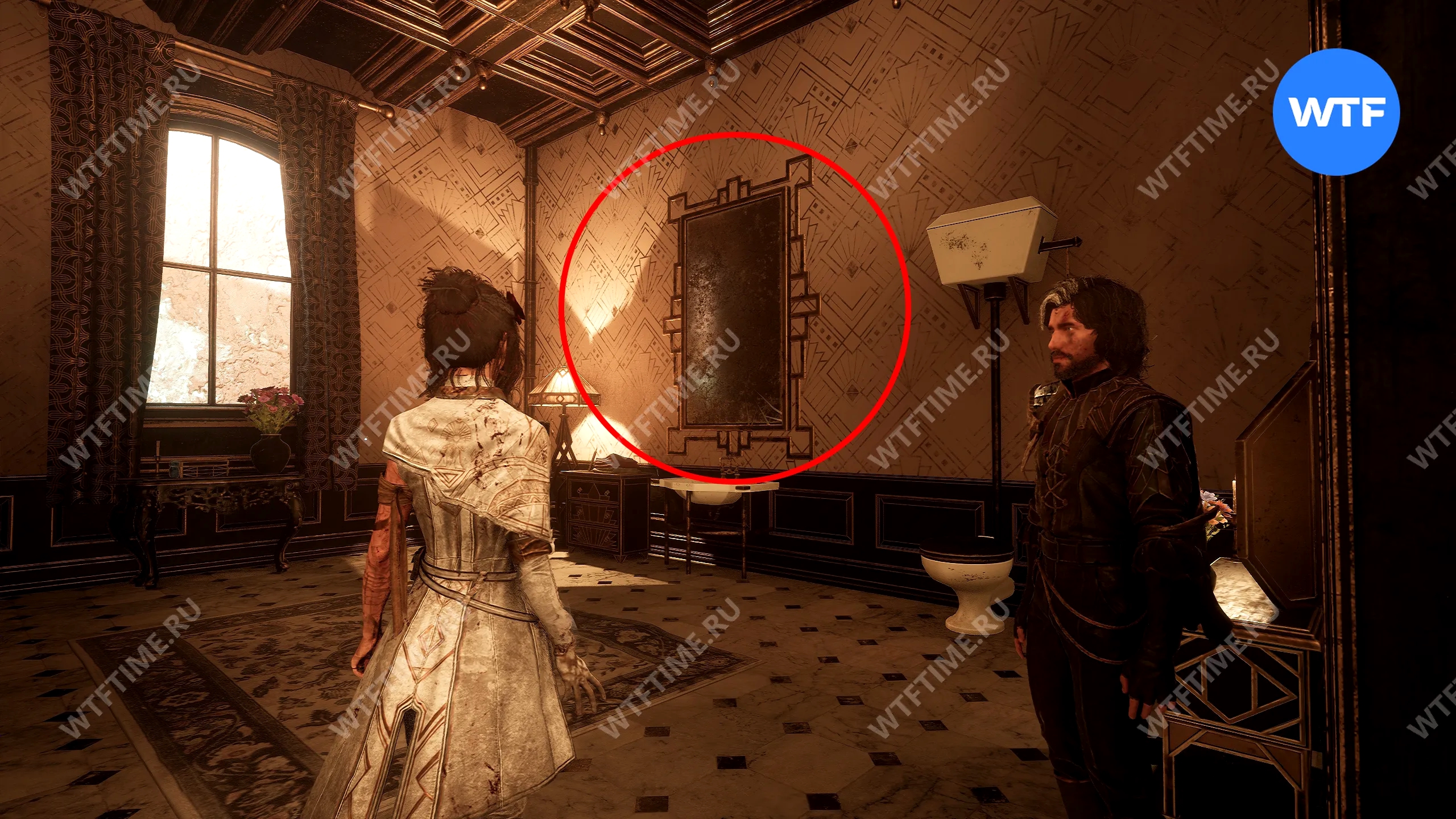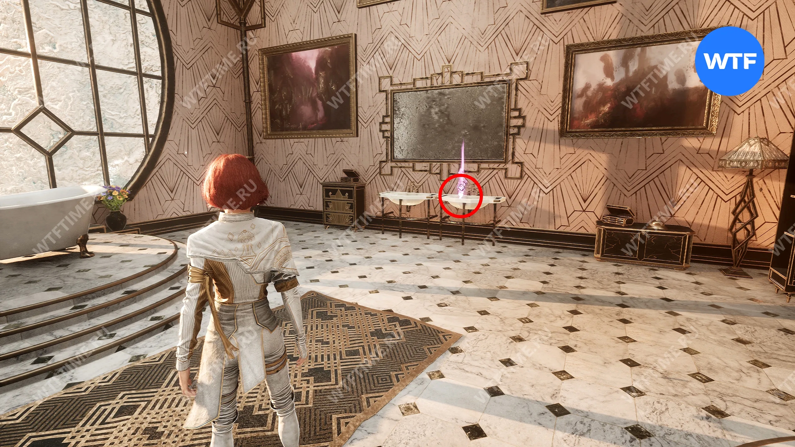 После дыры идите налево — это приведет к большой двери, которая перенесет вас в ванную комнату особняка.
