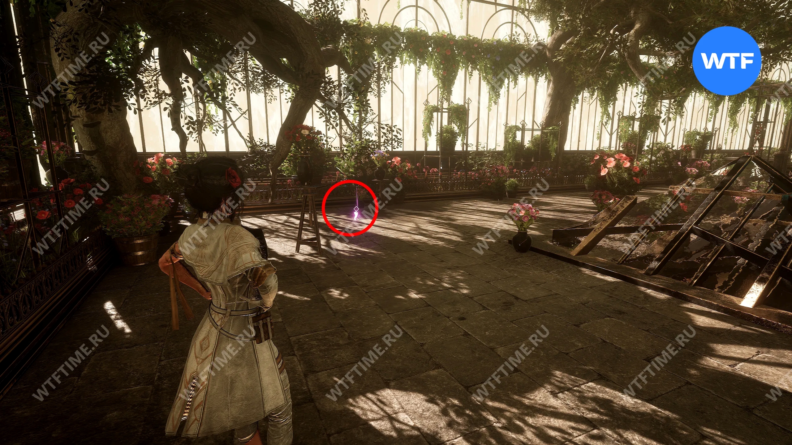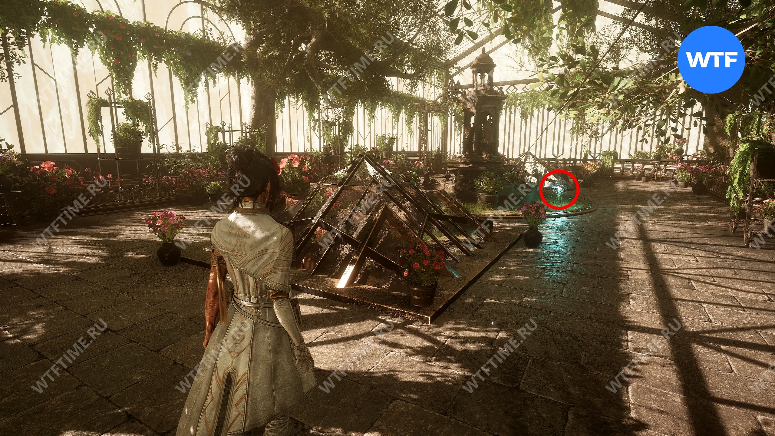 От неё поверните налево и в итоге окажетесь прямо перед дверью, ведущей в оранжерею Особняка. Здесь можно подобрать музыкальную запись «L'Amour D'une Mere» и журнал «Алина».