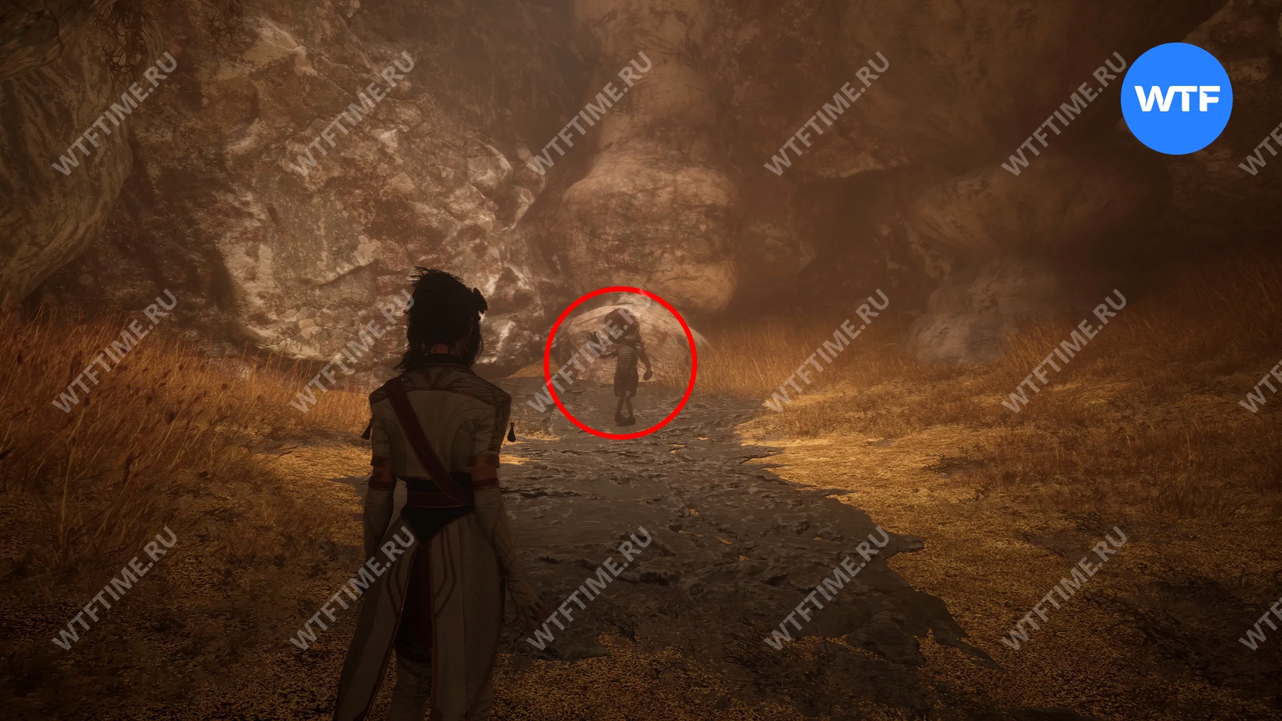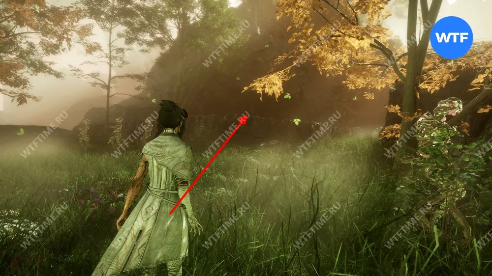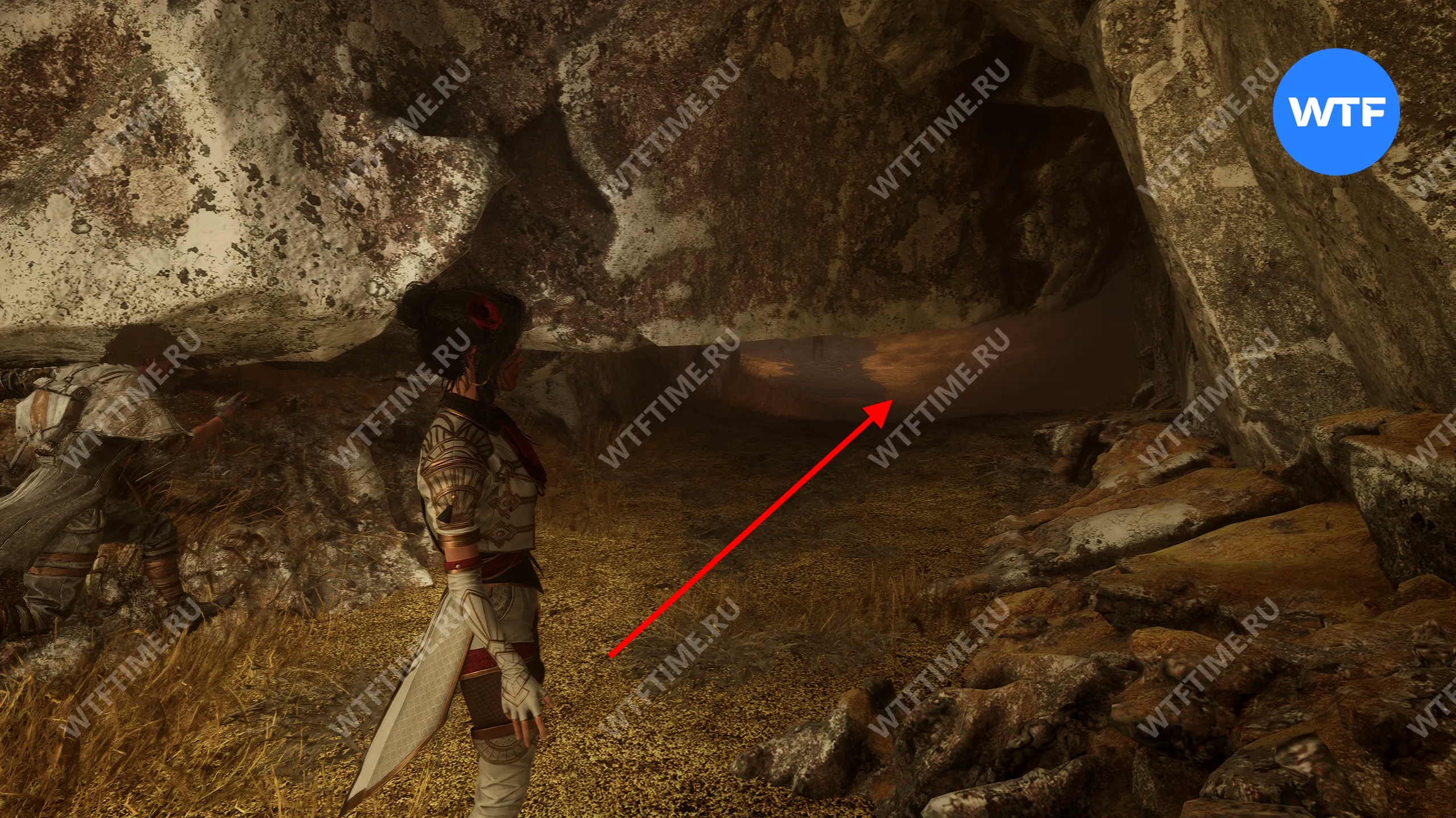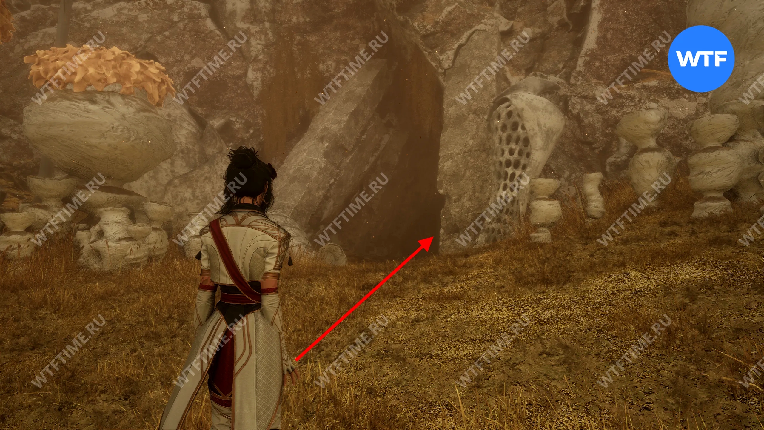 Справа от журнала есть проход среди скал, который в итоге приведет вас к Миму Желтой жатвы.