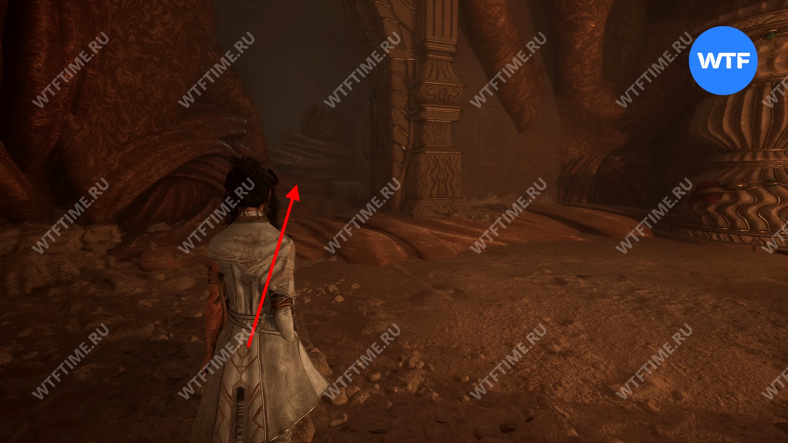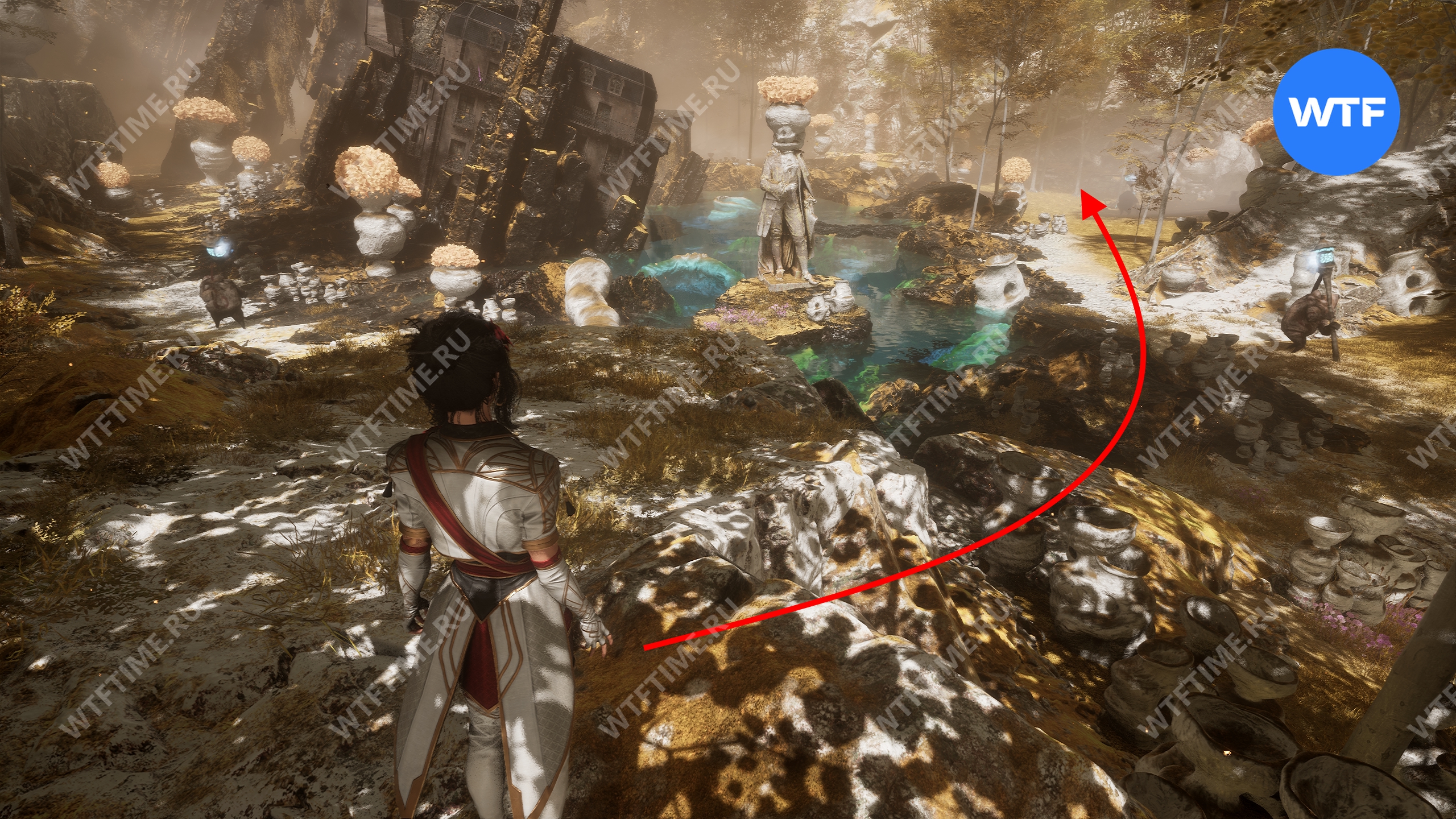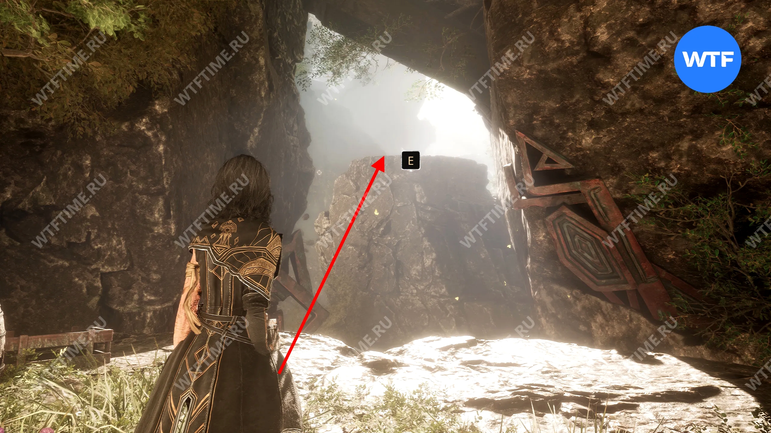 Доберитесь до флага экспедиции «Лабиринт святилища», станьте к нему лицом и идите по тропинке налево. На развилке держитесь правой стороны и пройдите под упавшей колонной.
