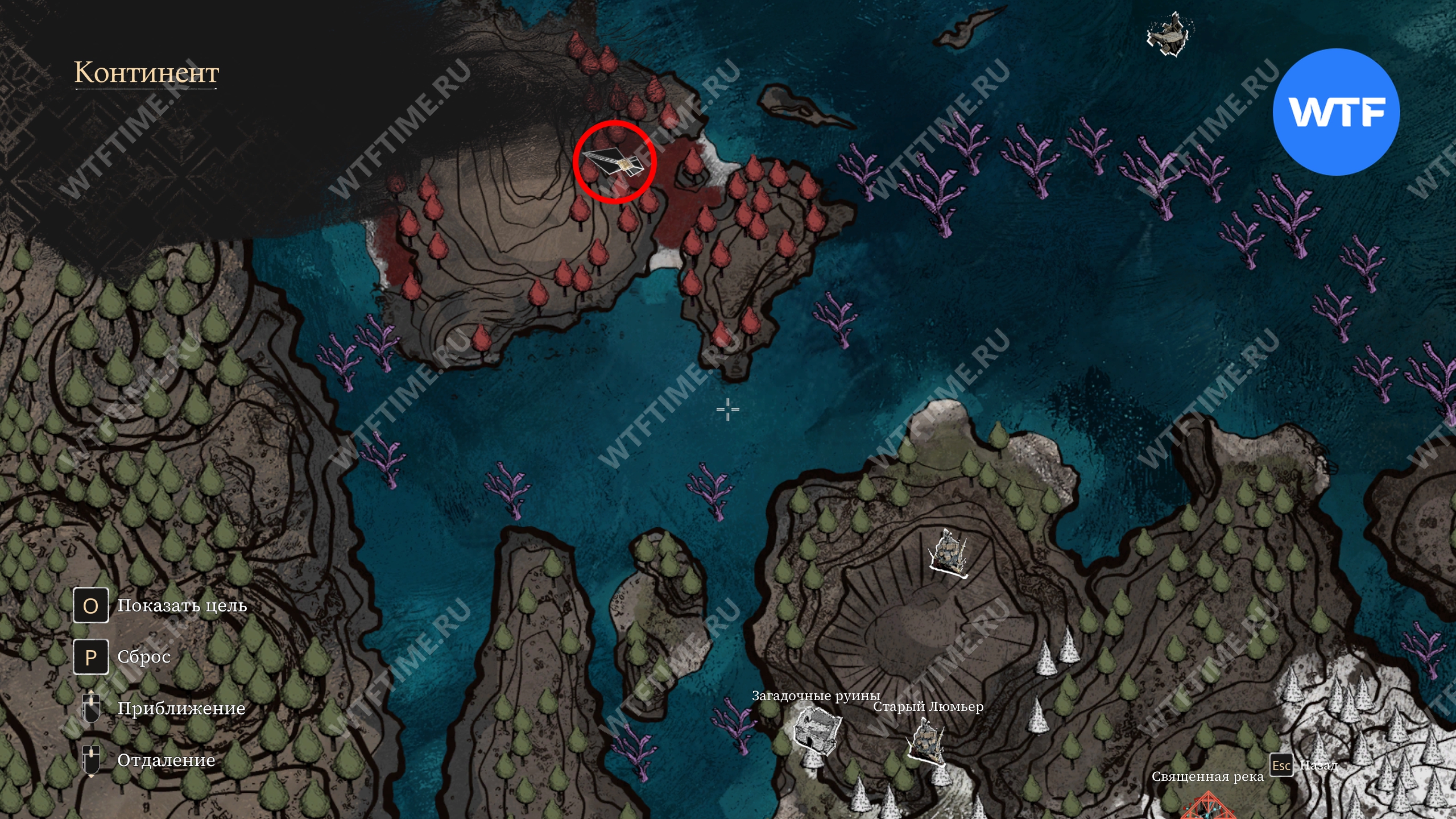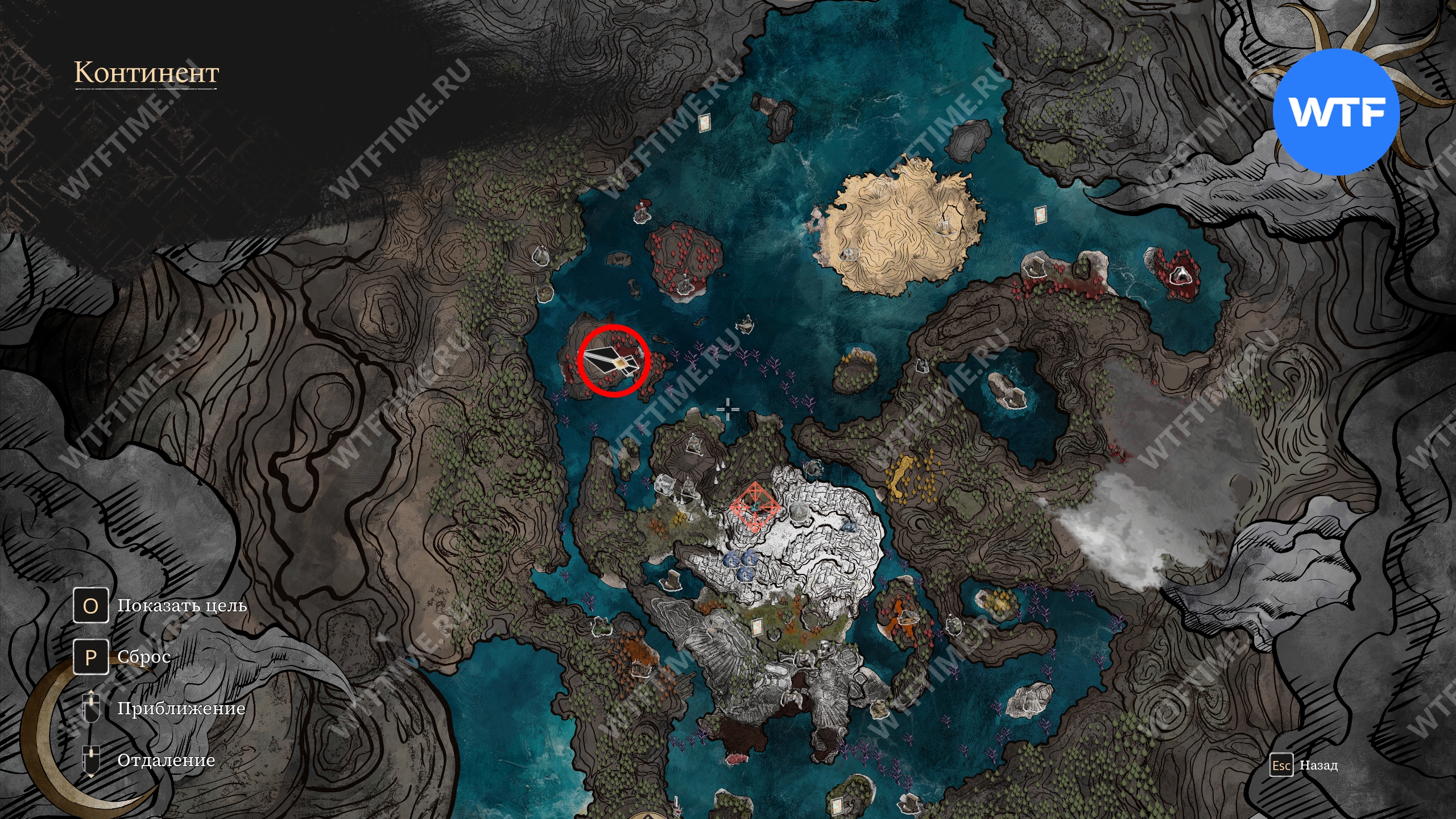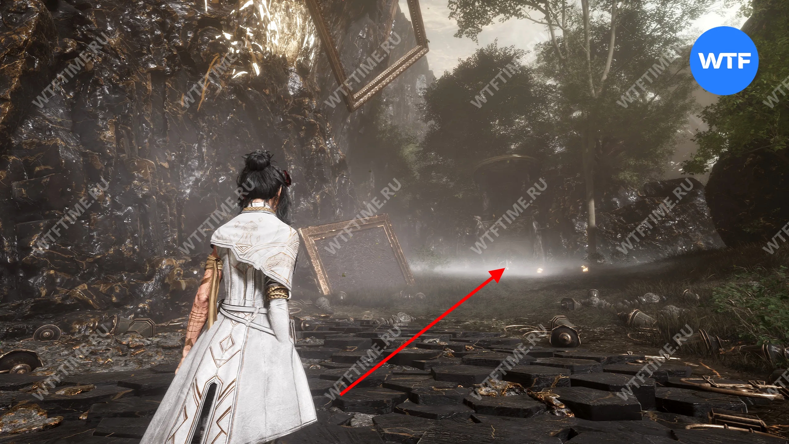 Доберитесь до флага экспедиции «Лабиринт святилища», станьте к нему лицом и идите по тропинке налево. На развилке держитесь правой стороны и пройдите под упавшей колонной.