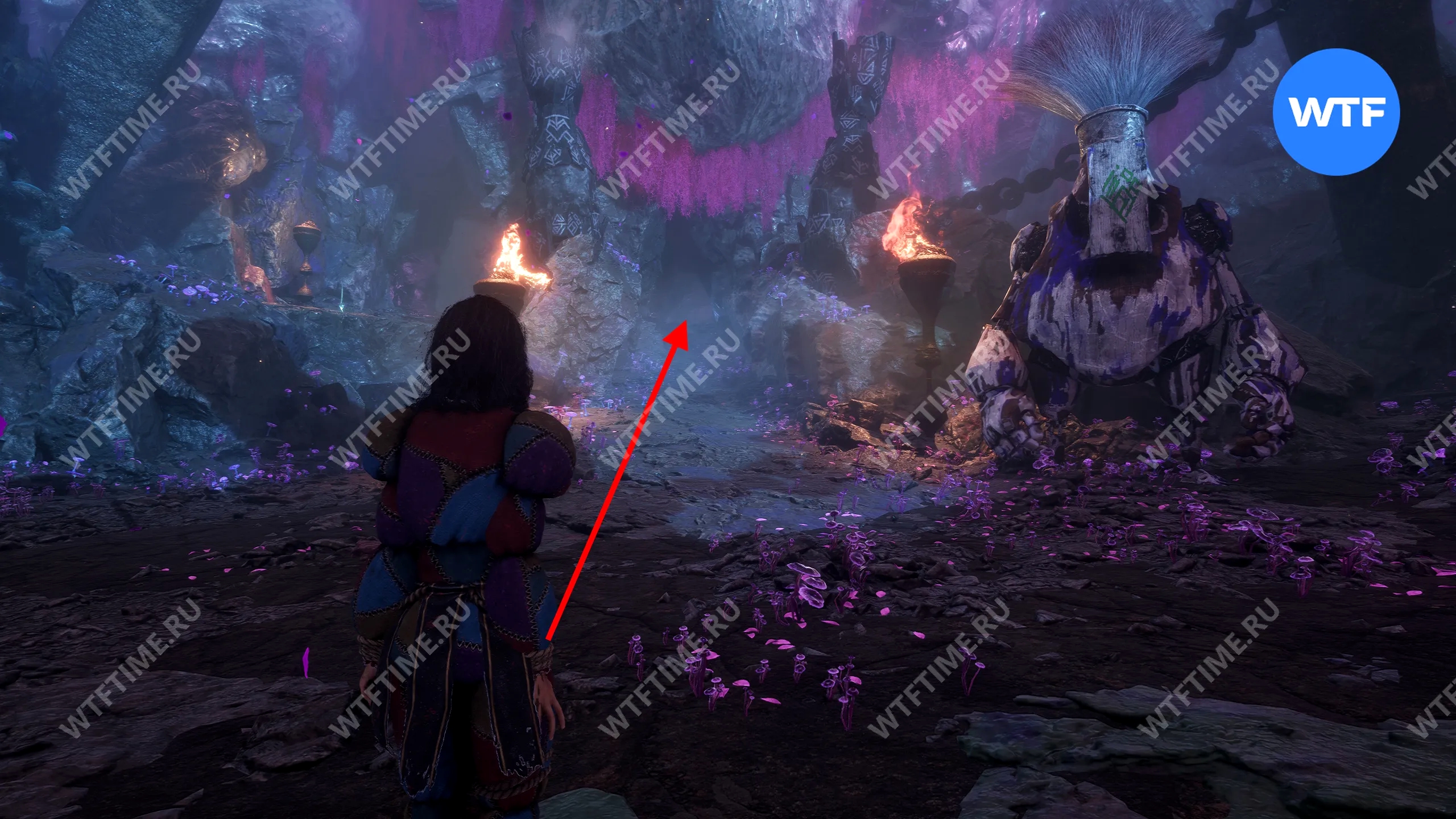 Сразу после этого вы увидите небольшой лаз, ведущий в пещеру, в стене справа. Проберитесь туда, а затем идите налево, чтобы оказаться на поле с мерцающими синими цветами.