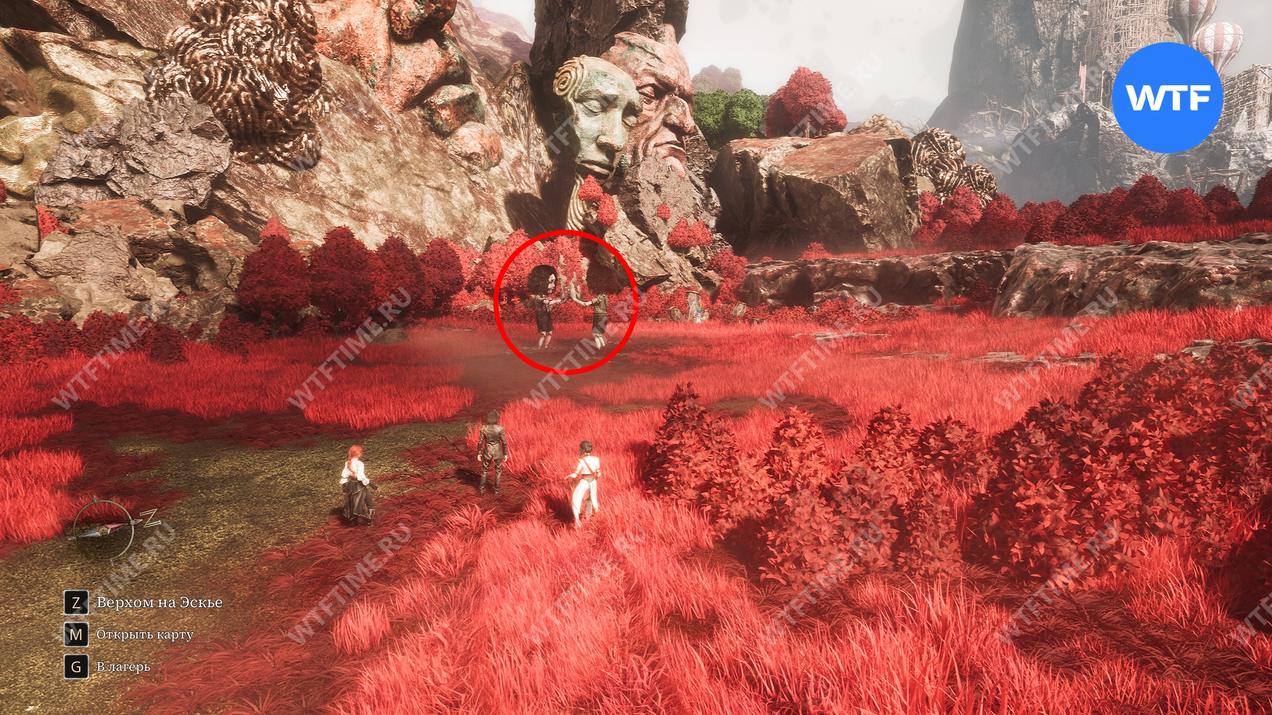 В локации Высь от флага экспедиции «Зона лестниц» спуститесь вниз по деревянному мосту, а затем идите по самому левому пути (номер 2 на скриншоте ниже) и спуститесь вниз по веревке. Сам мим ничем не отличается от других.