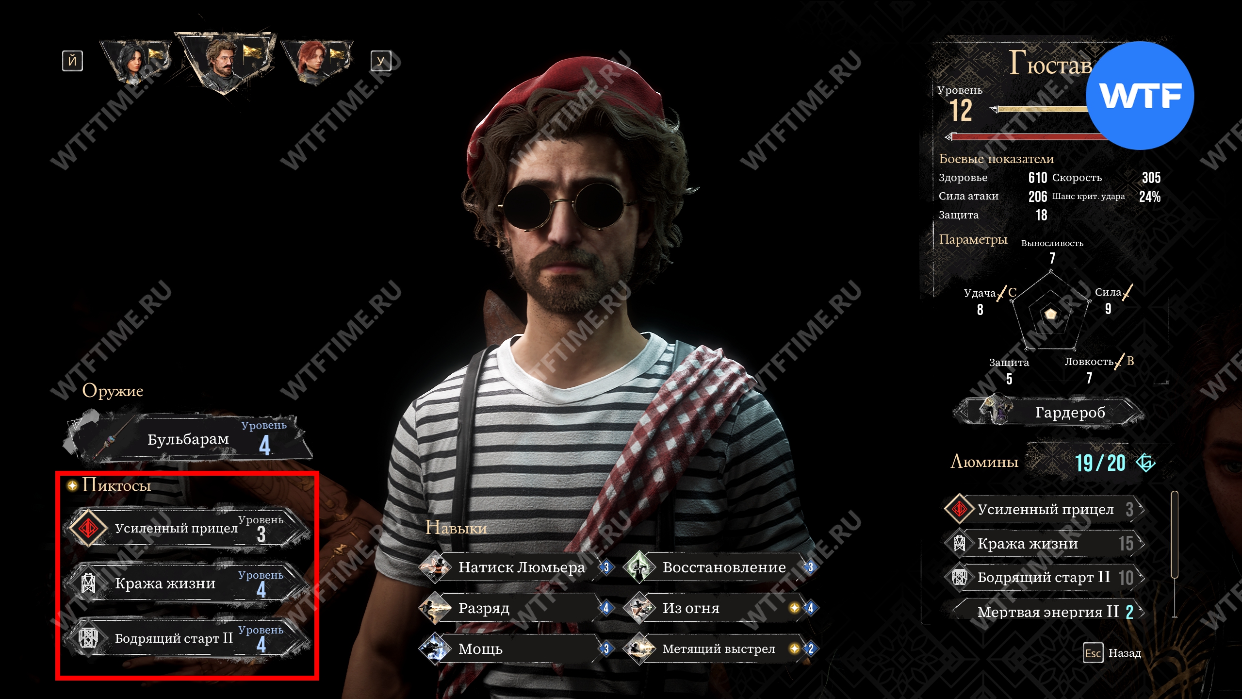 - Пиктос «Снайпер» (уровень 20, скорость 420, шанс крит. удара 12%) — первый прицельный выстрел на каждом ходу наносит +200% урона и дает возможность слома;