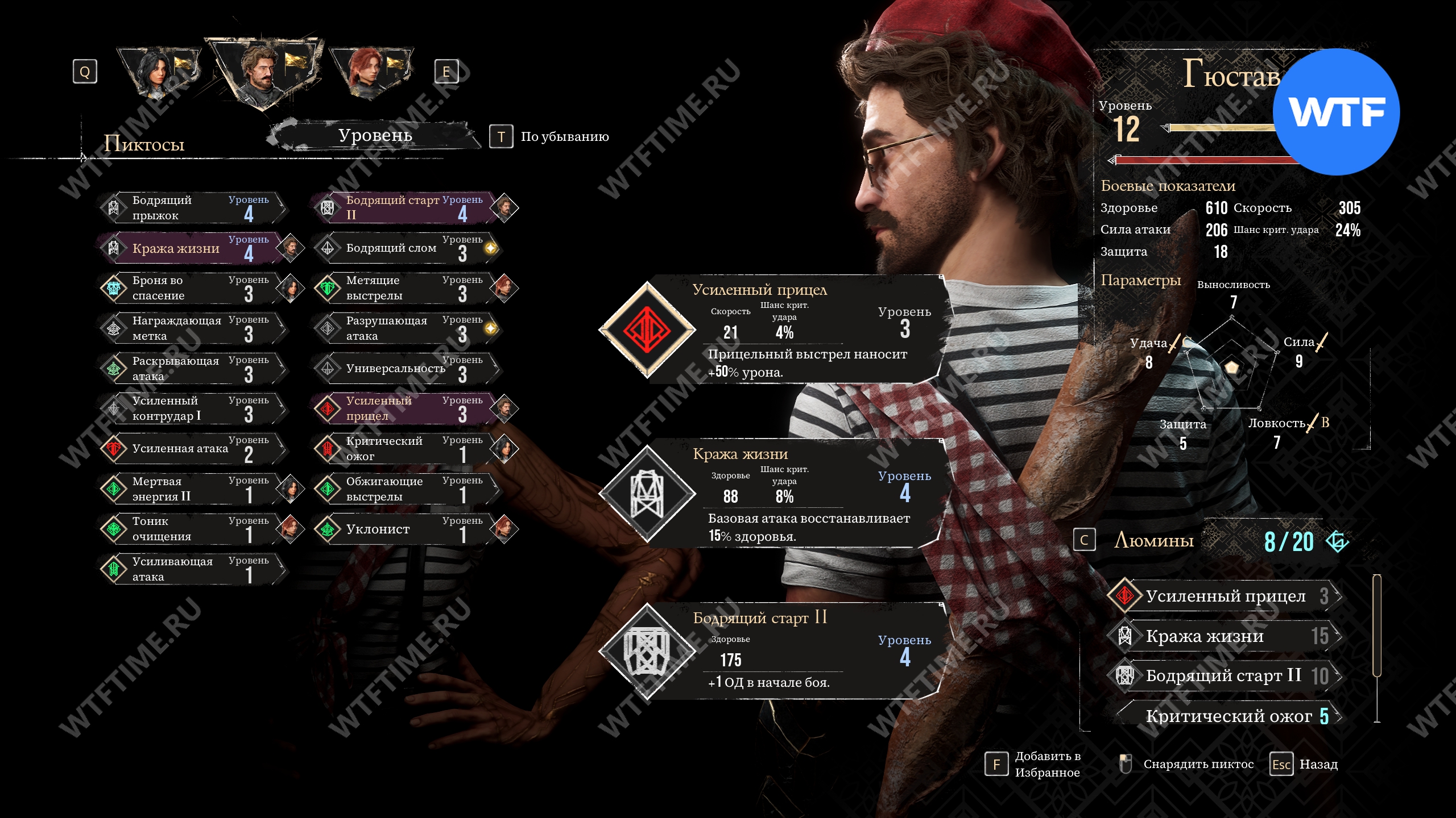 - Пиктос «В полную силу» (уровень 16, здоровье 876, защита 373) — наносимый урон возрастает на 25% при полном здоровье;