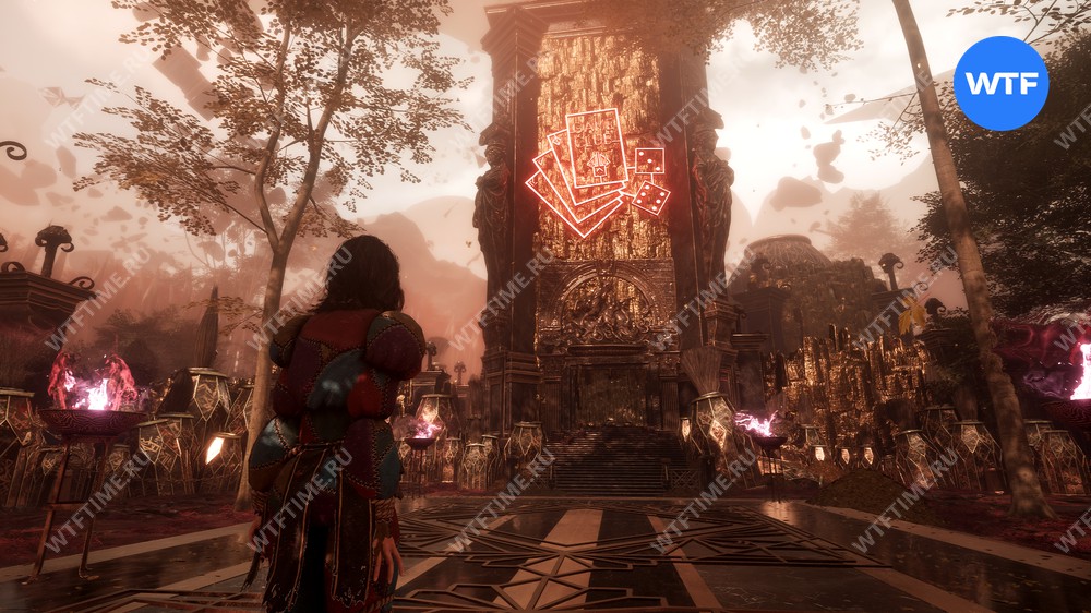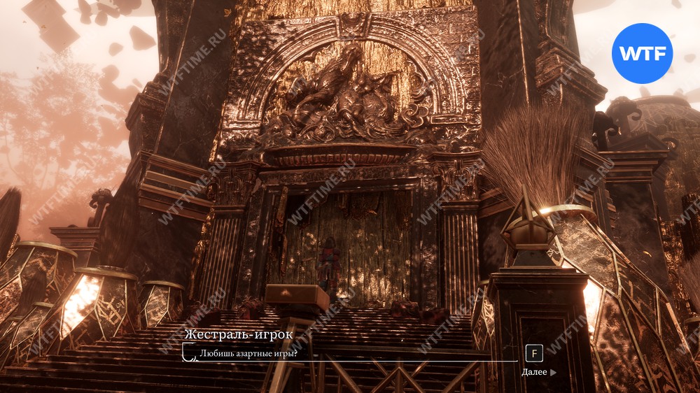 Это приведет вас прямо к местному казино, перед которым горит множество факелов. Подойдите ко входу и постучите в двери, чтобы поговорить с жестралем-игроком.