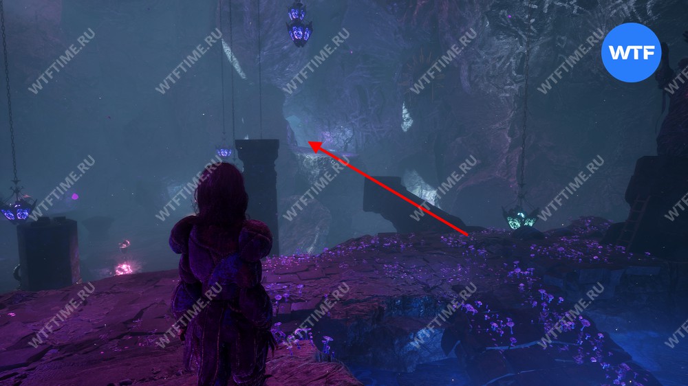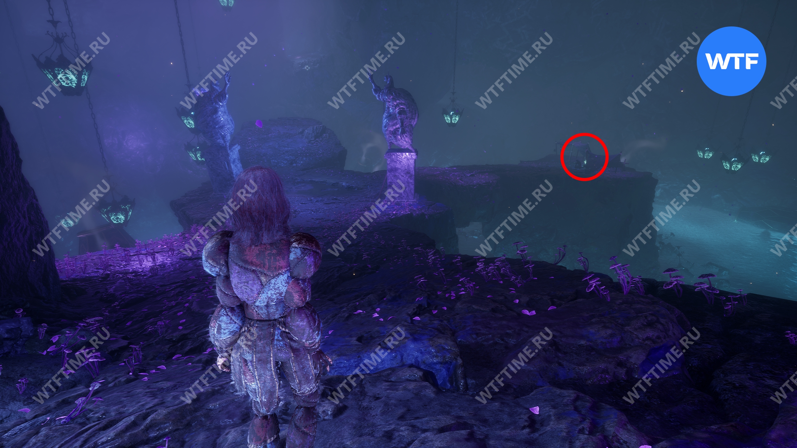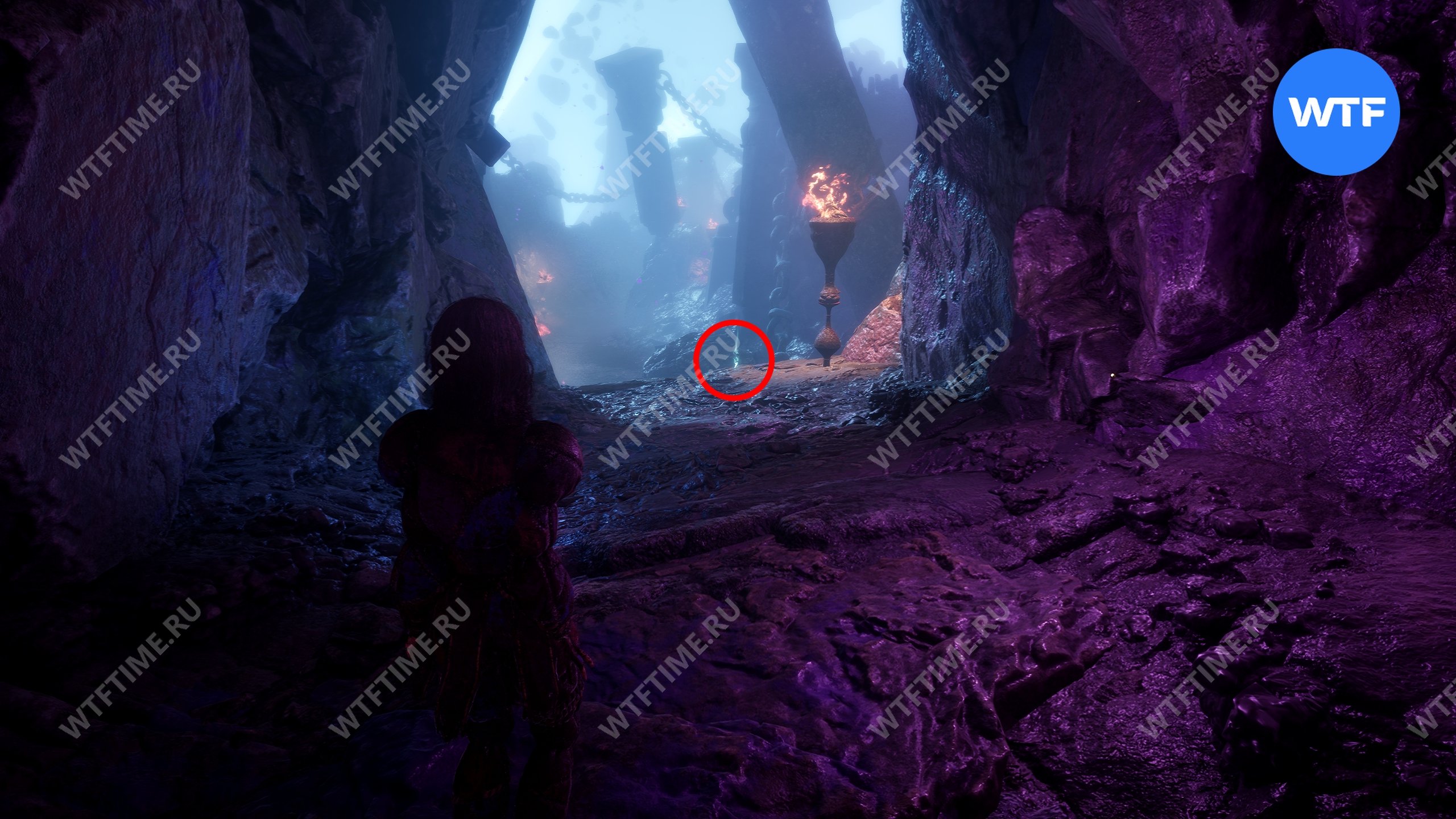 Вернитесь на мост, поверните налево и пройдите через следующую узкую пещеру. Выйдя из неё вдалеке вы увидите лестницу и несколько колонн. За самой левой колонной можно найти 1305 хромы.