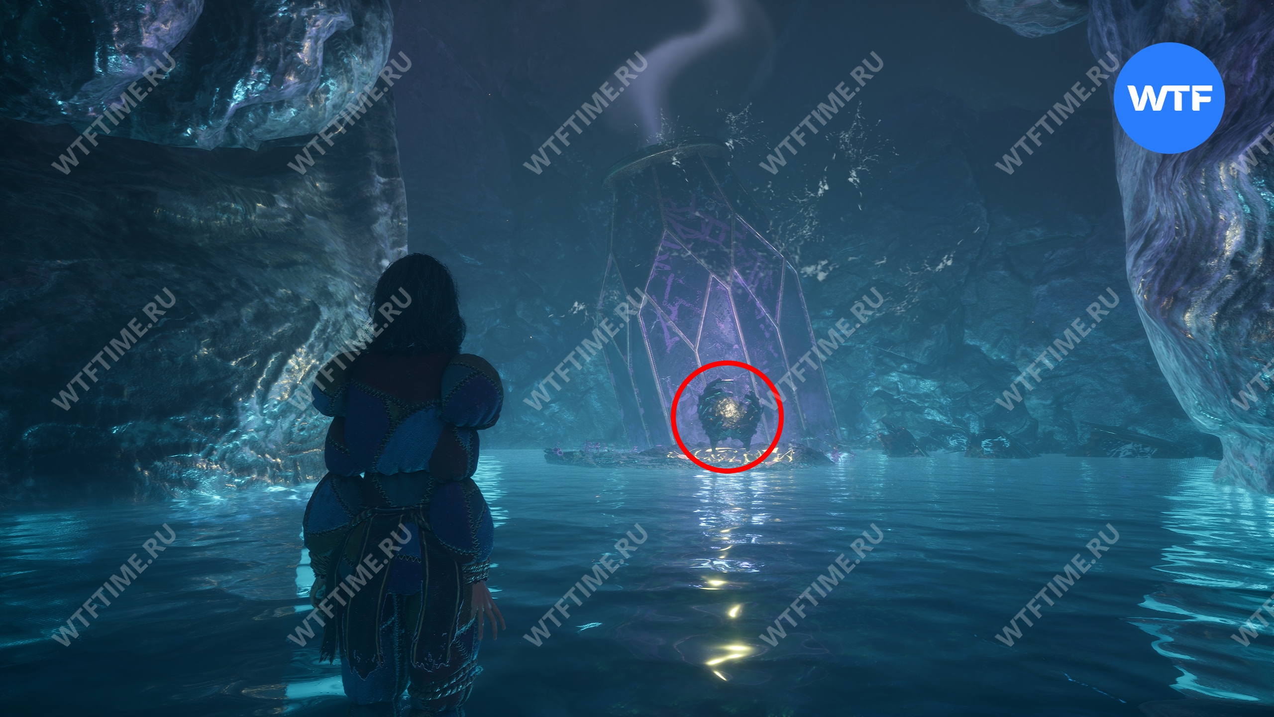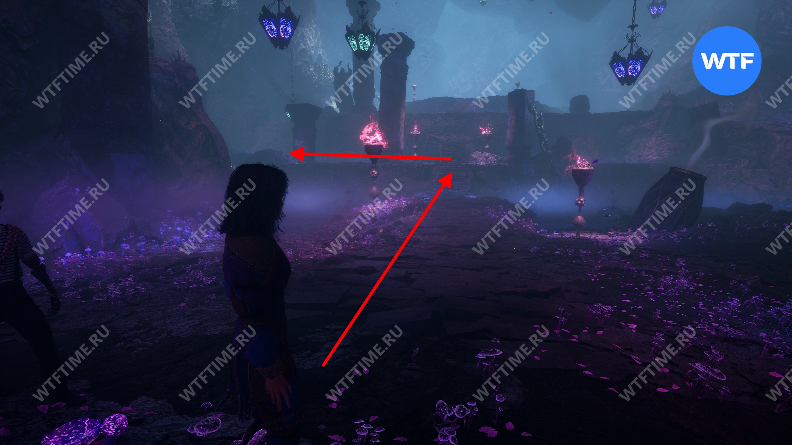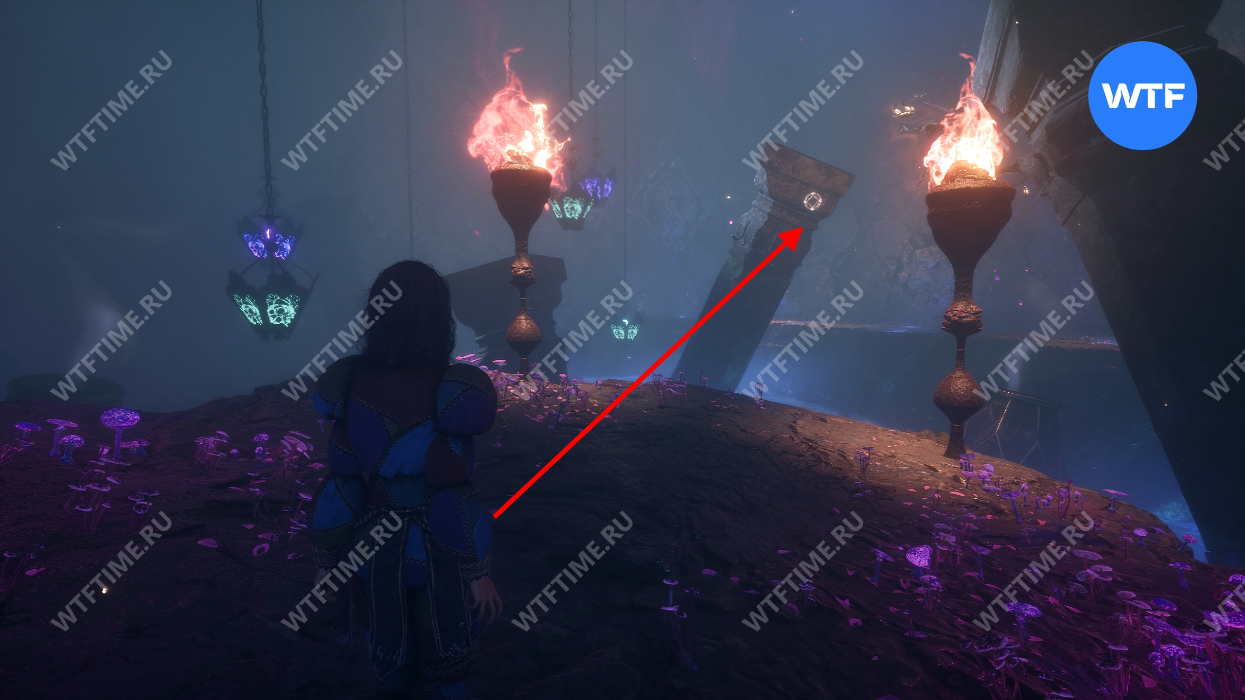 Вернитесь на мост, поверните налево и пройдите через следующую узкую пещеру. Выйдя из неё вдалеке вы увидите лестницу и несколько колонн. За самой левой колонной можно найти 1305 хромы.