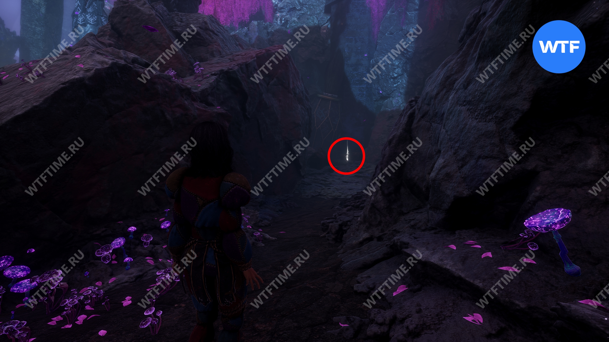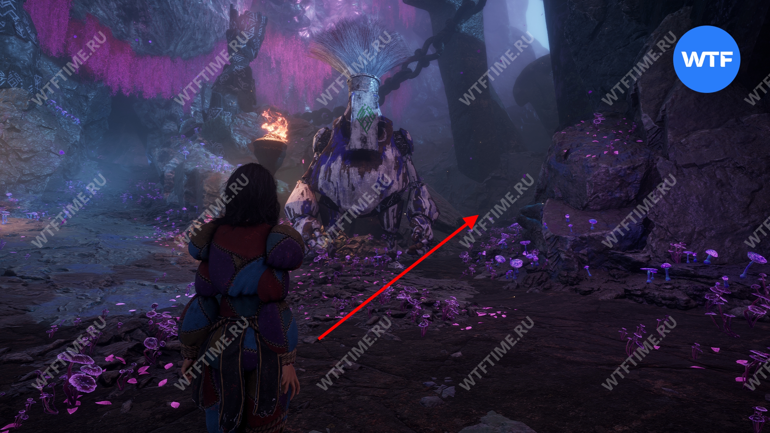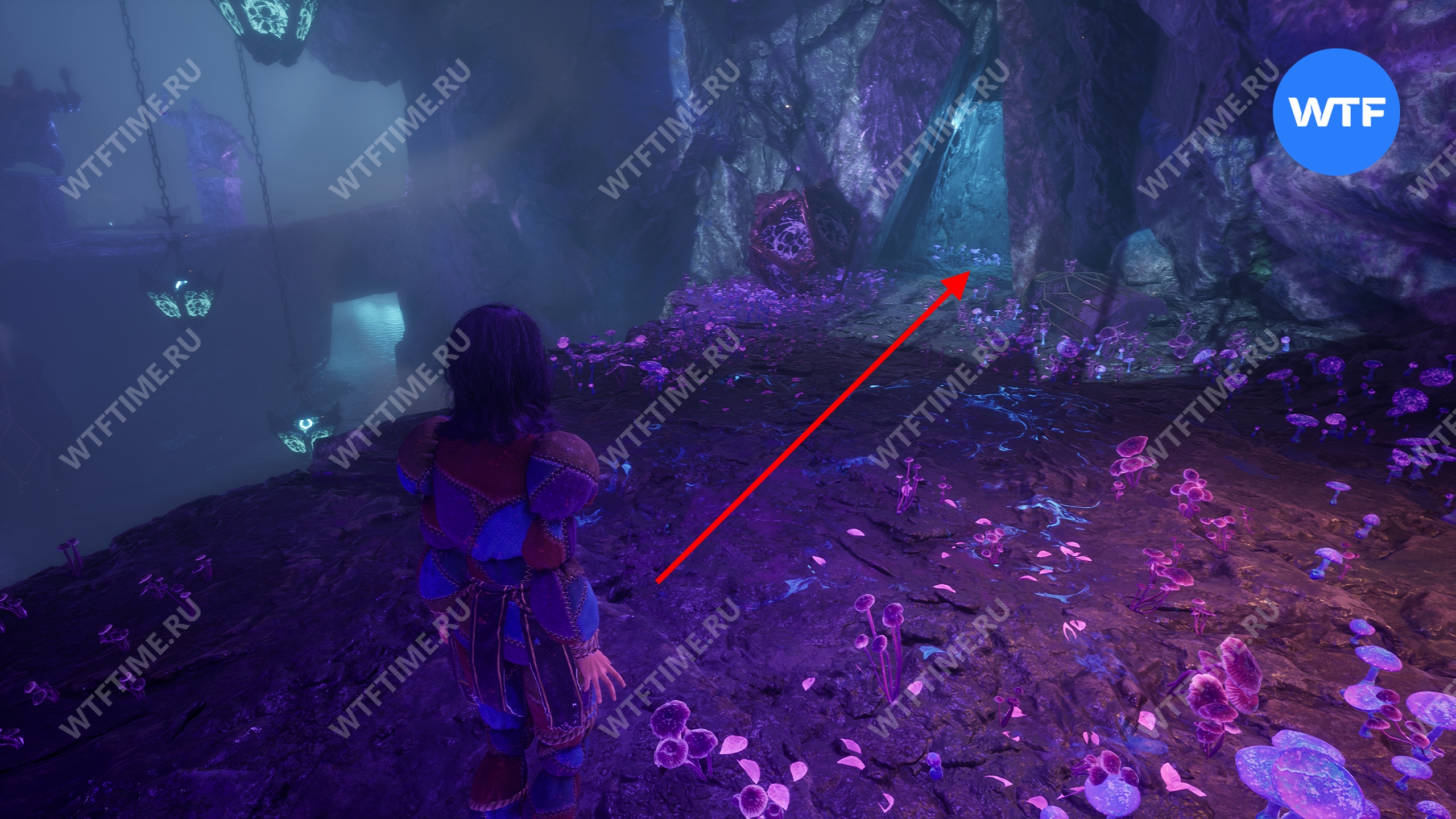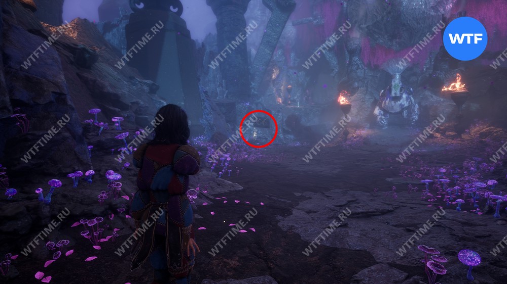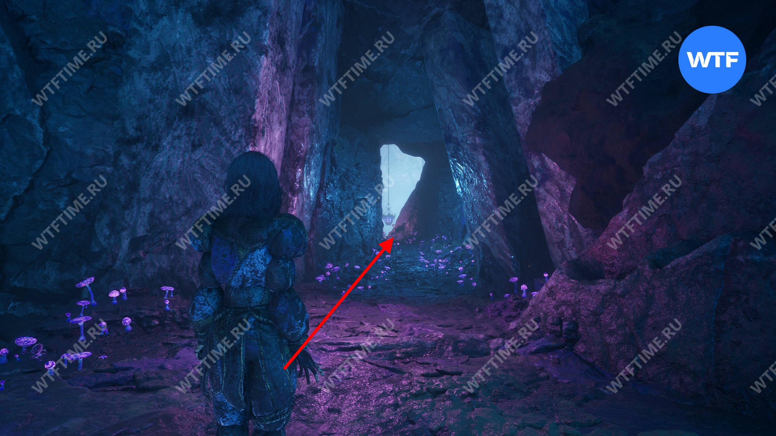 После боя с мимом не спешите подниматься обратно на мост. Вместо этого осмотрите правую часть пещеры и подберите там странный гриб. Это квестовый предмет, который нужно отдать Каратому в Селении жестралей.