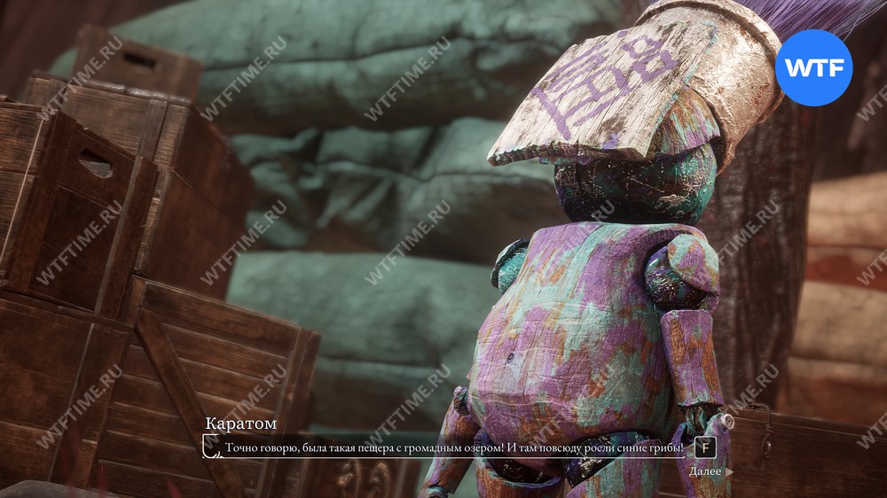 Каратом вспомнит, что видел нужные вам синие грибы в пещере с громадным озером. Эту пещеру вам и предстоит отыскать.