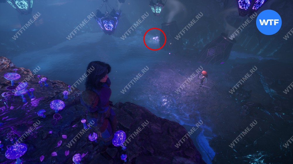 Пройдите через узкую пещеру и после выхода вы окажетесь на каменном мосту, вокруг которого горят цветные фонари. С этого моста спрыгните направо и вниз, а затем идите к дальней правой стене пещеры, чтобы забрать странный синий гриб.