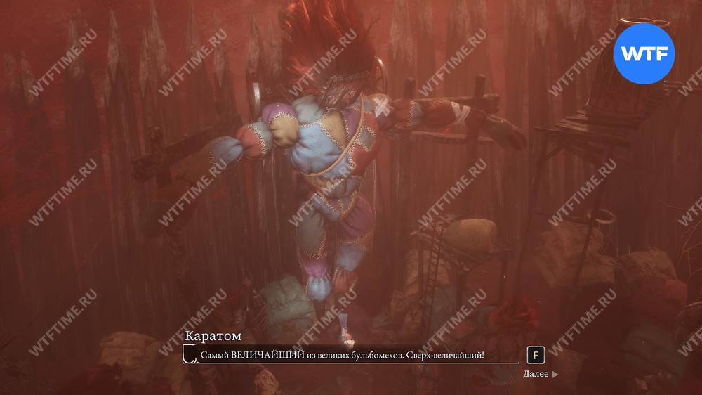 Прямо под ним будет стоять Каратом — маленький жестраль, который провожал вас в Селение жестралей ранее по сюжету. Он представит вам свое творение — самого величайшего из великих бульбомехов и напомнит, что вы обещали помочь ему с разработкой.