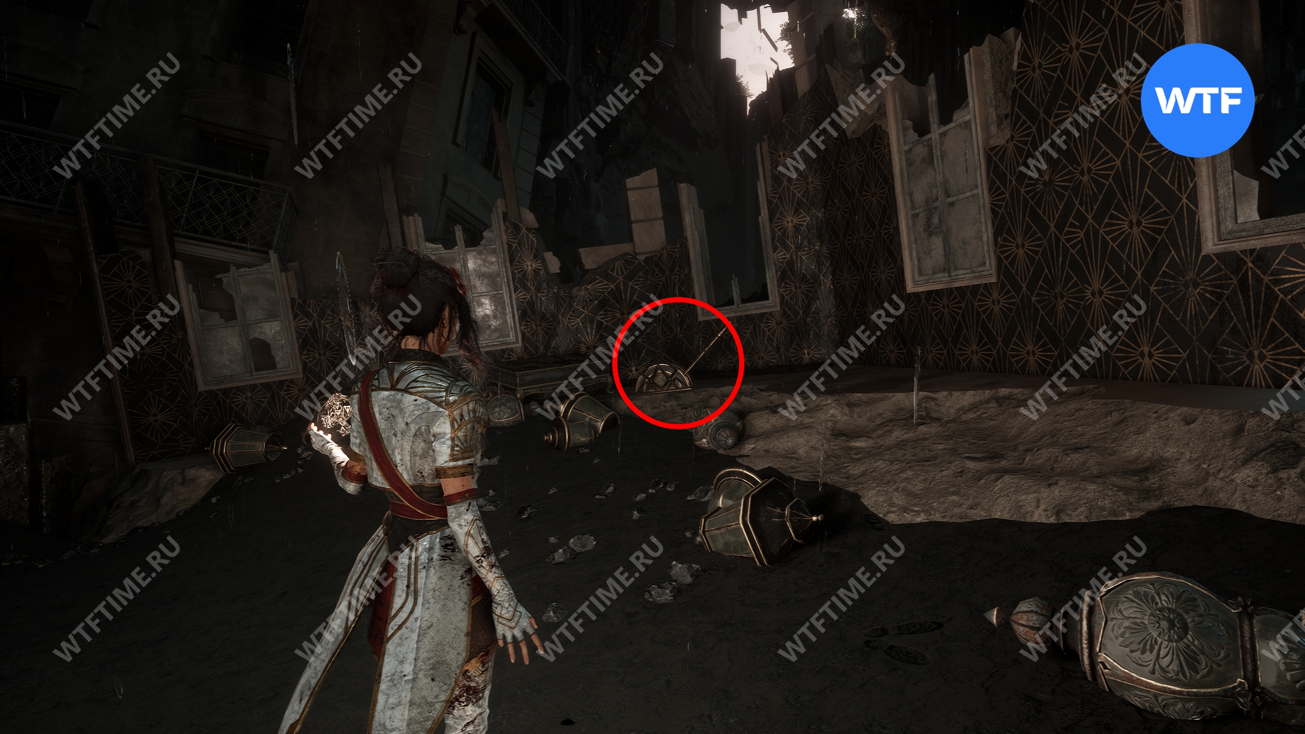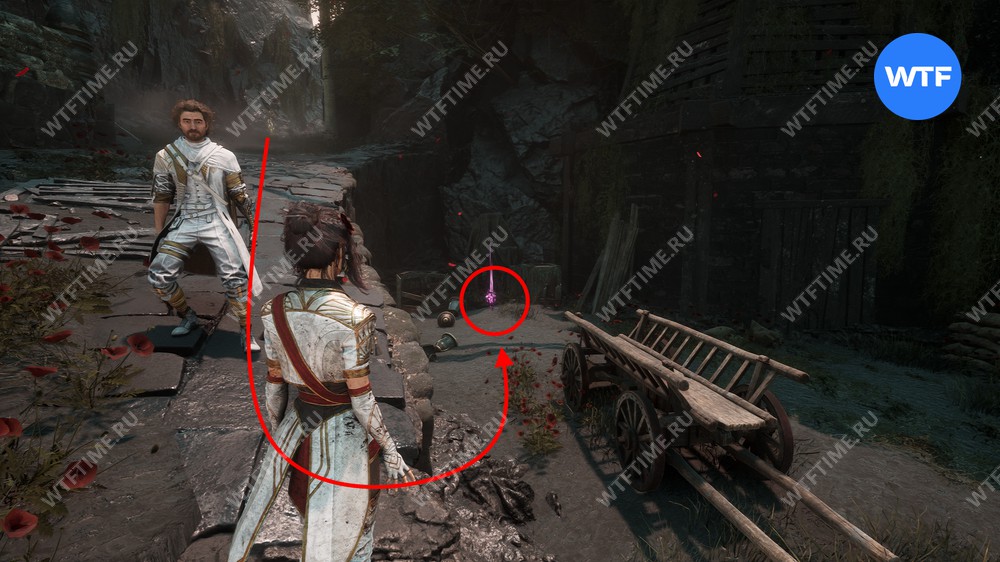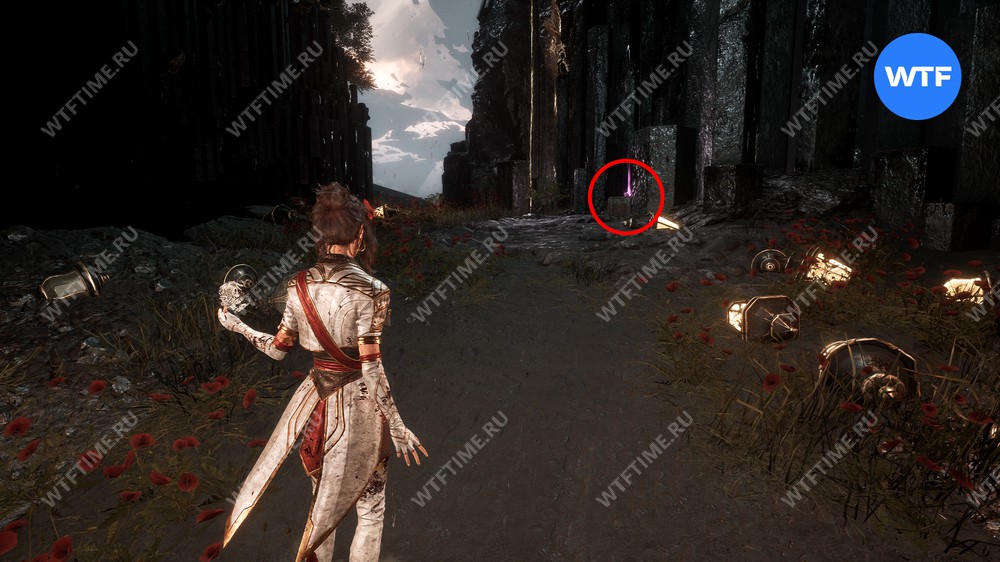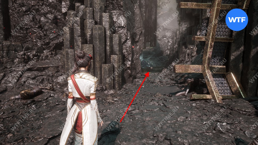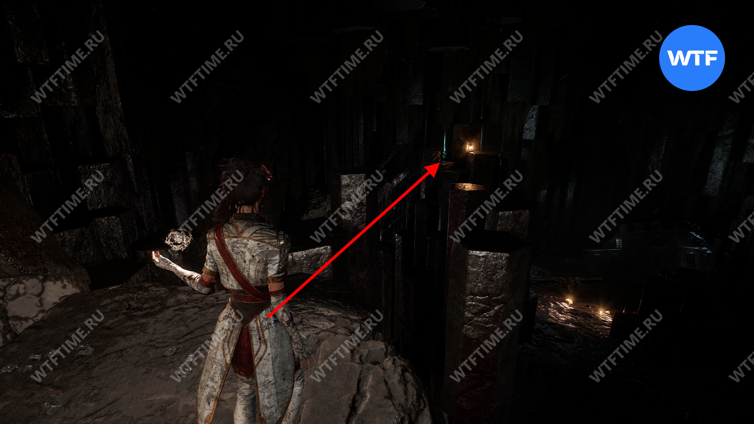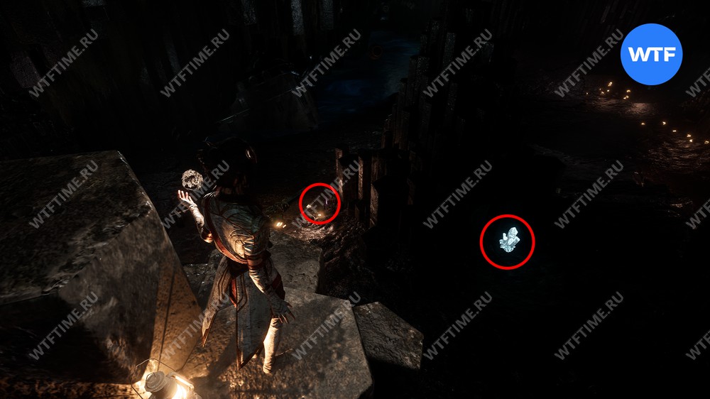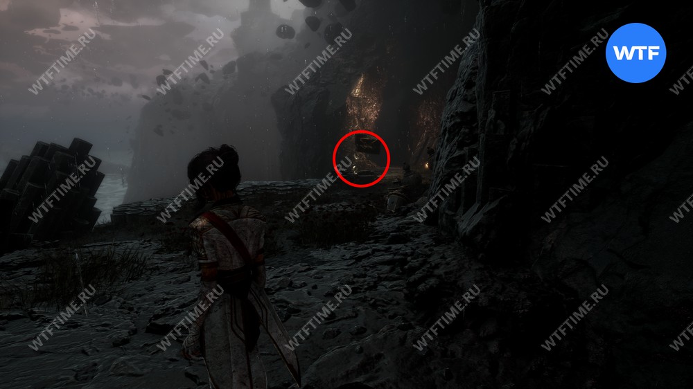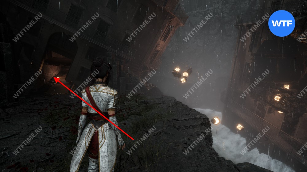 После этого слева от вас будет здание с запертой деревянной дверью. От двери идите направо и воспользуйтесь рычагом у стены, чтобы её открыть. Затем поднимитесь на второй этаж дома и заберите 3160 хромы.