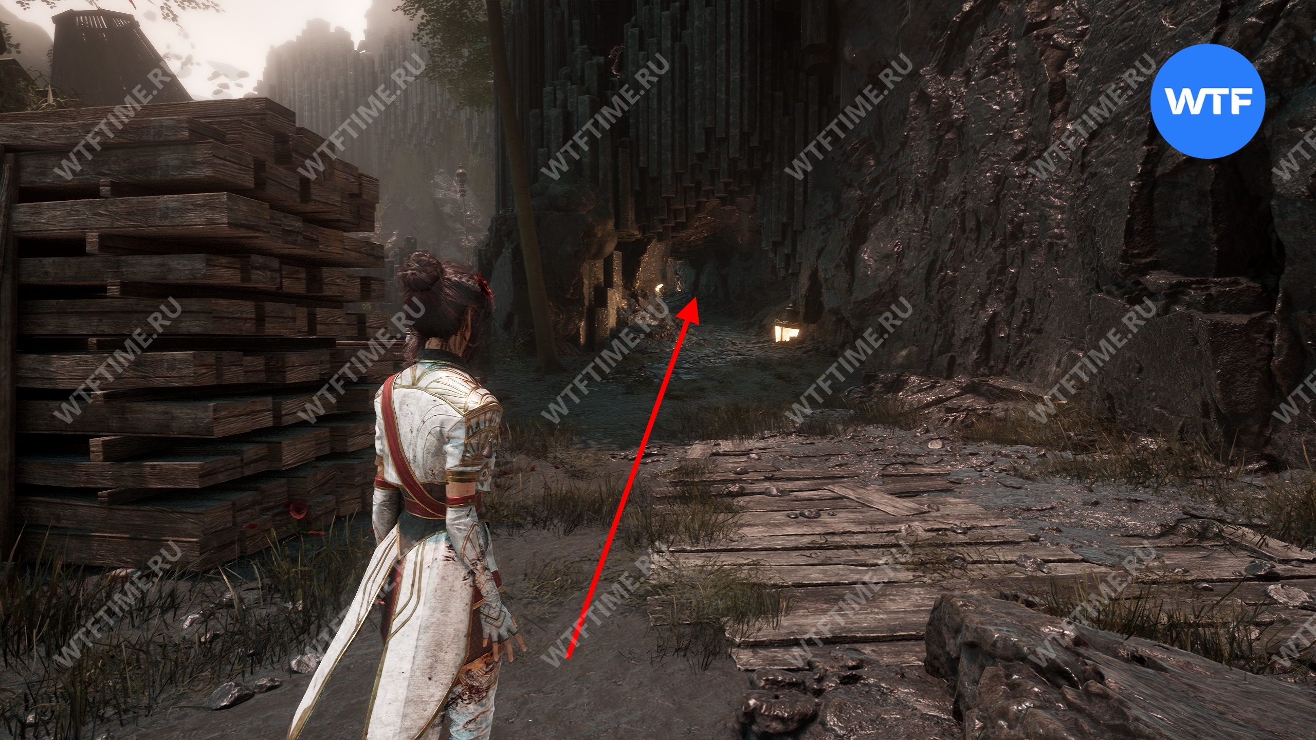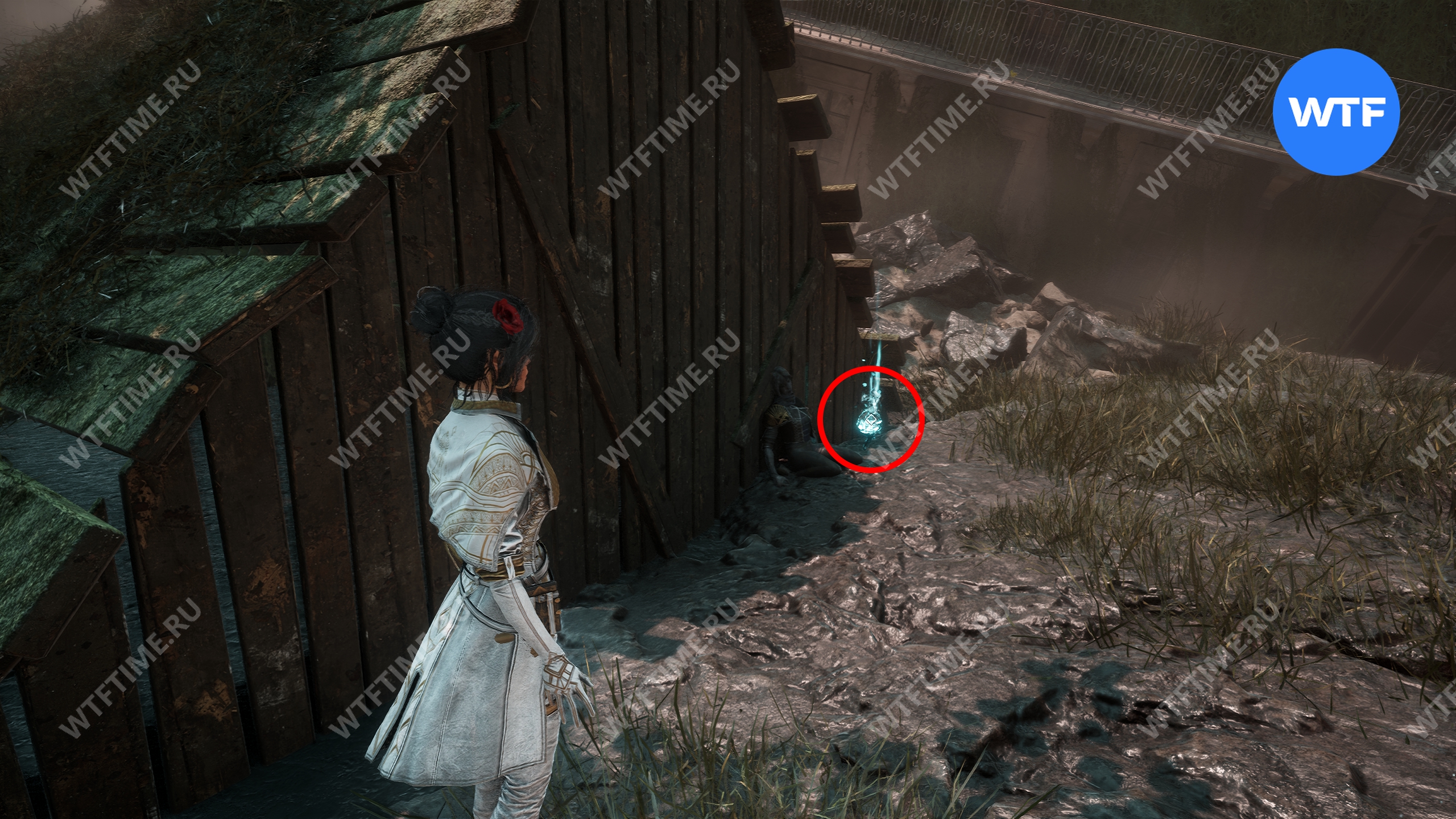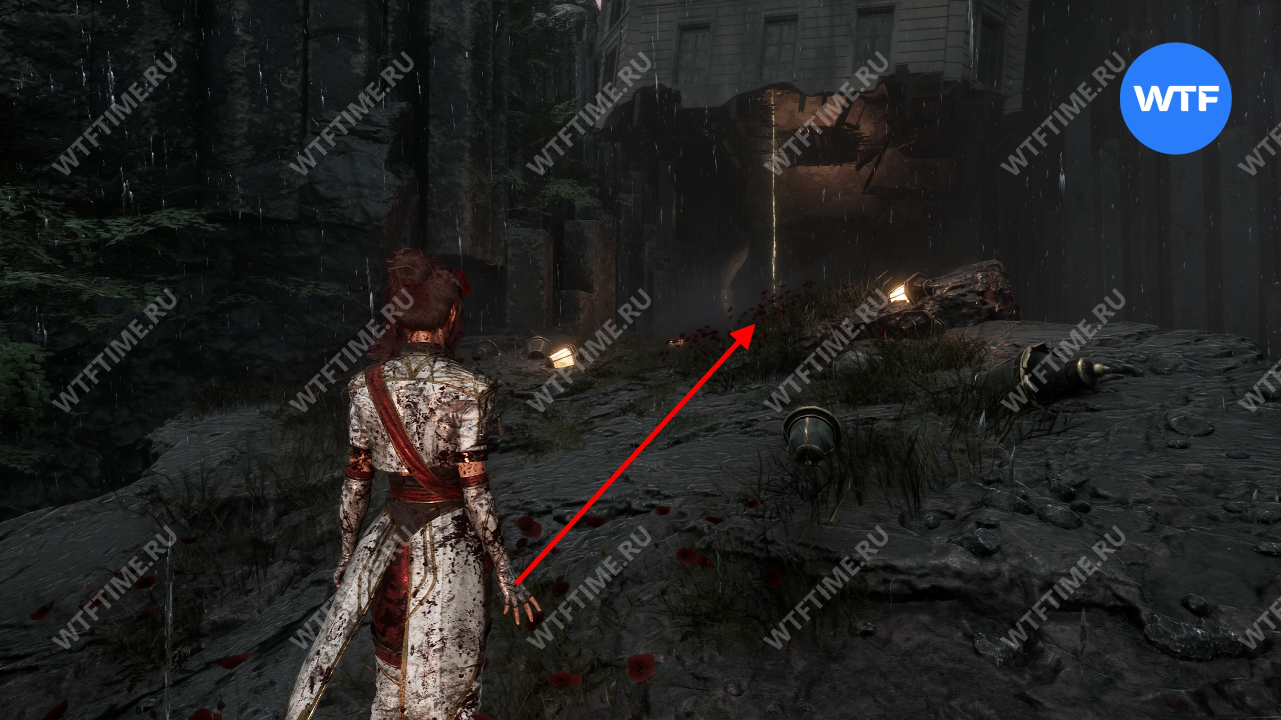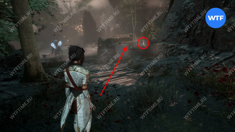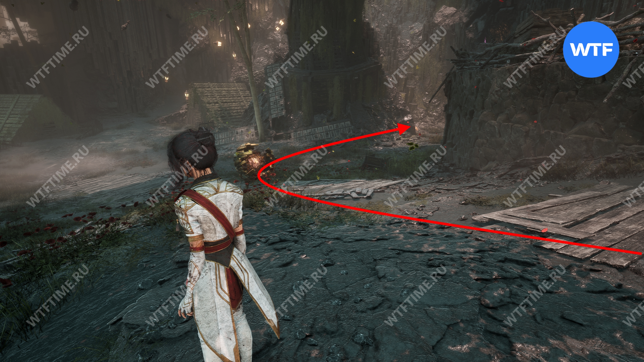 После этого слева от вас будет здание с запертой деревянной дверью. От двери идите направо и воспользуйтесь рычагом у стены, чтобы её открыть. Затем поднимитесь на второй этаж дома и заберите 3160 хромы.