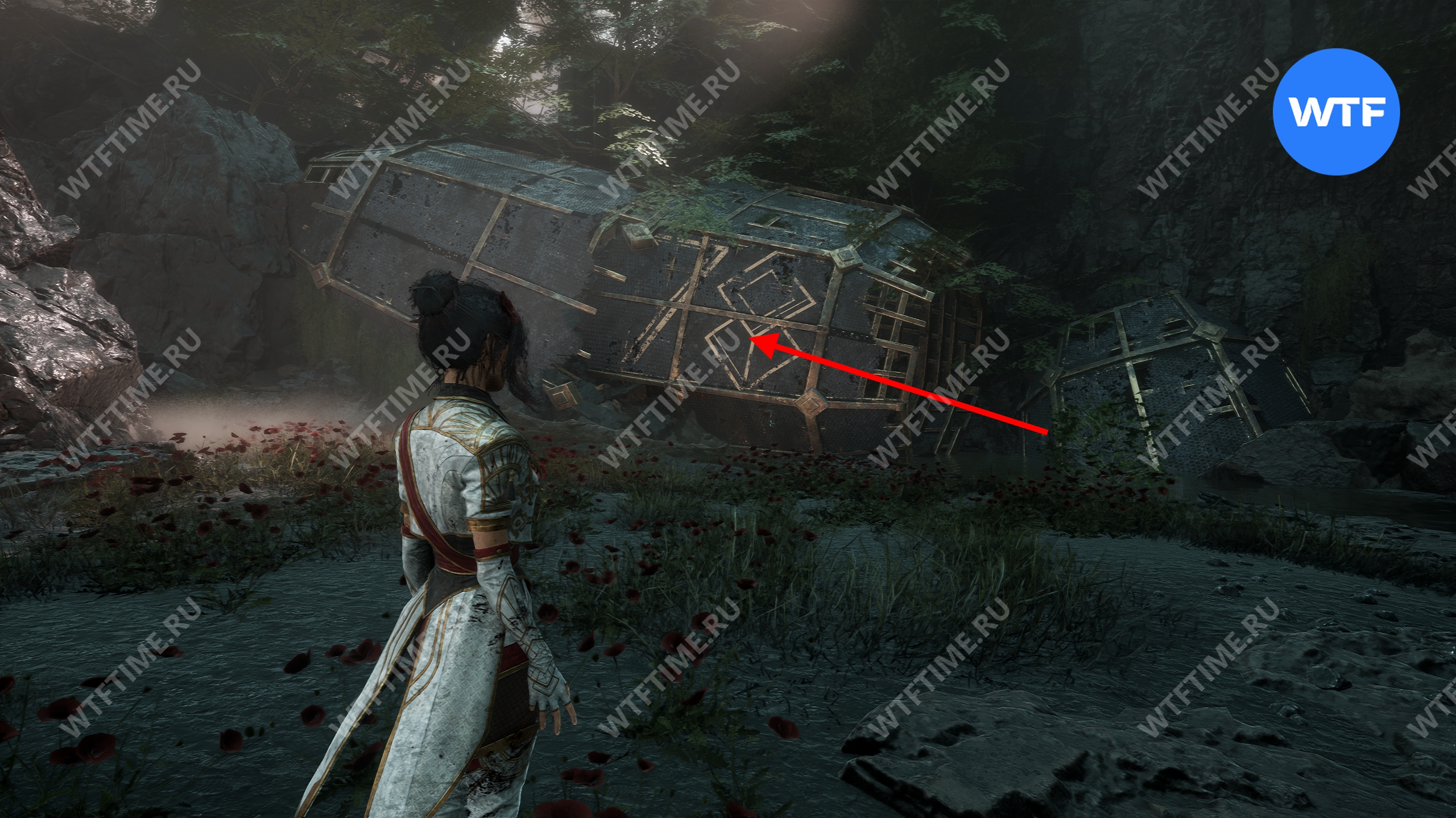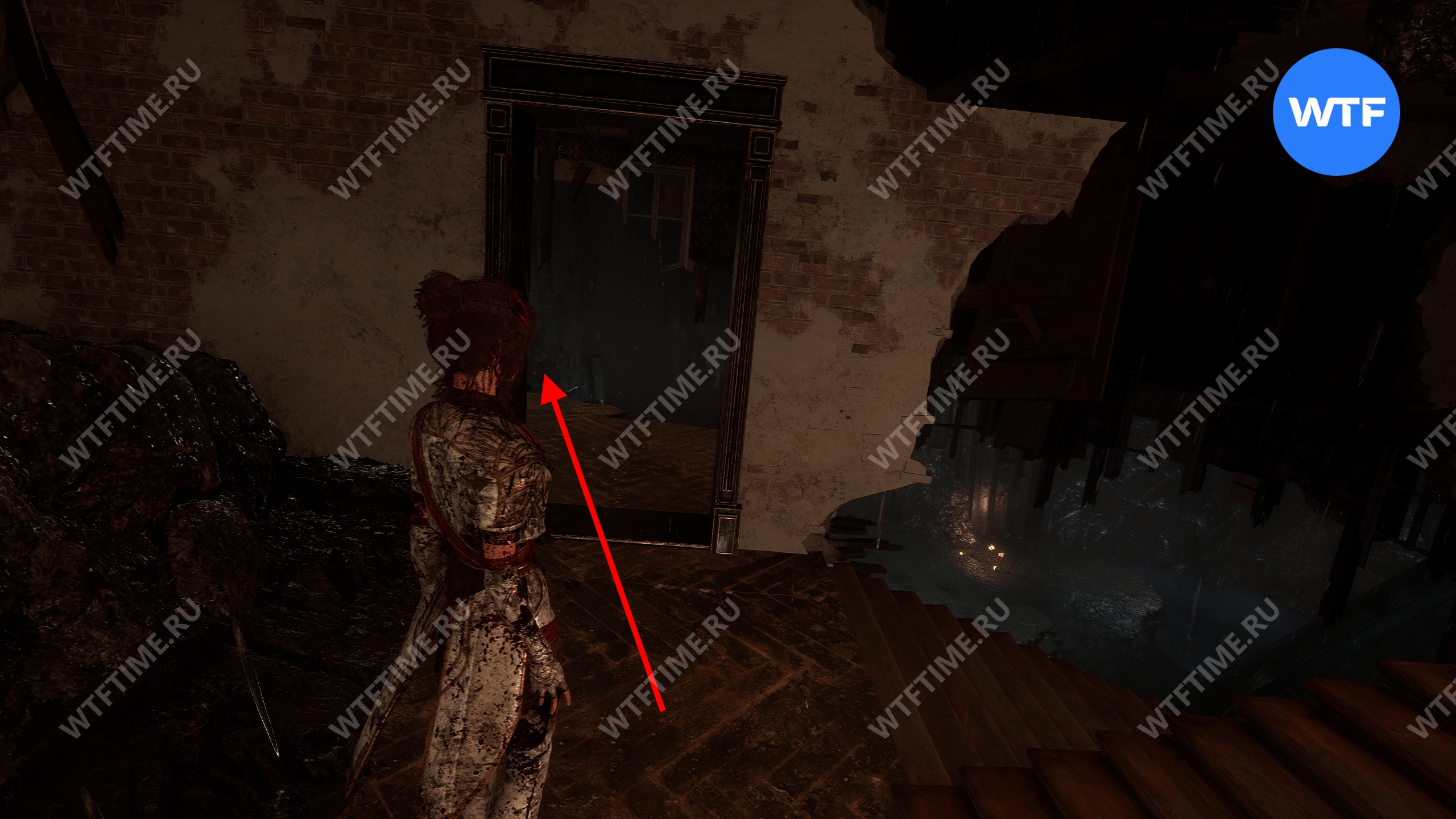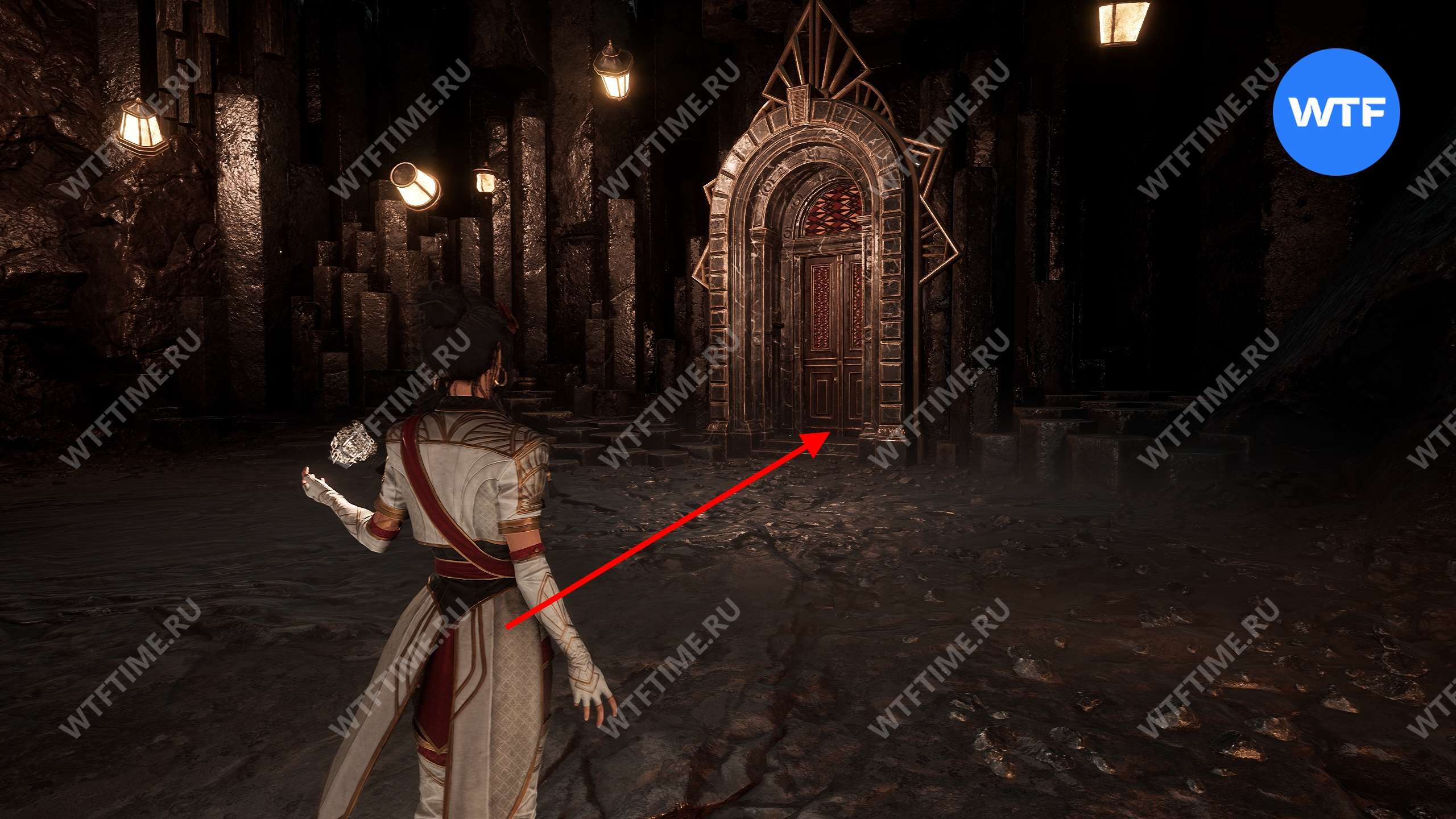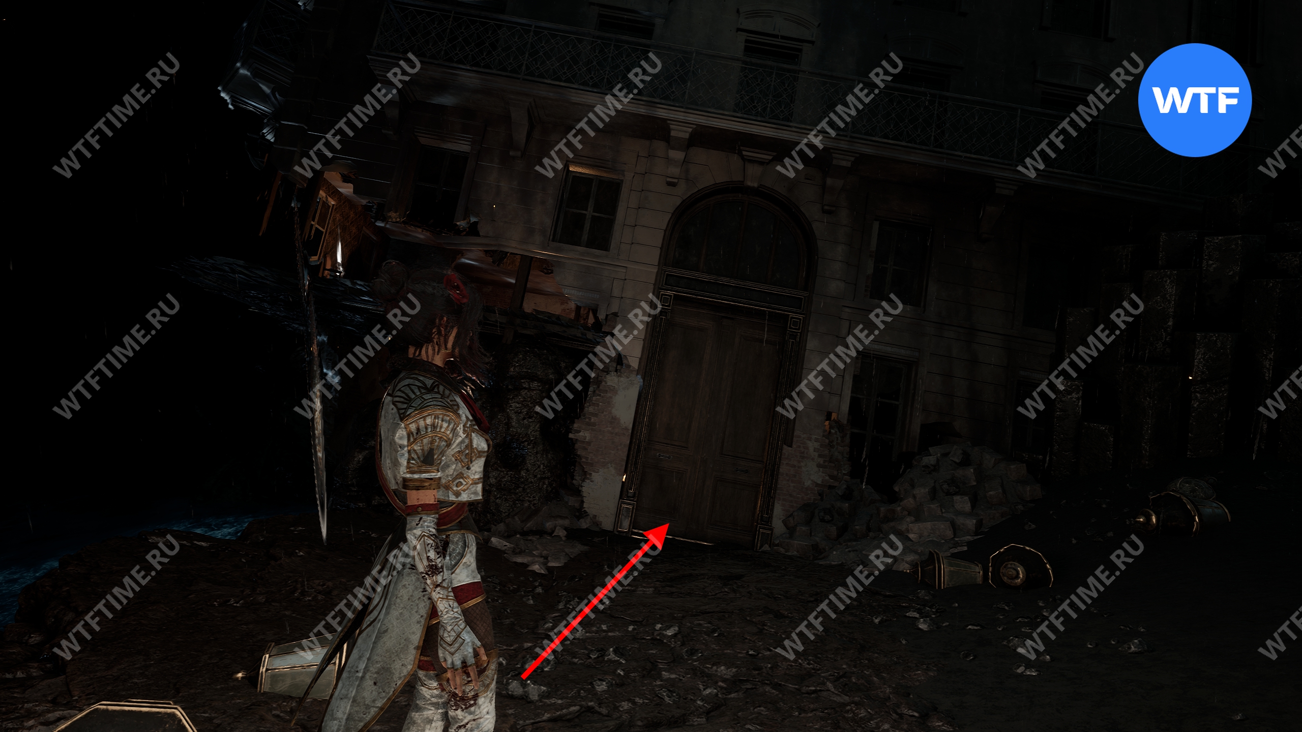 После этого слева от вас будет здание с запертой деревянной дверью. От двери идите направо и воспользуйтесь рычагом у стены, чтобы её открыть. Затем поднимитесь на второй этаж дома и заберите 3160 хромы.