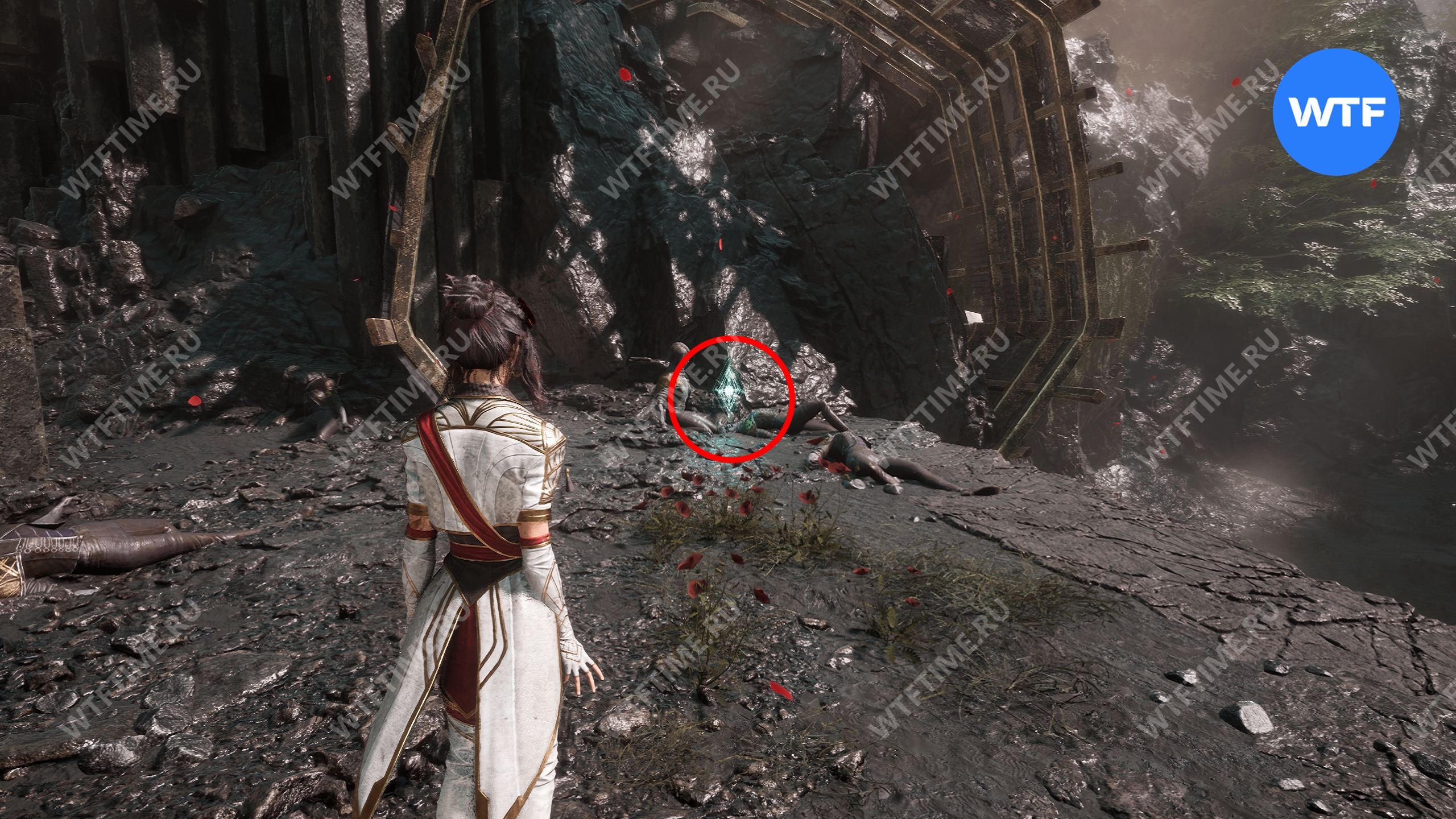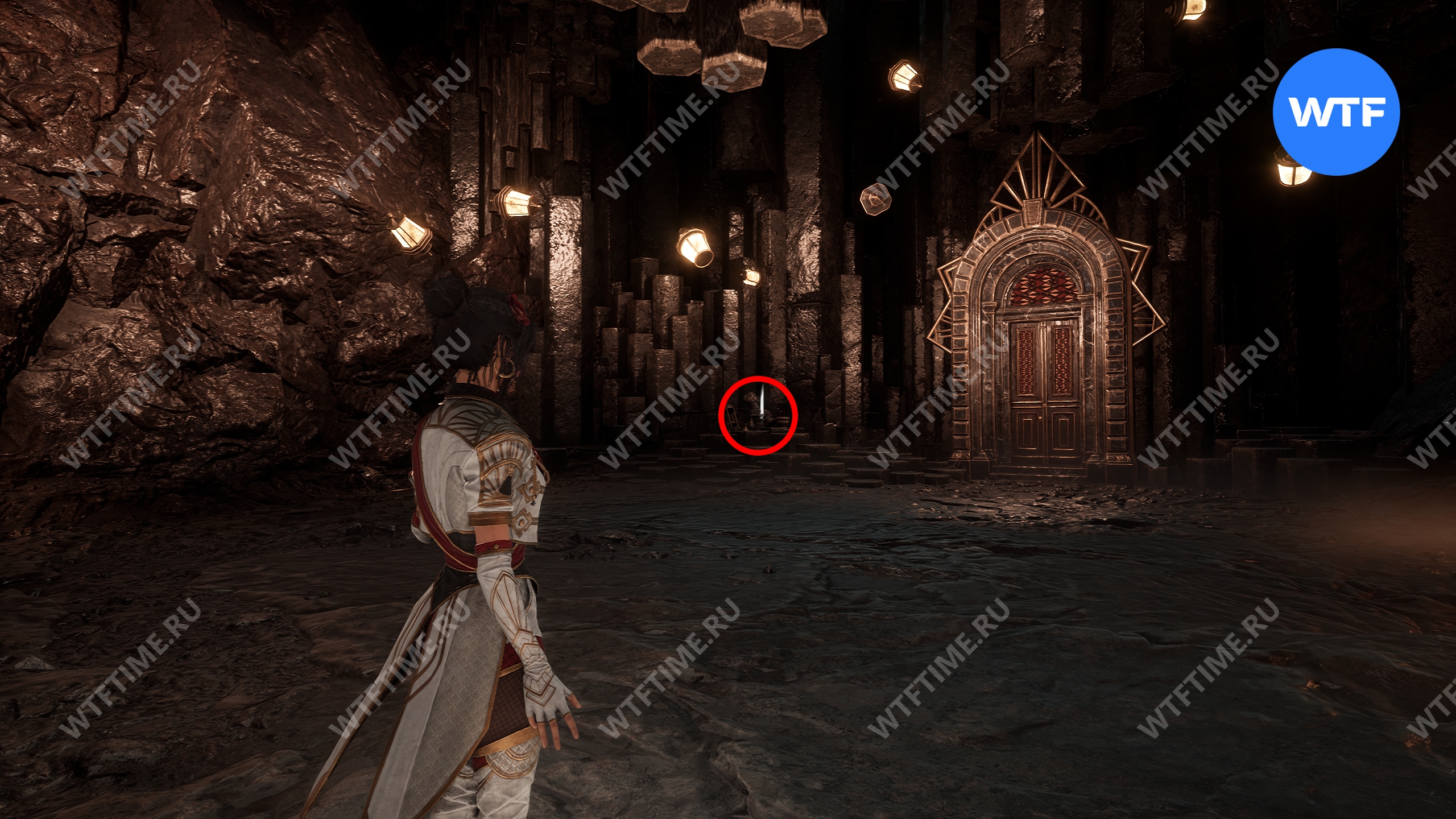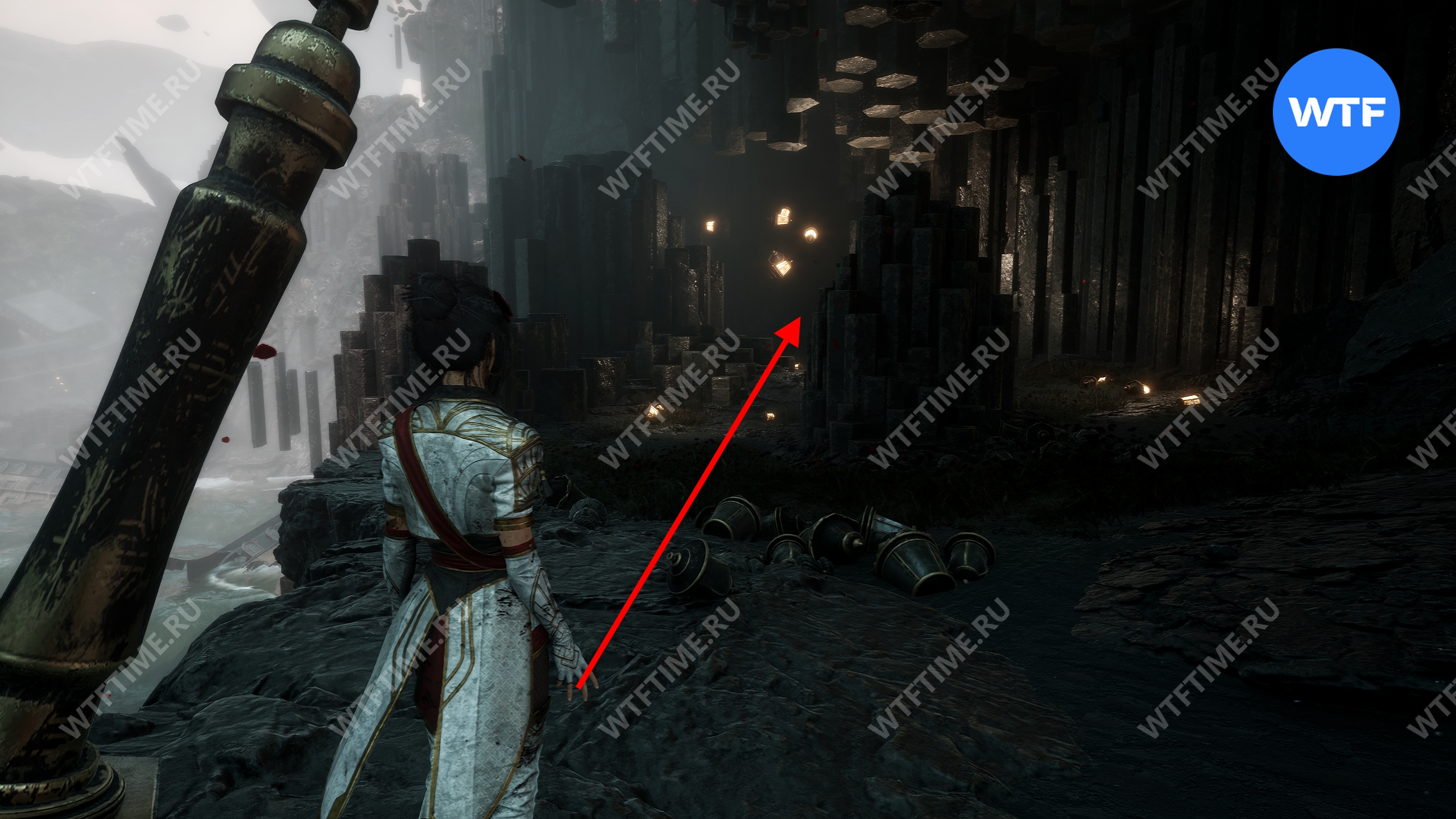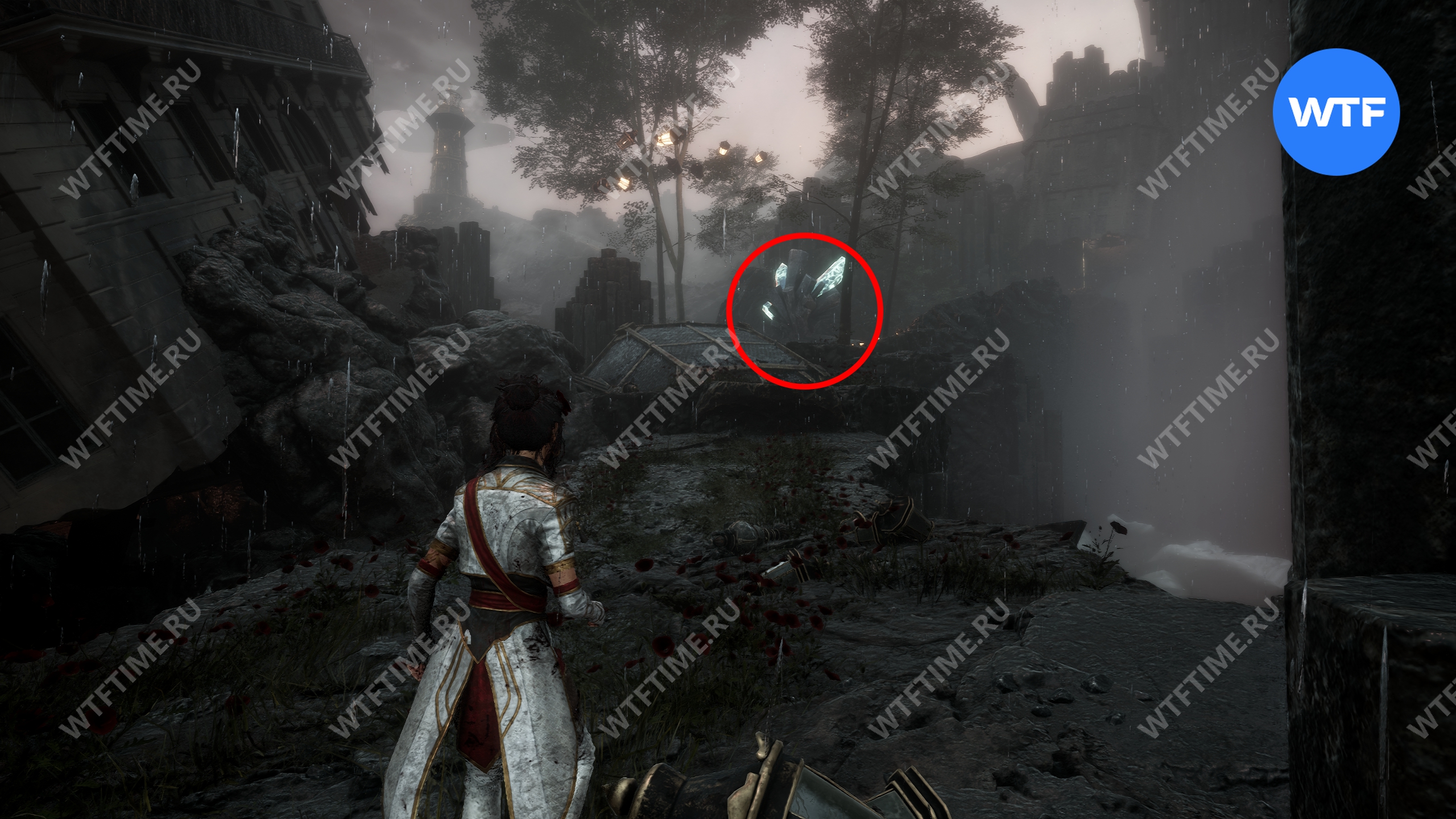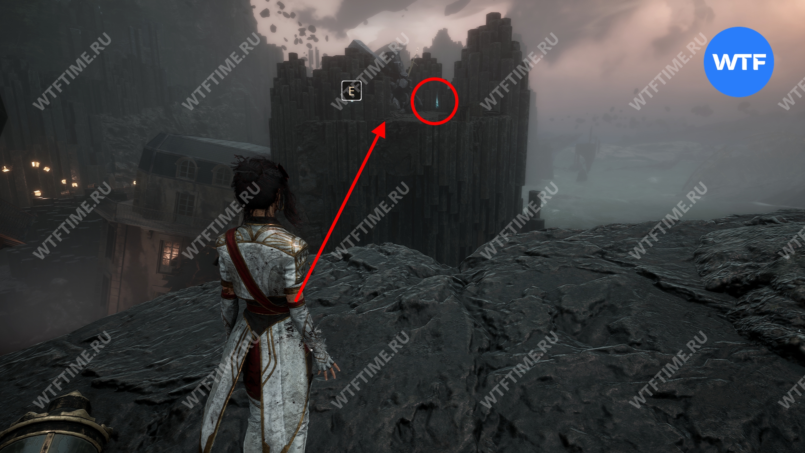 После этого слева от вас будет здание с запертой деревянной дверью. От двери идите направо и воспользуйтесь рычагом у стены, чтобы её открыть. Затем поднимитесь на второй этаж дома и заберите 3160 хромы.