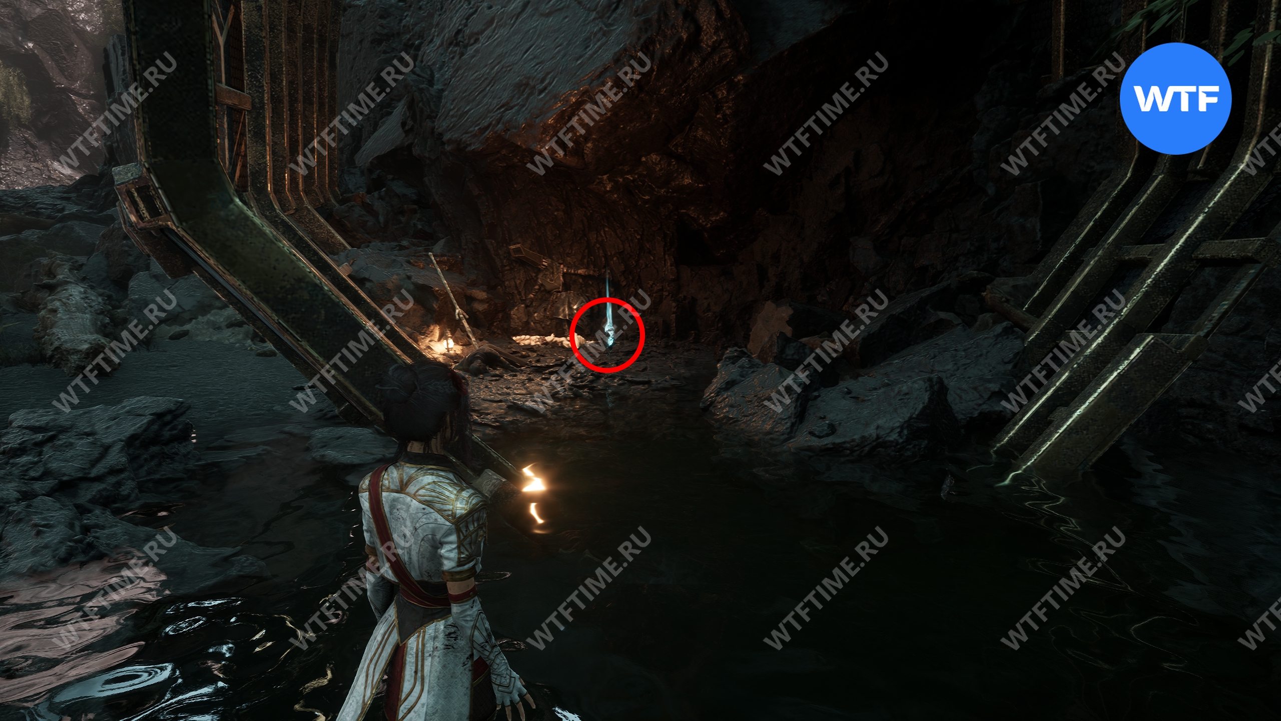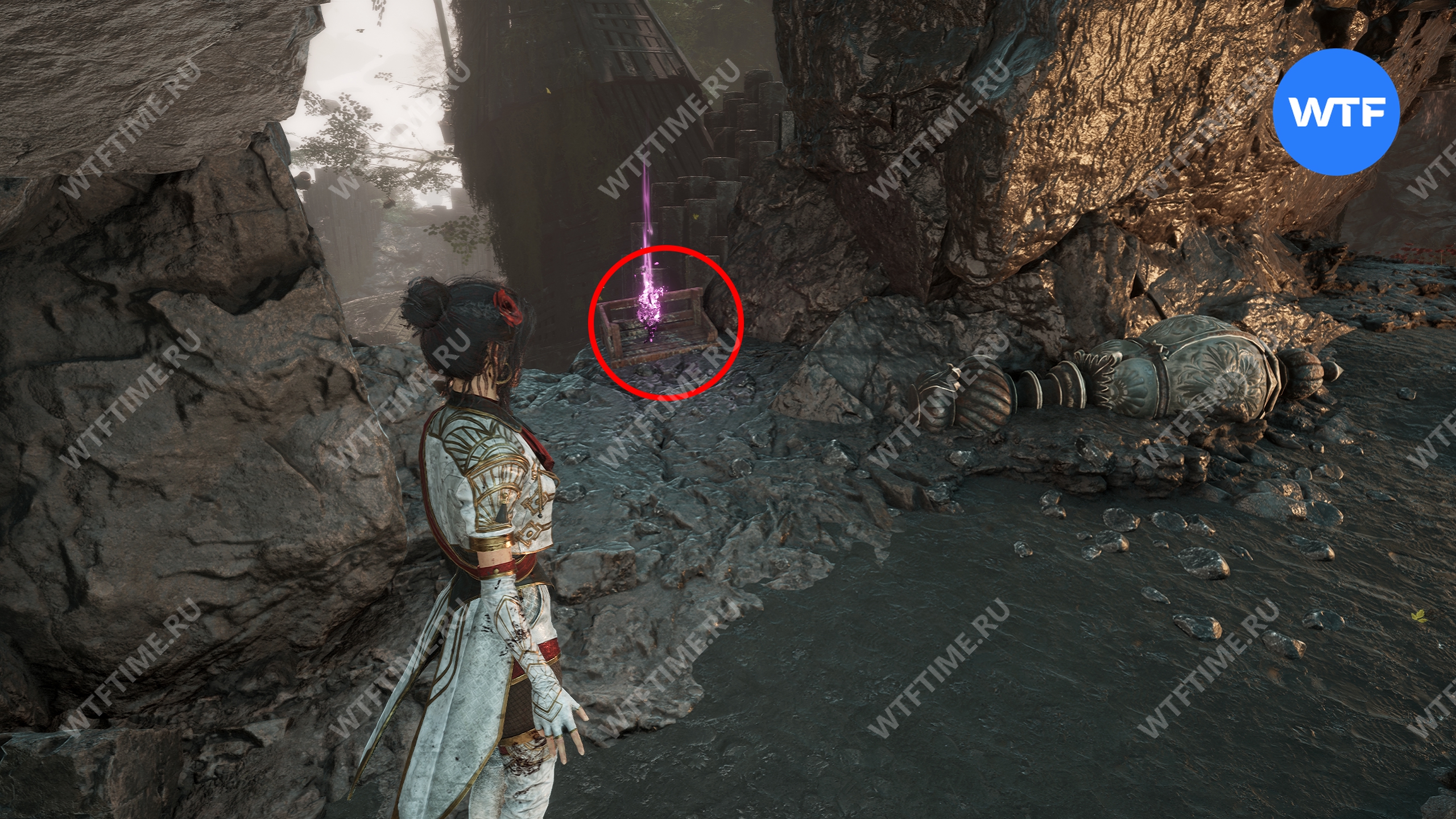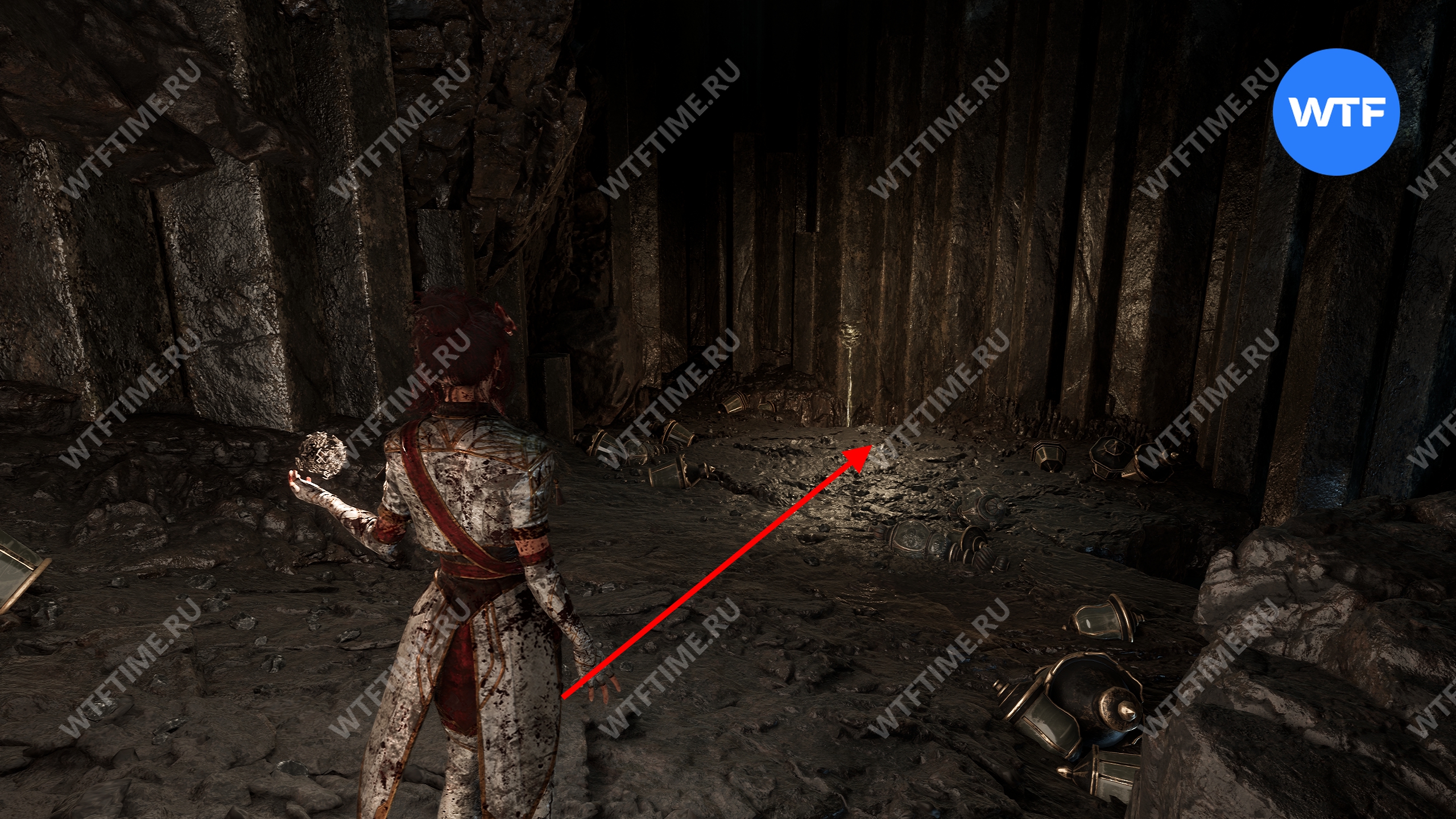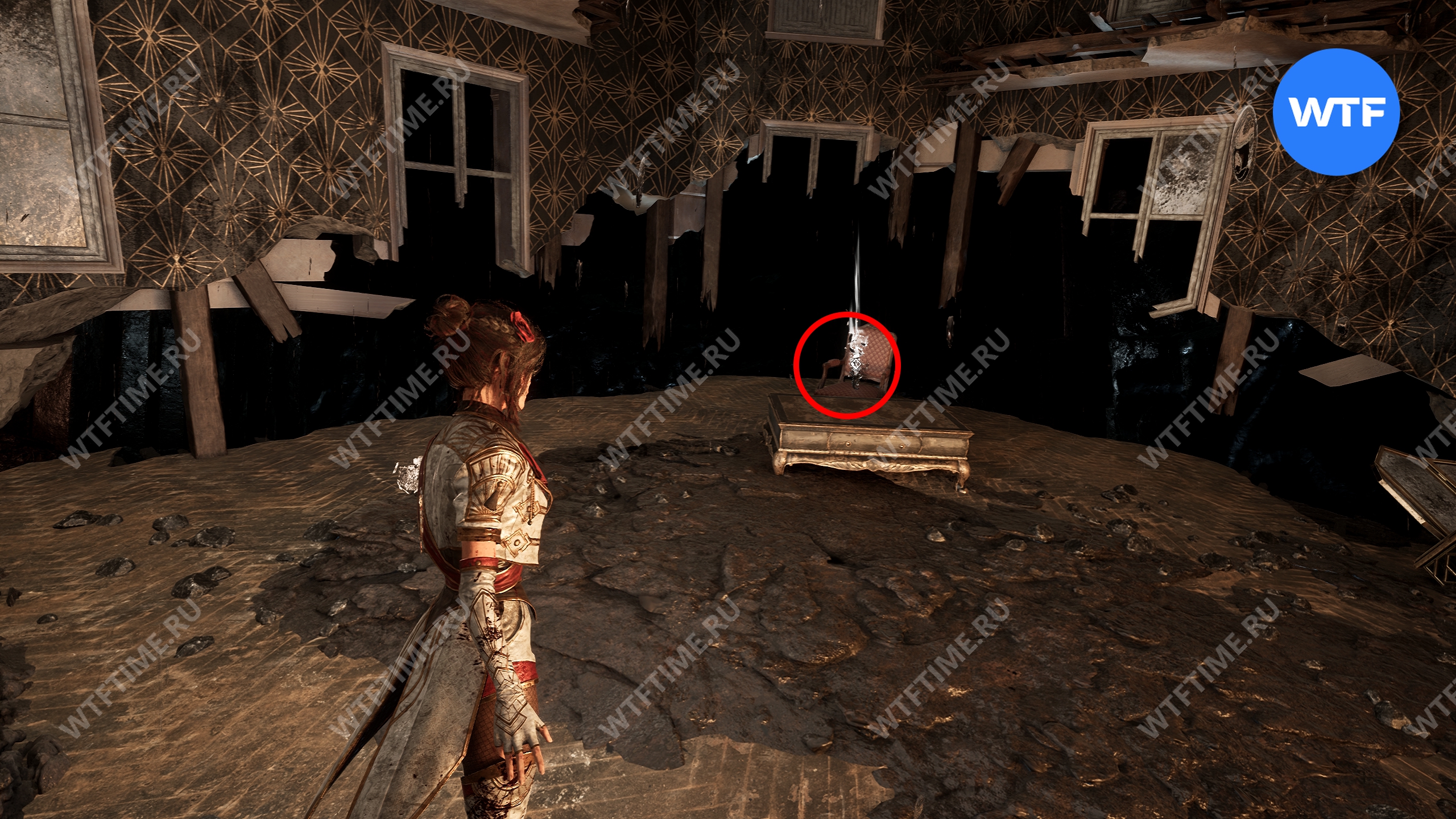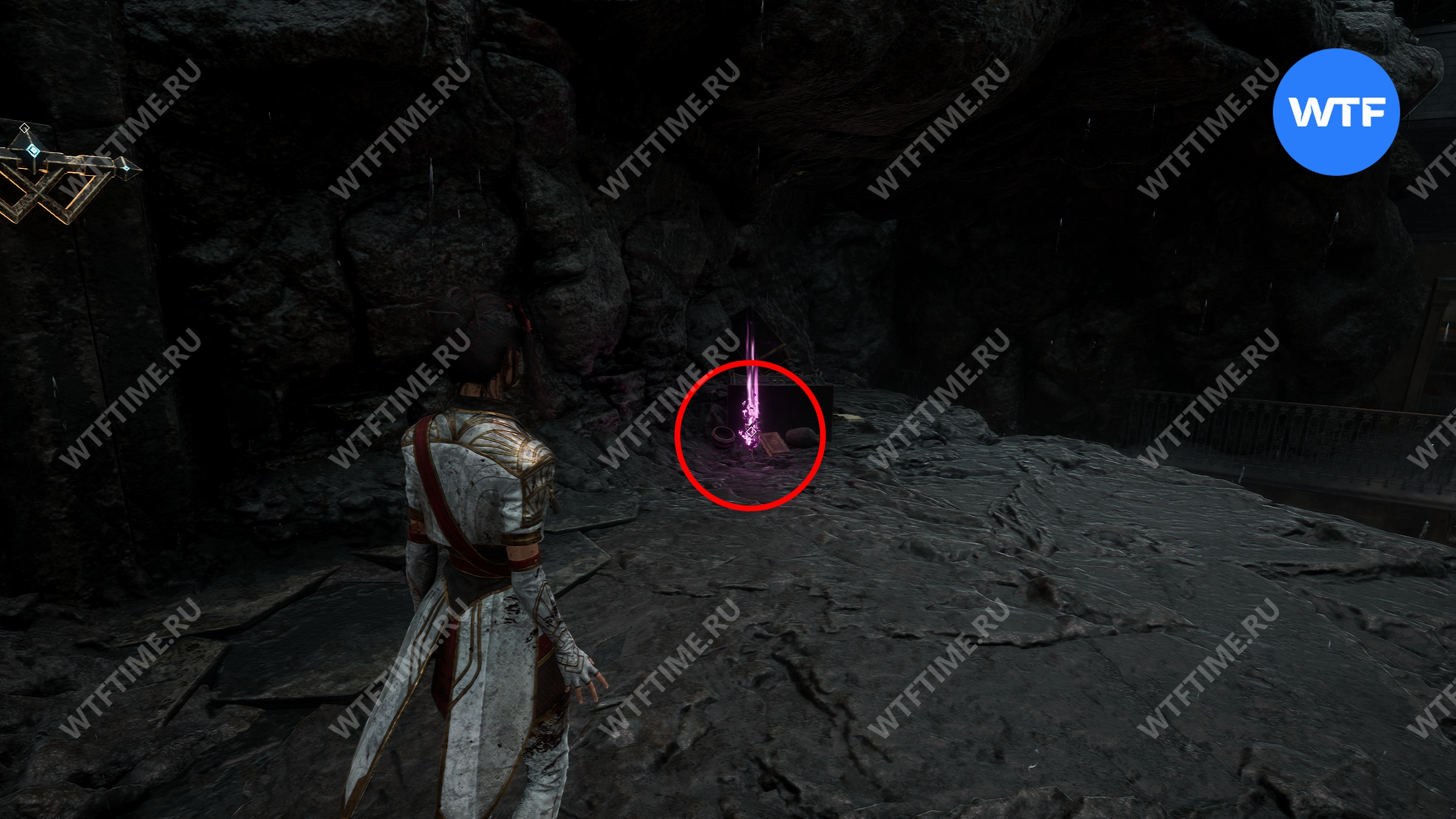 После этого слева от вас будет здание с запертой деревянной дверью. От двери идите направо и воспользуйтесь рычагом у стены, чтобы её открыть. Затем поднимитесь на второй этаж дома и заберите 3160 хромы.