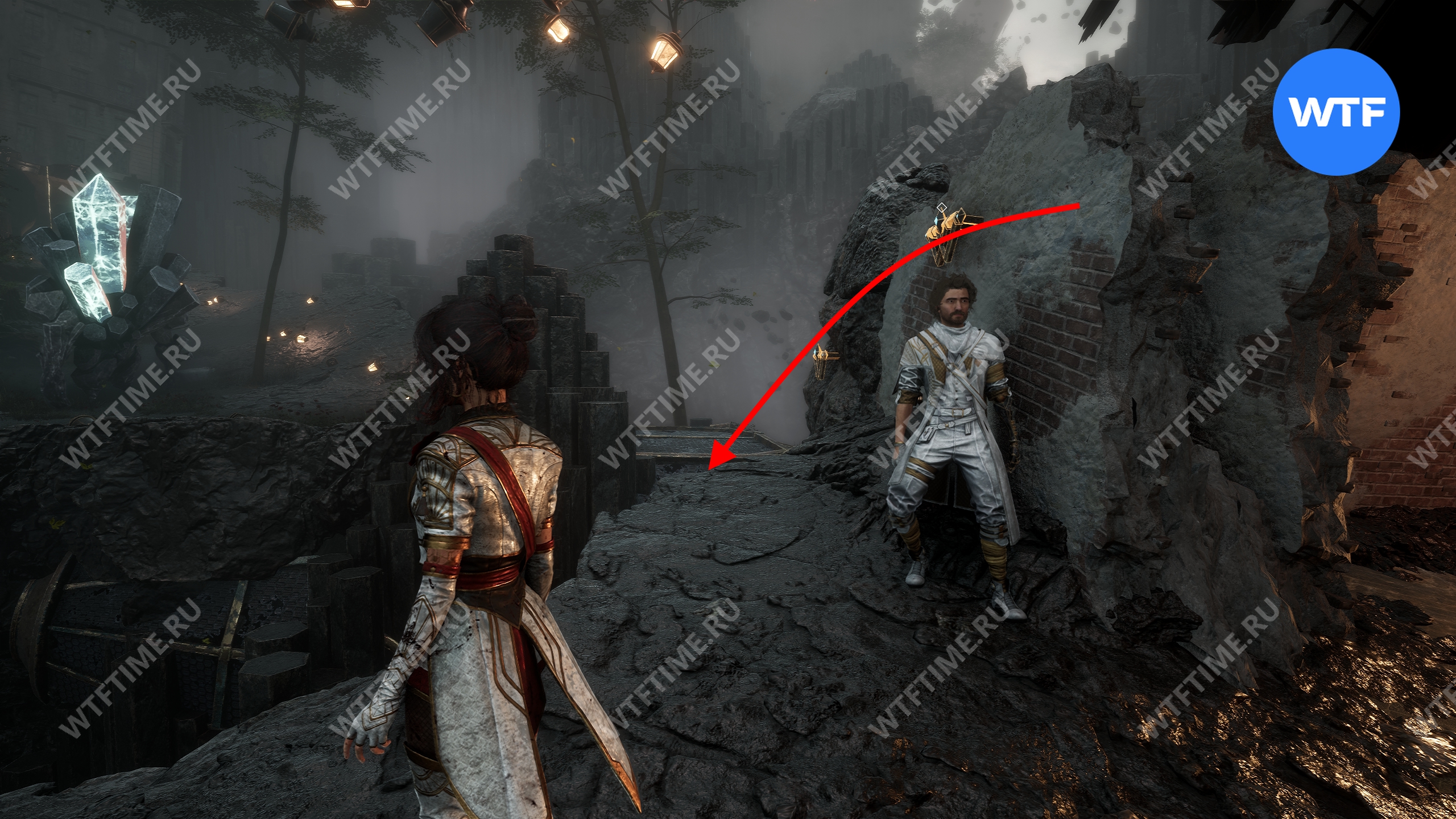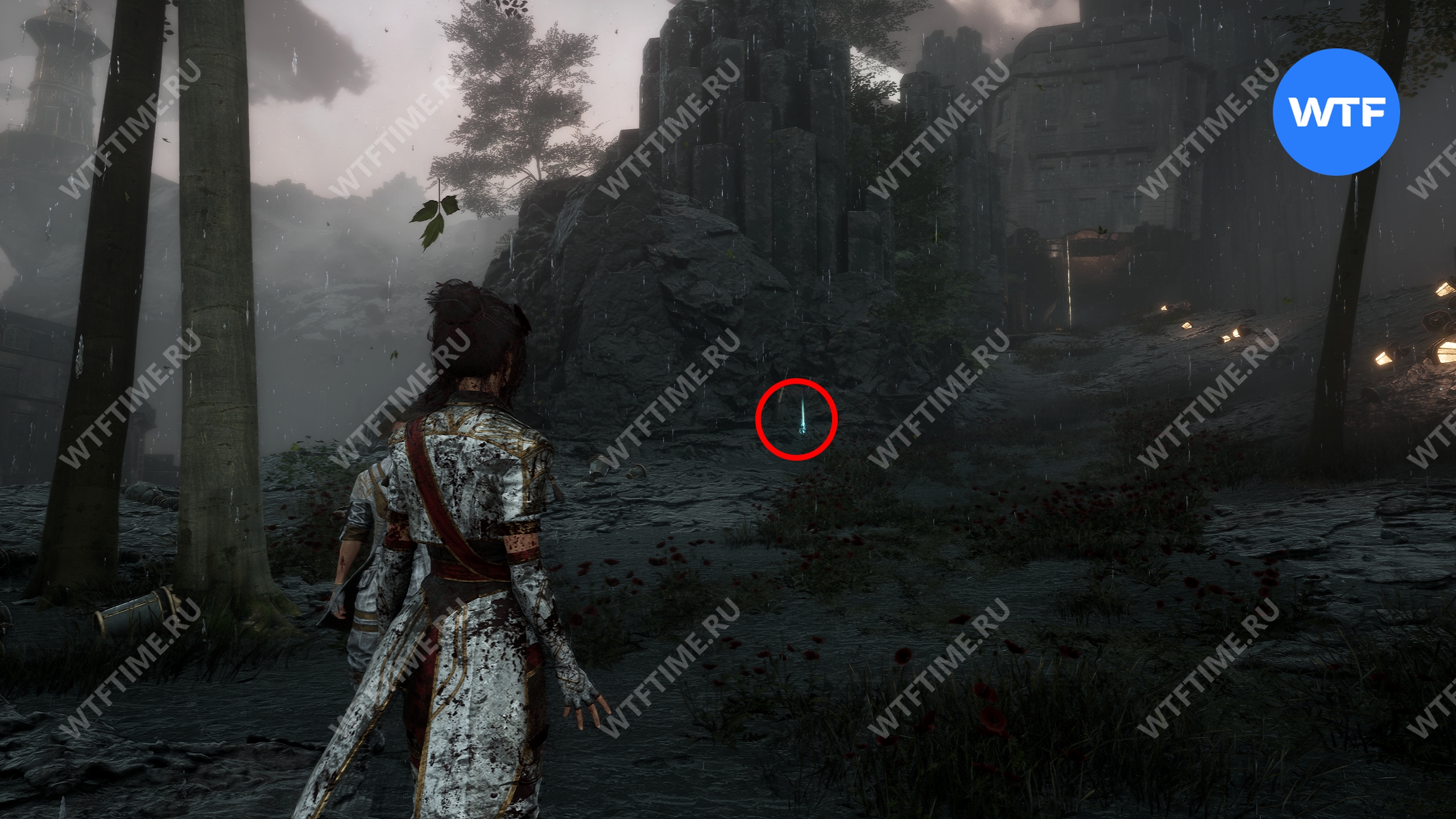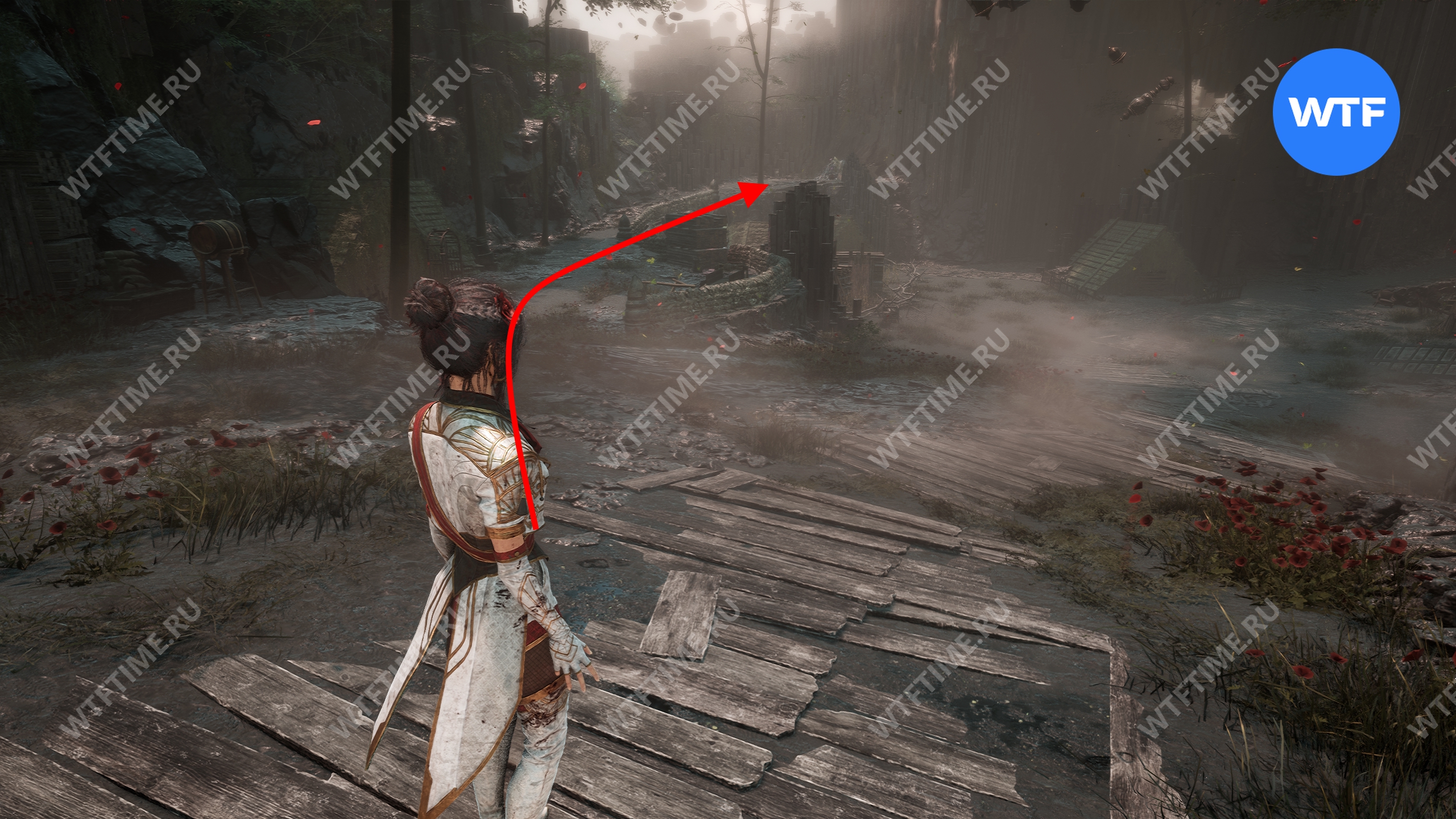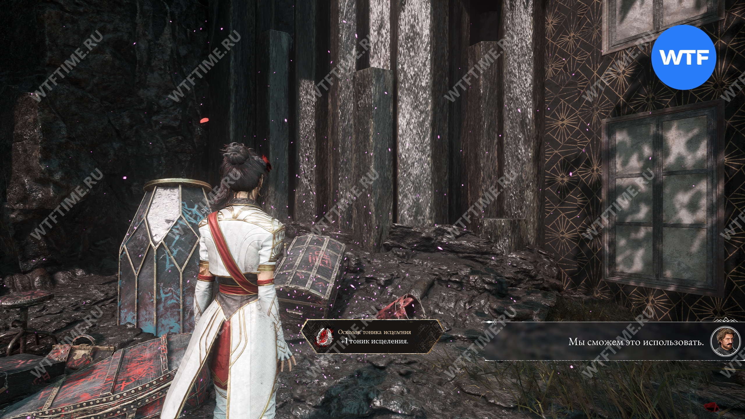 После этого слева от вас будет здание с запертой деревянной дверью. От двери идите направо и воспользуйтесь рычагом у стены, чтобы её открыть. Затем поднимитесь на второй этаж дома и заберите 3160 хромы.