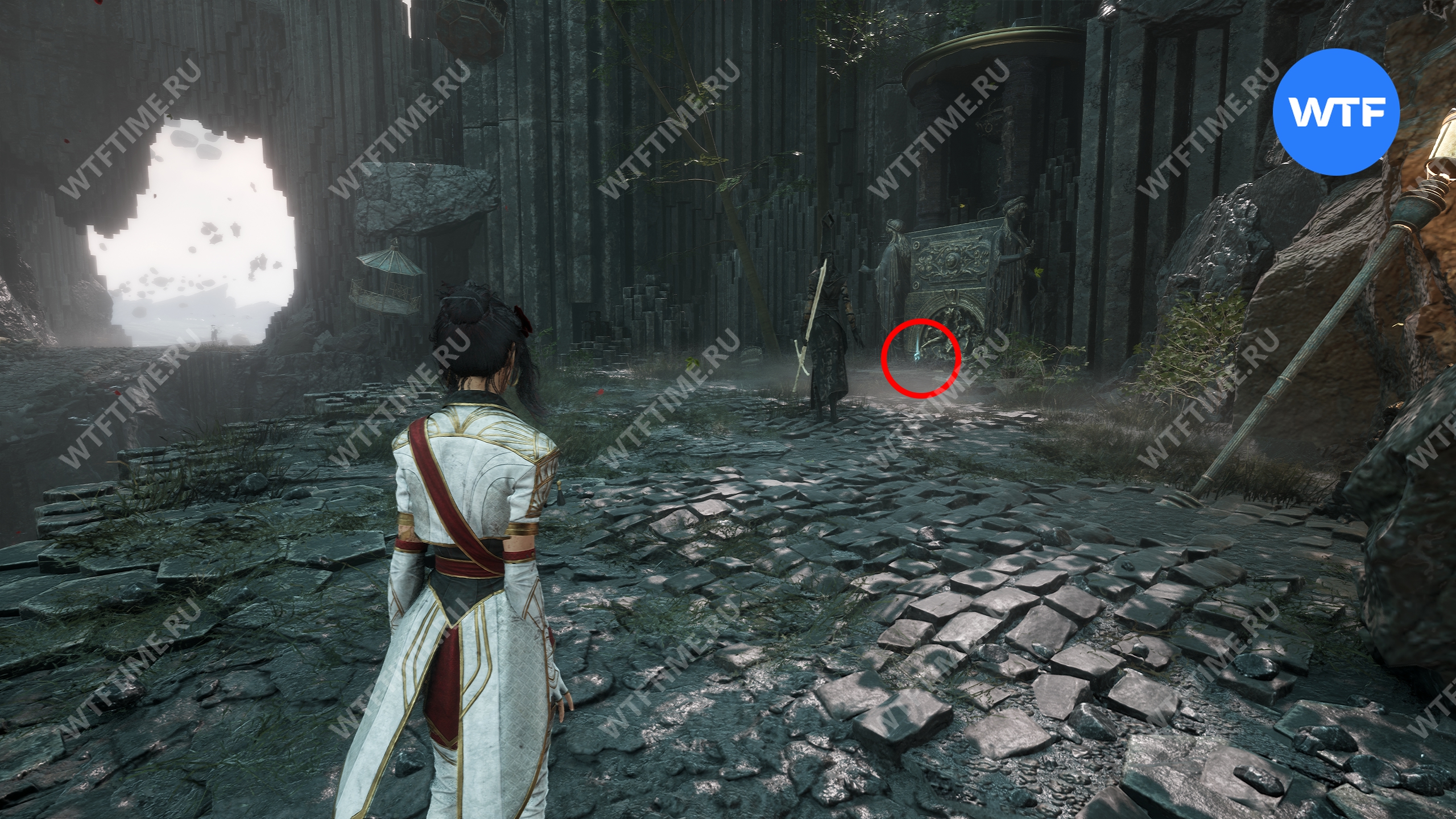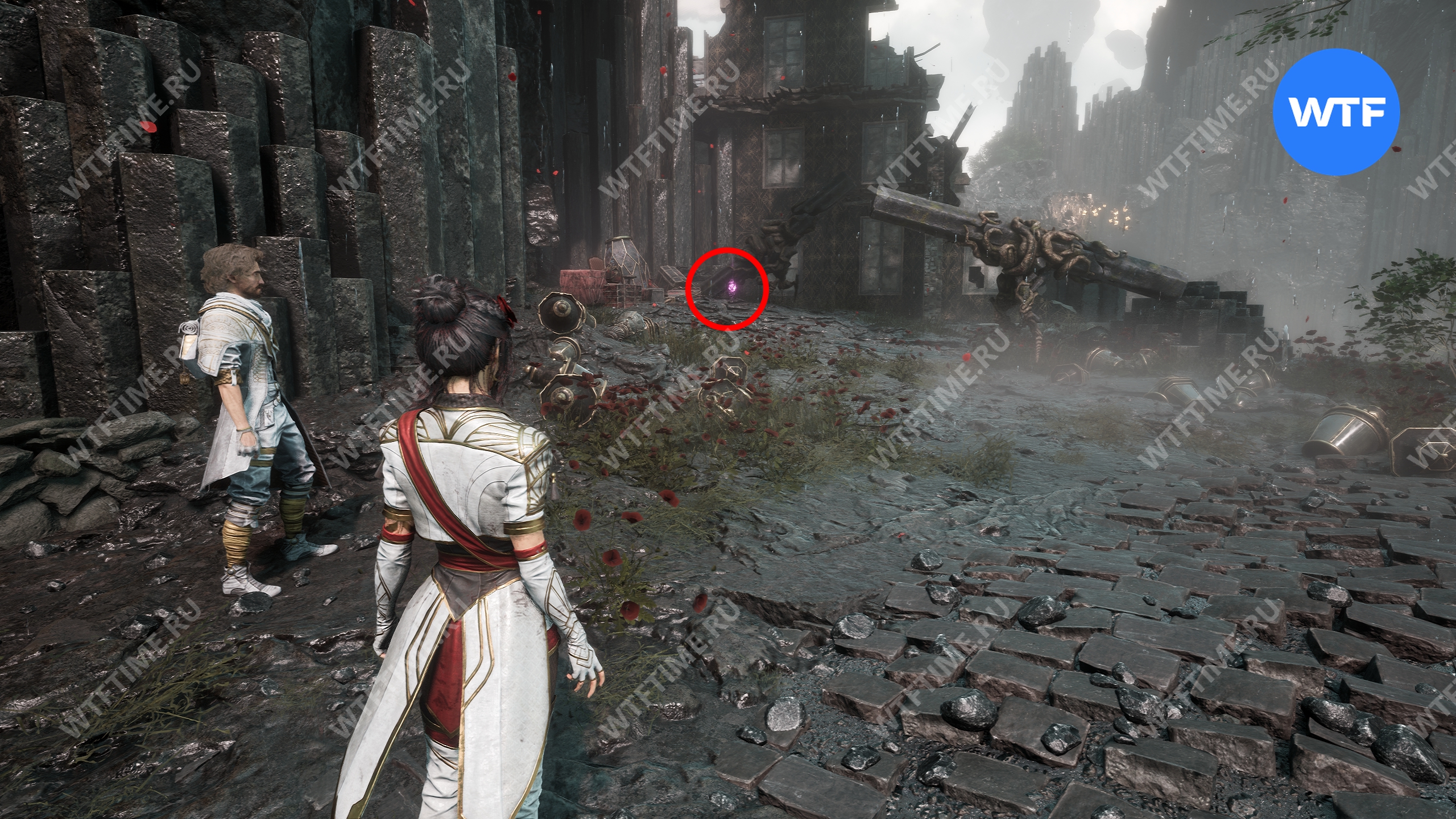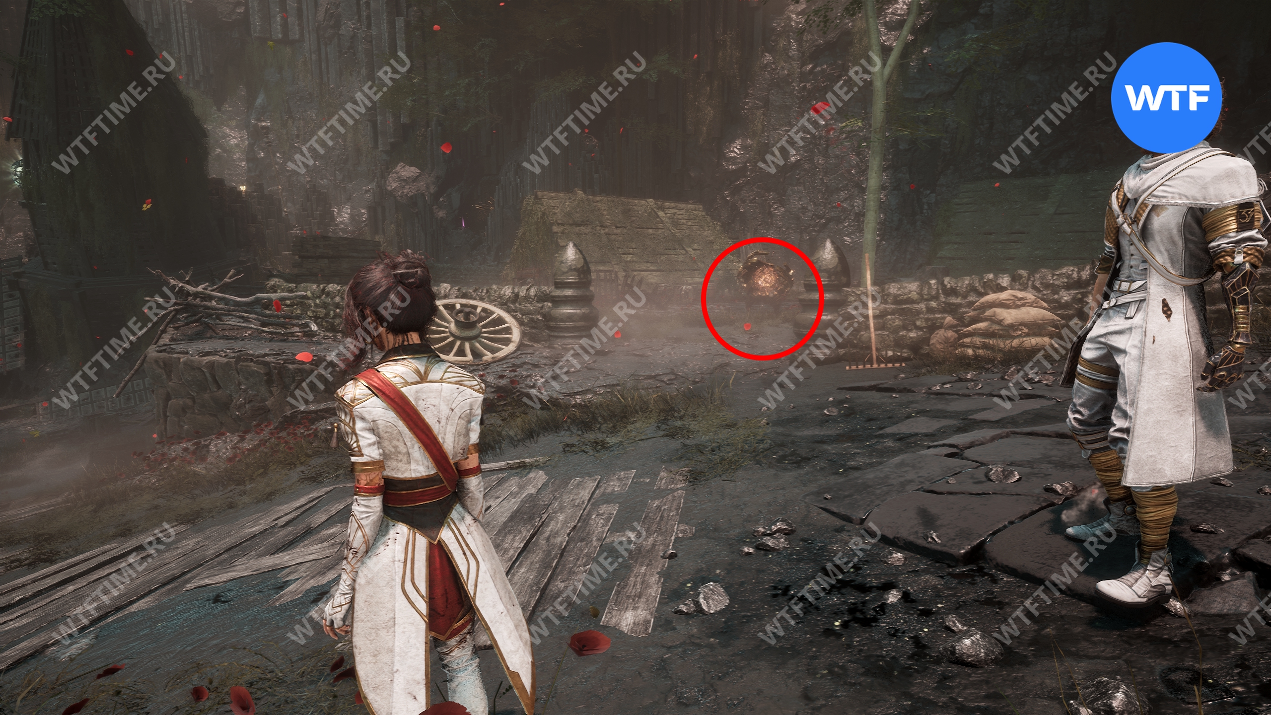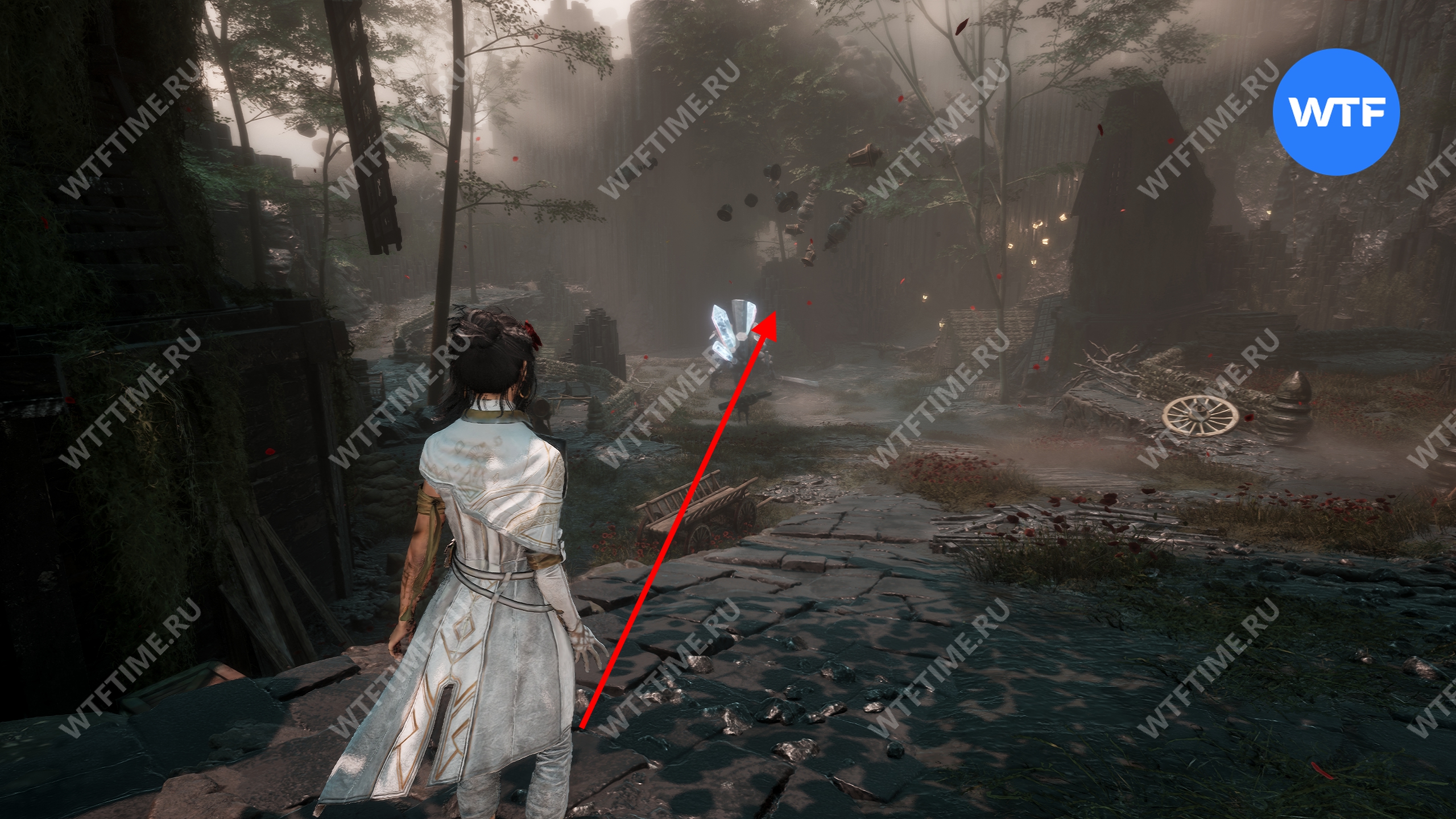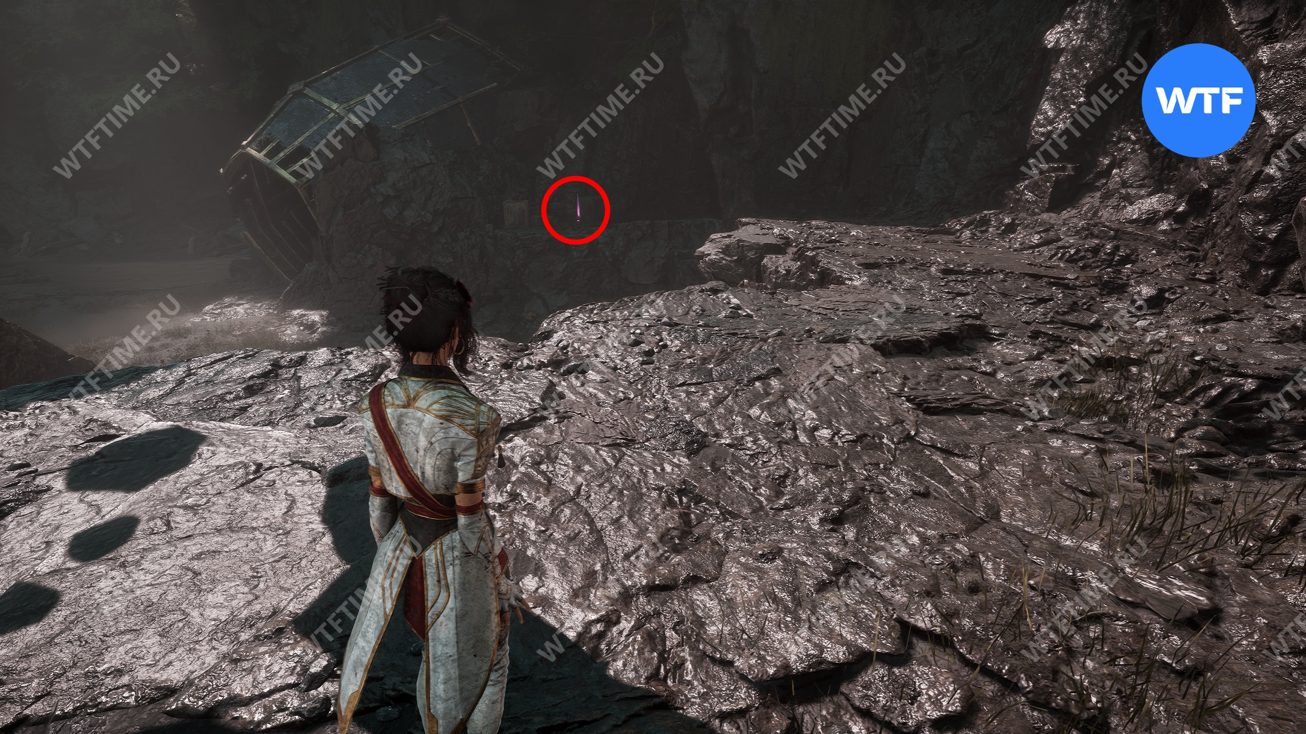 После этого слева от вас будет здание с запертой деревянной дверью. От двери идите направо и воспользуйтесь рычагом у стены, чтобы её открыть. Затем поднимитесь на второй этаж дома и заберите 3160 хромы.
