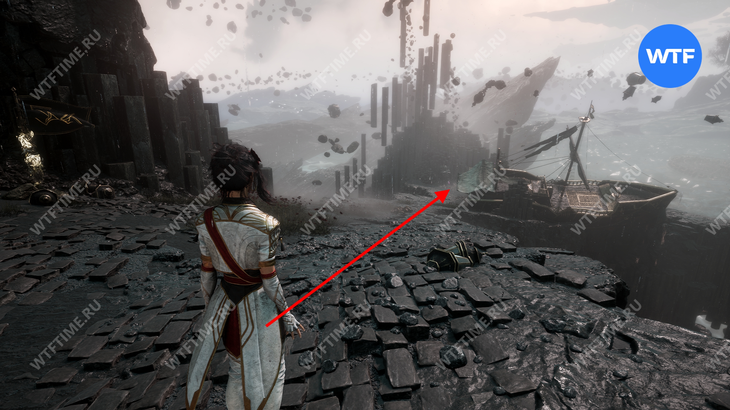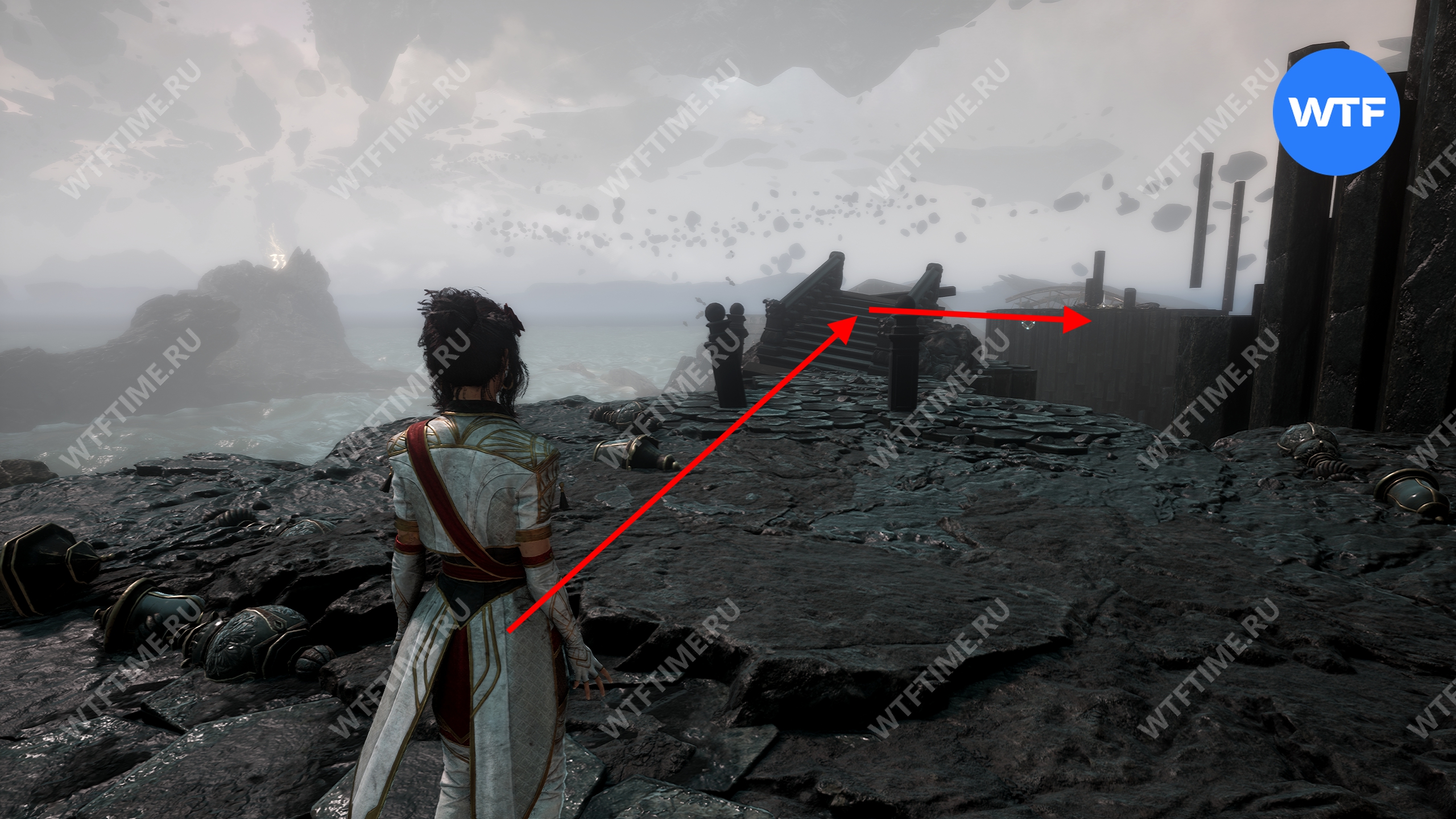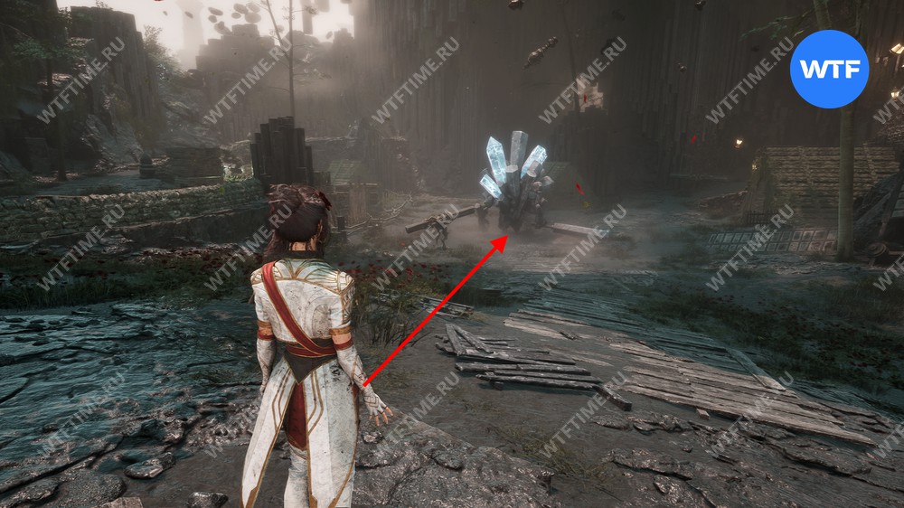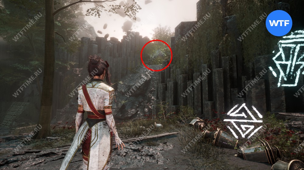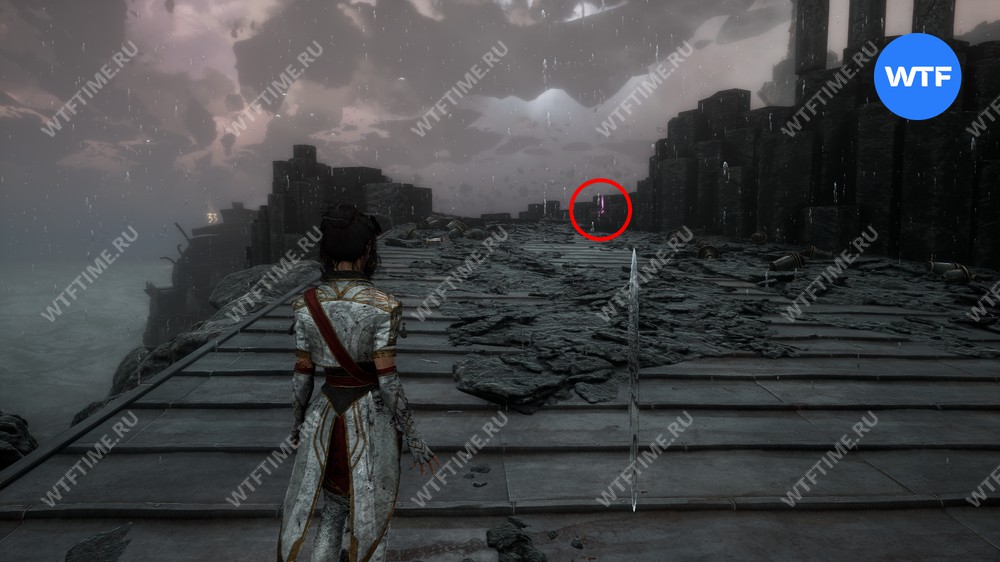 Слева от этого проема на стене есть опоры, по которым можно подняться наверх. Затем перепрыгните на соседний участок полуразрушенного пола и подберите оружие для Люнэ «Коралим».
