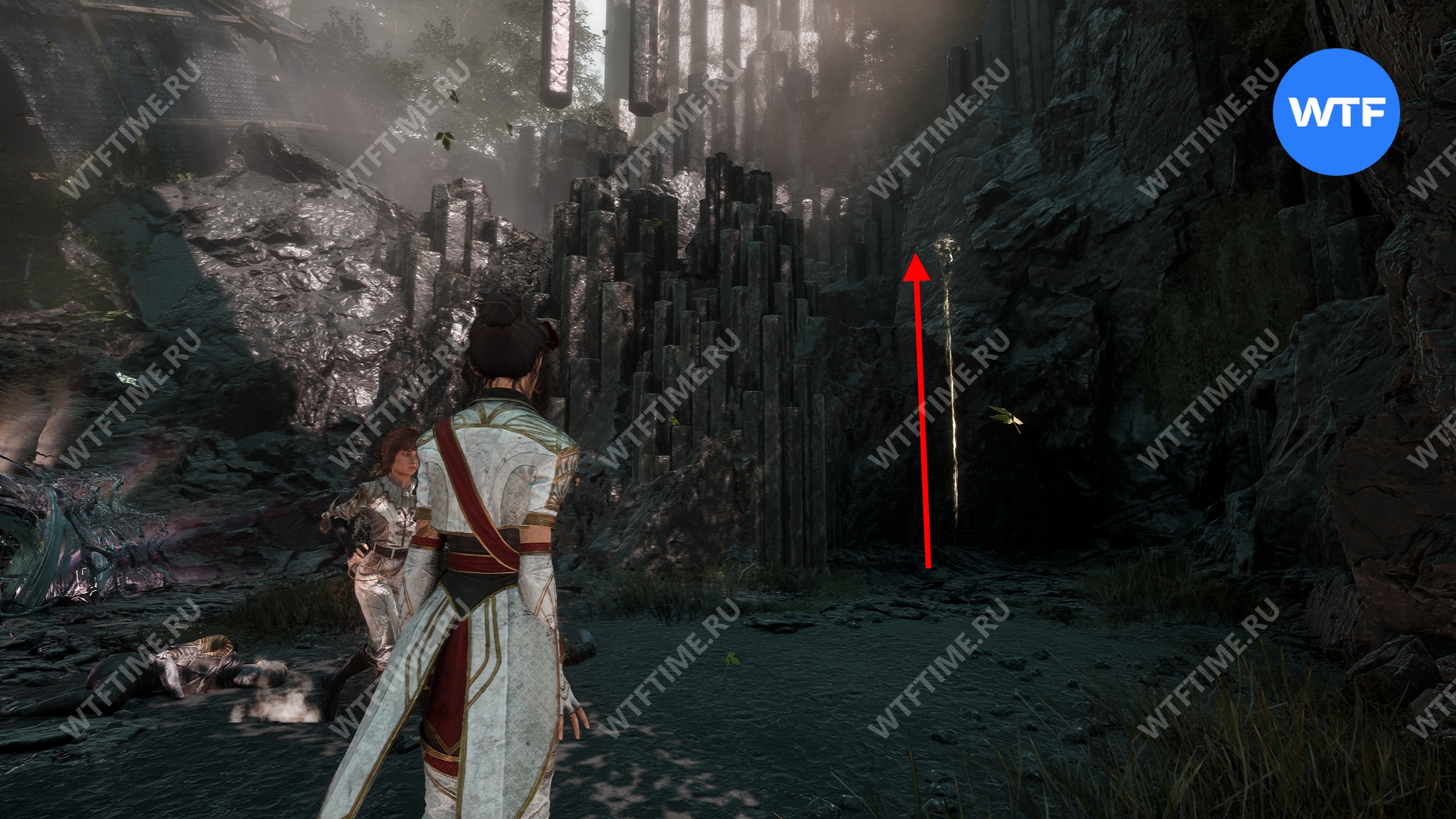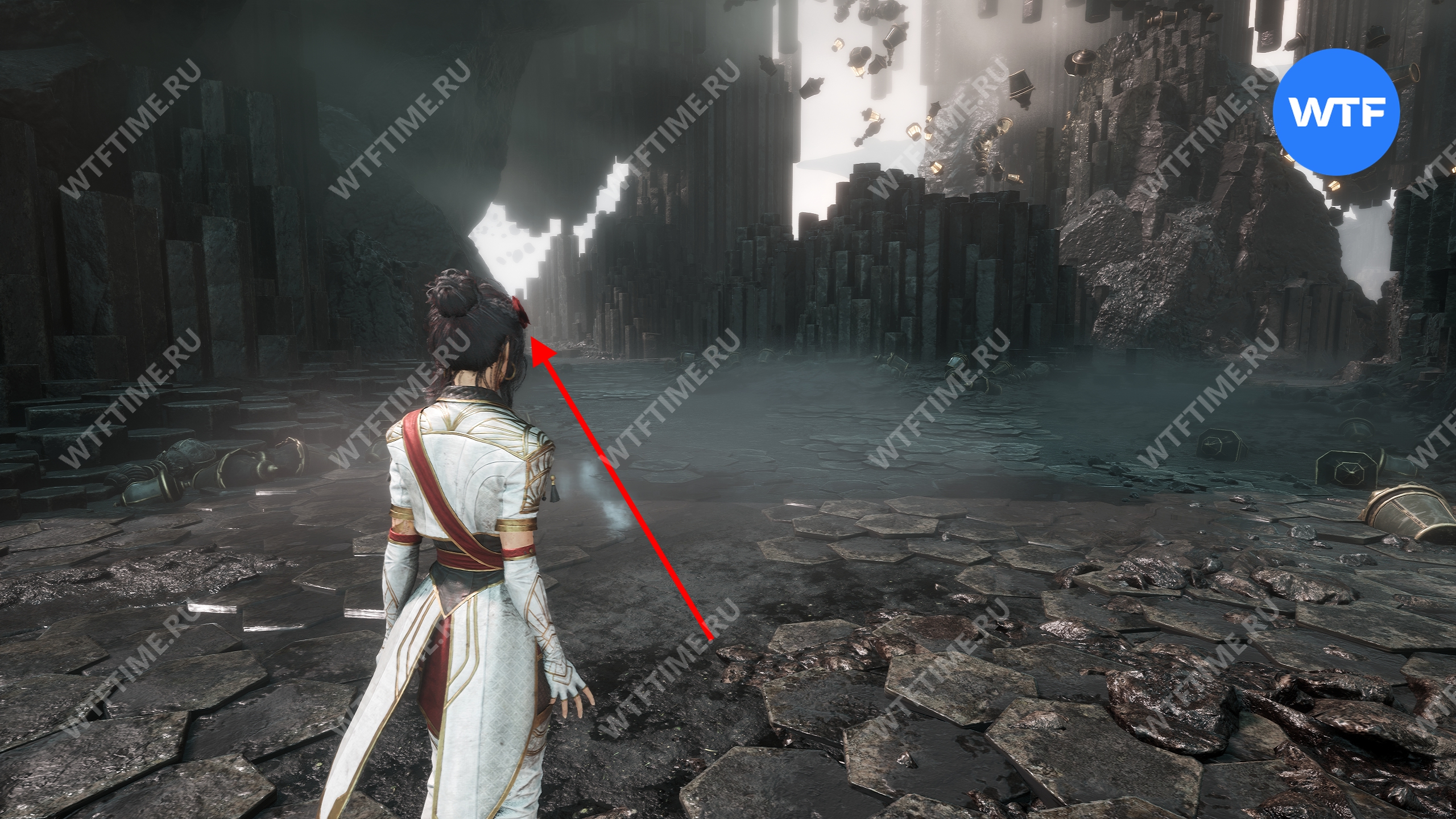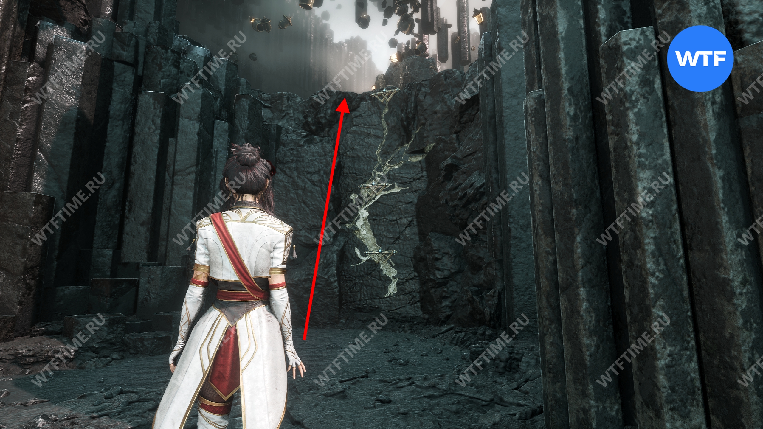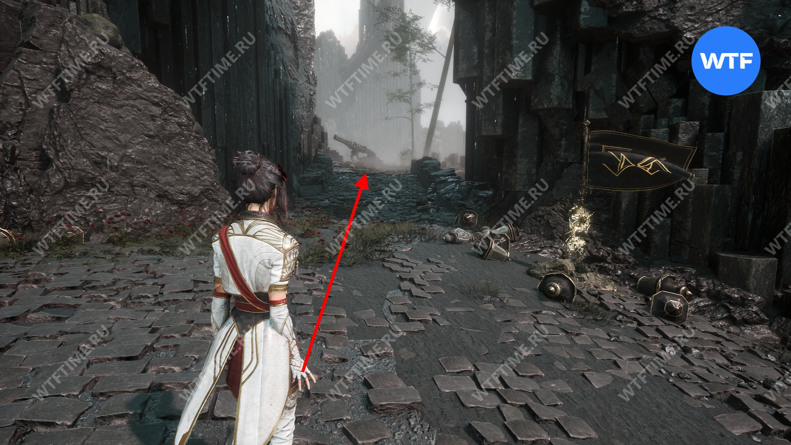 Слева от этого проема на стене есть опоры, по которым можно подняться наверх. Затем перепрыгните на соседний участок полуразрушенного пола и подберите оружие для Люнэ «Коралим».