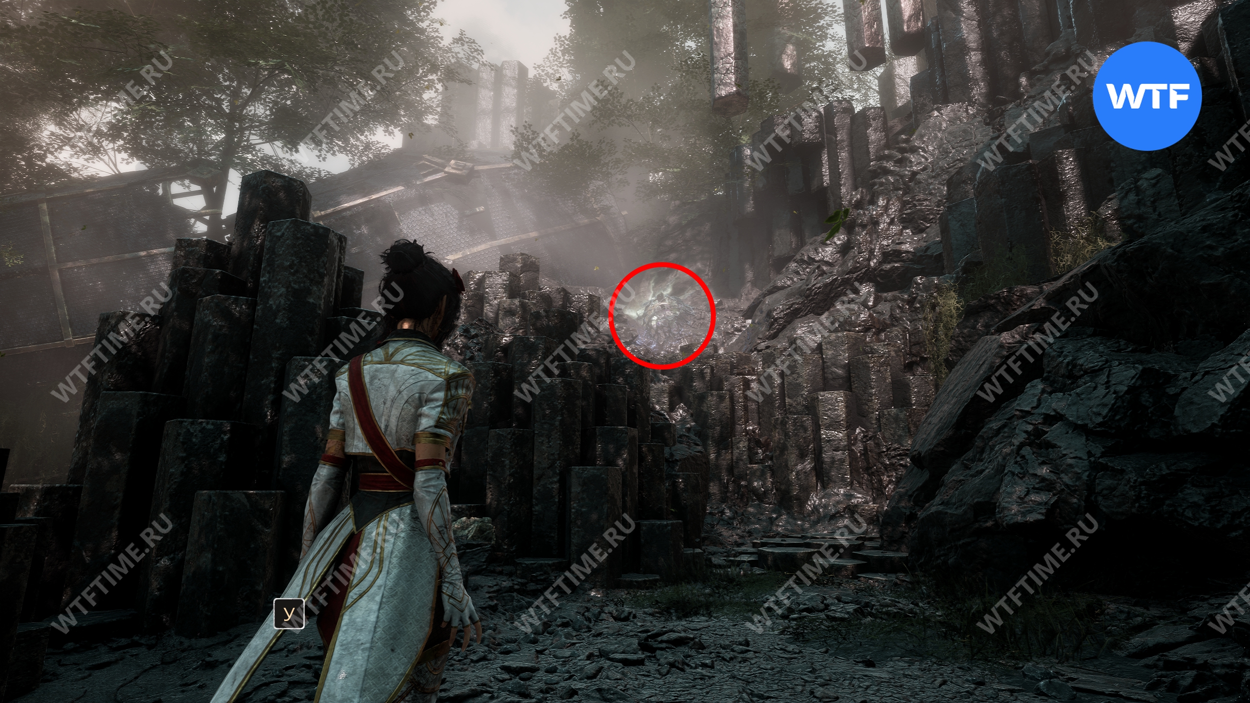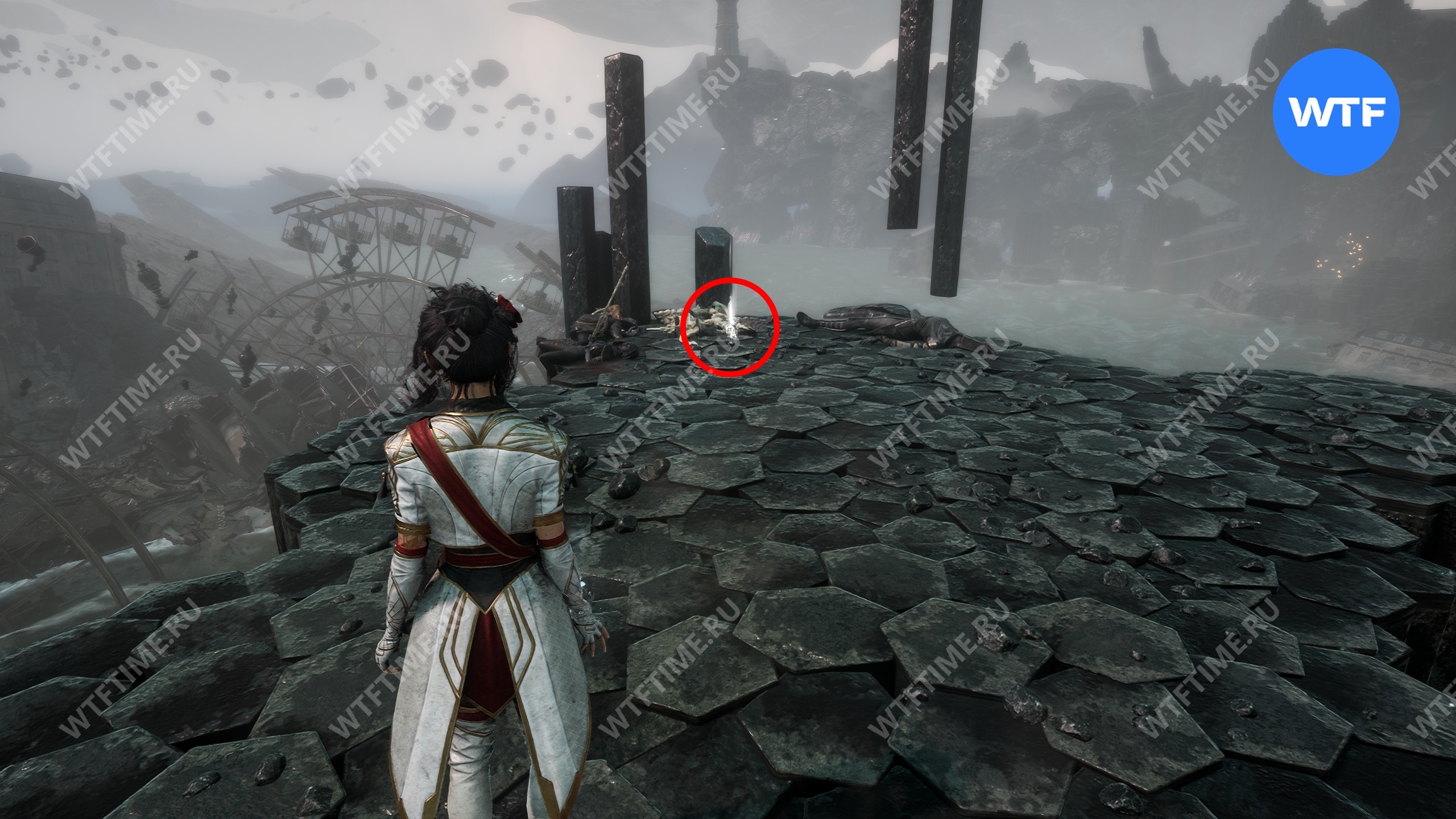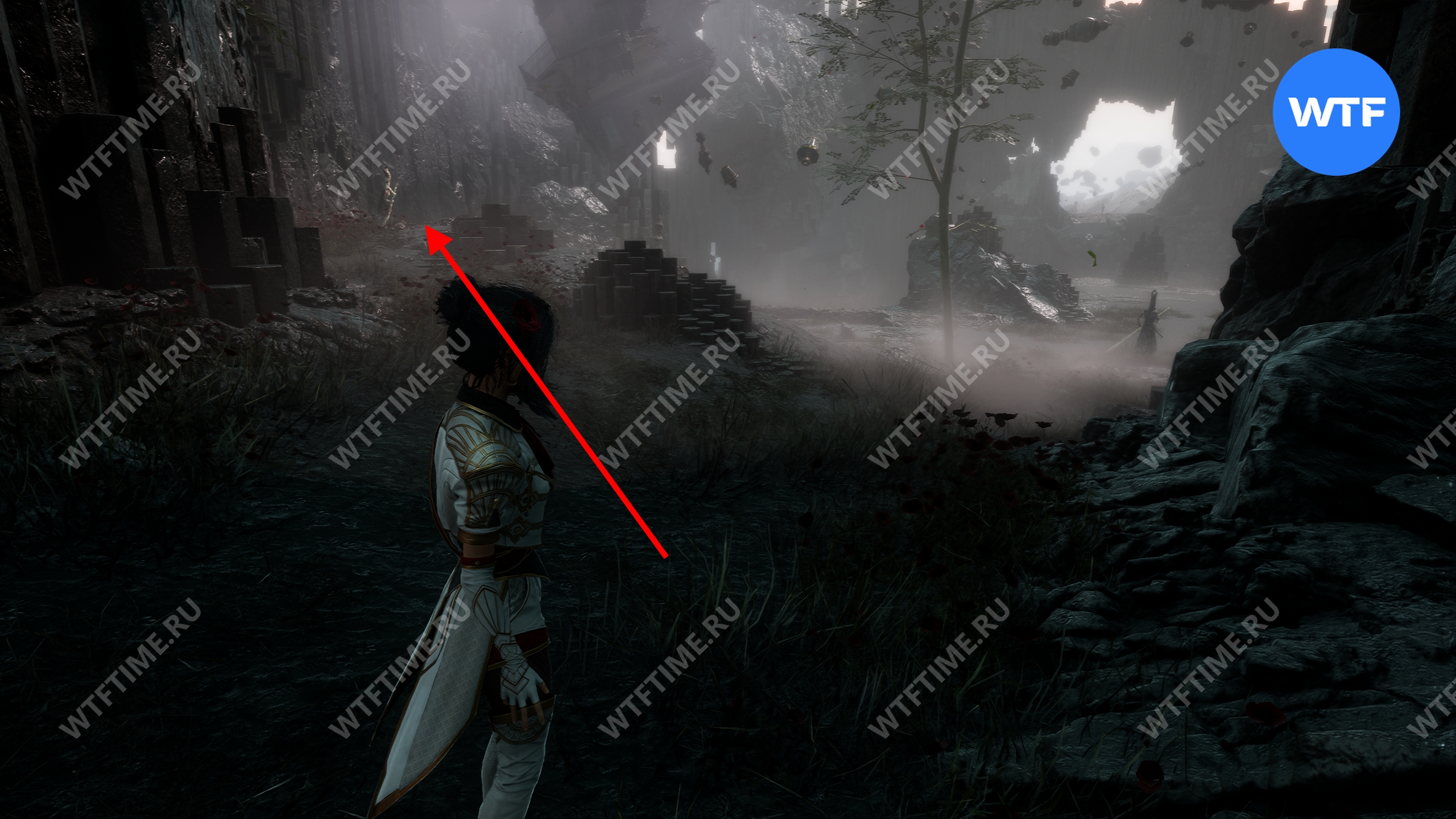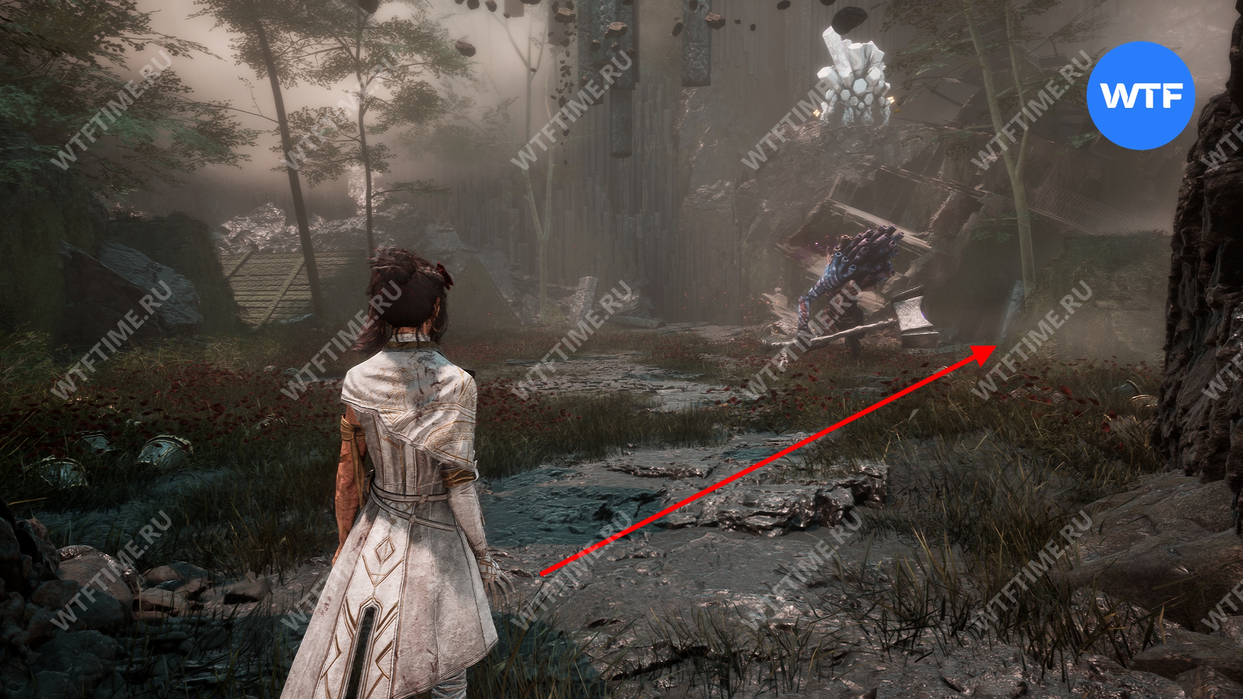 Слева от этого проема на стене есть опоры, по которым можно подняться наверх. Затем перепрыгните на соседний участок полуразрушенного пола и подберите оружие для Люнэ «Коралим».