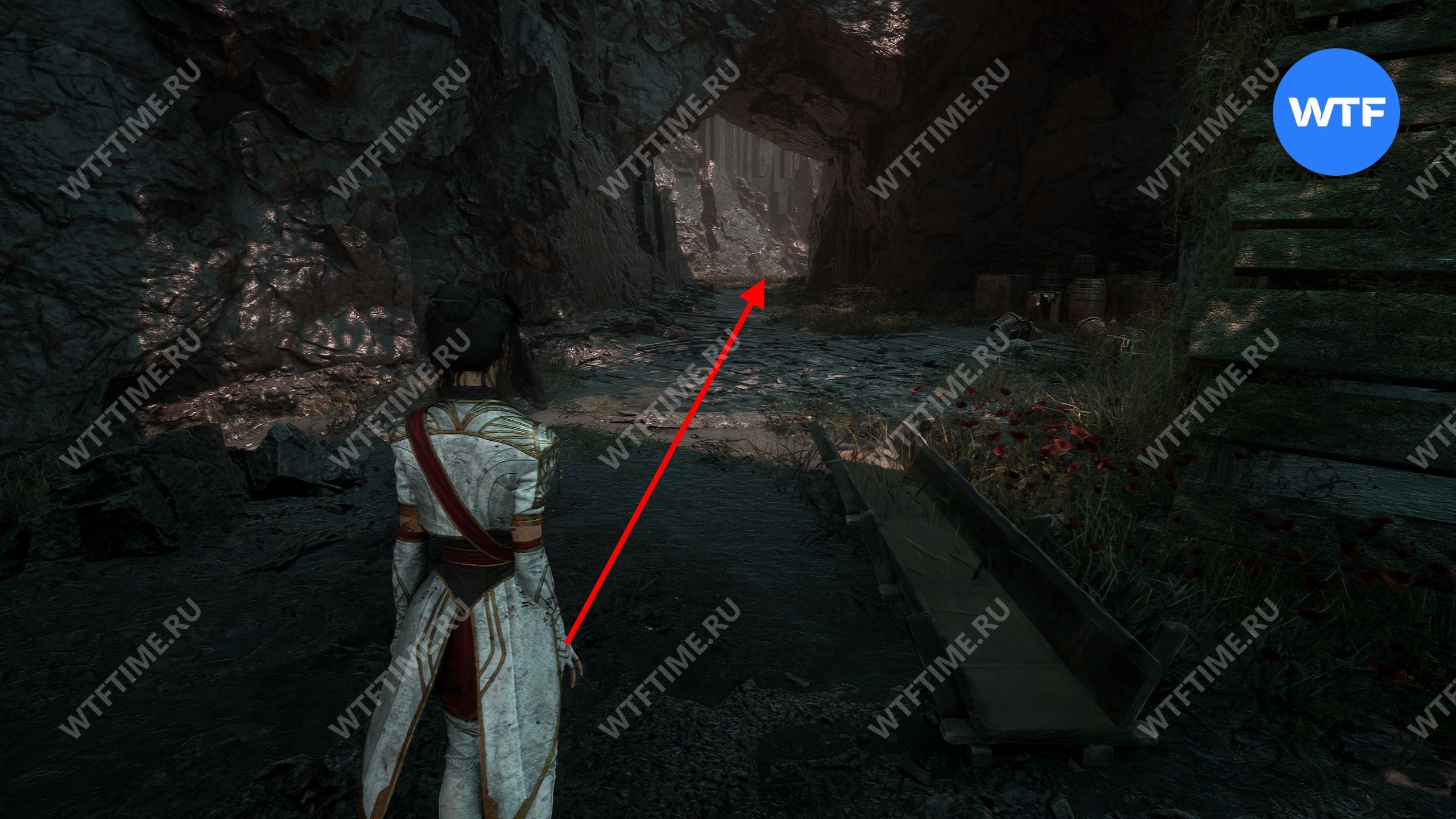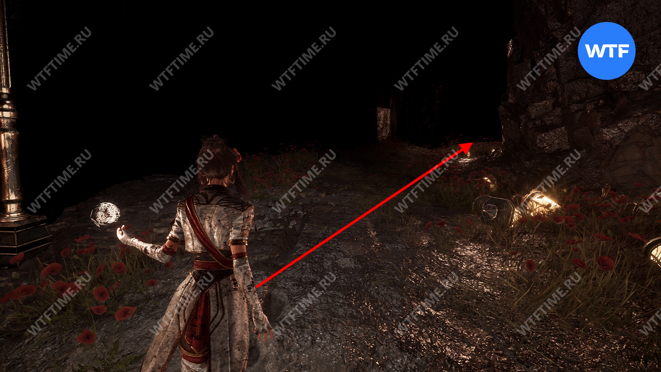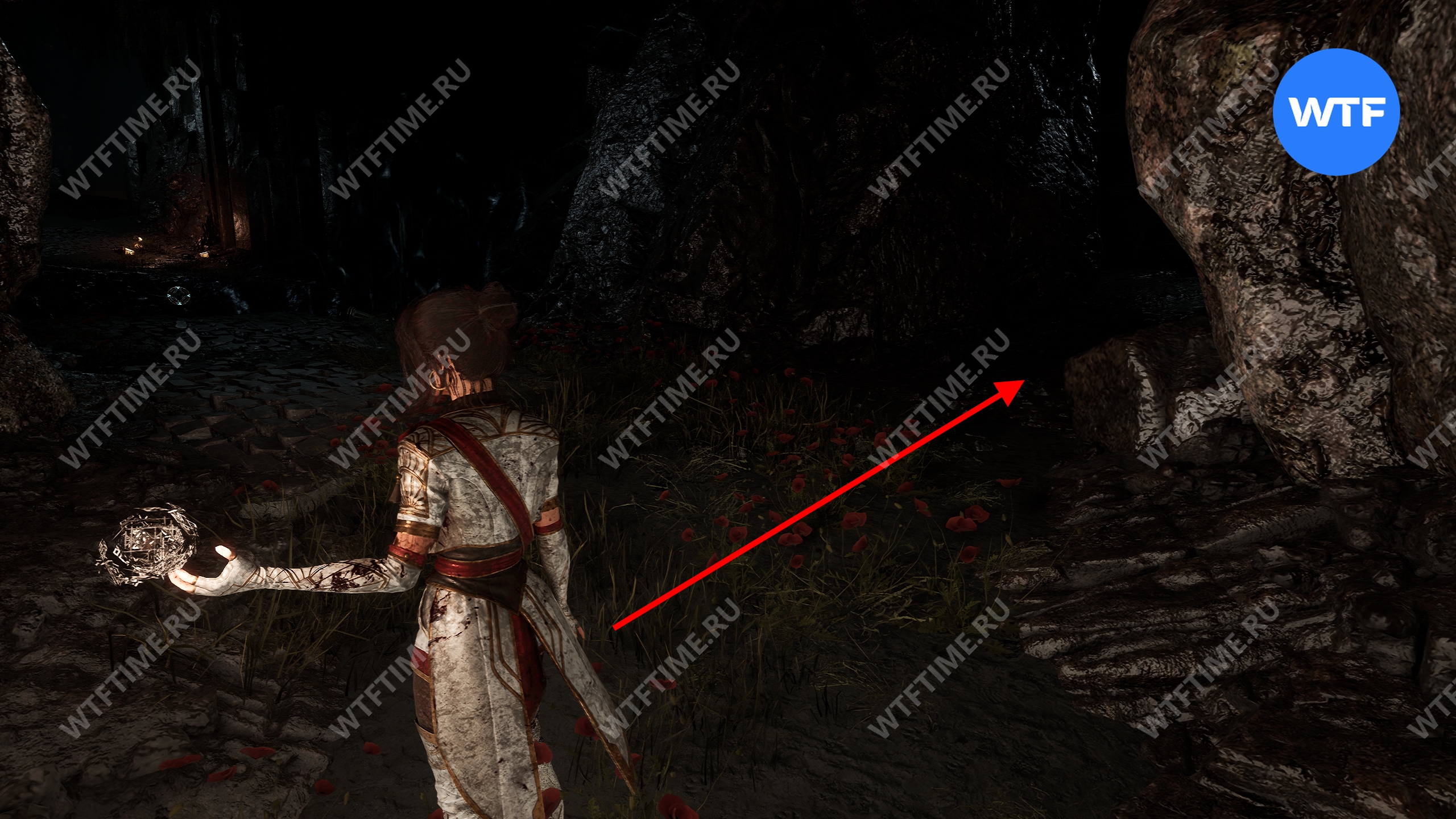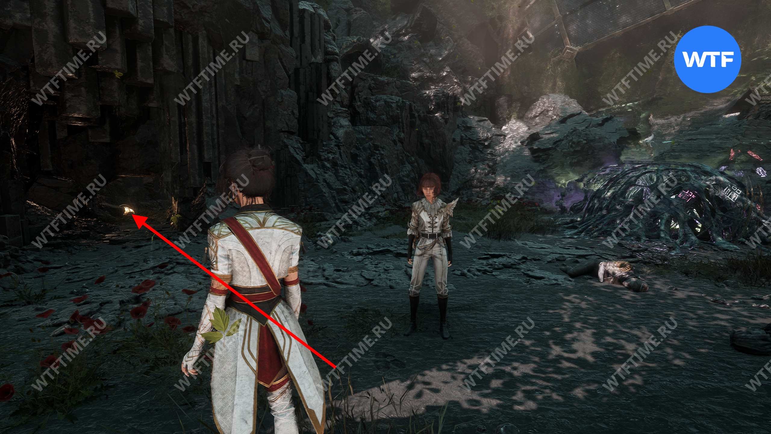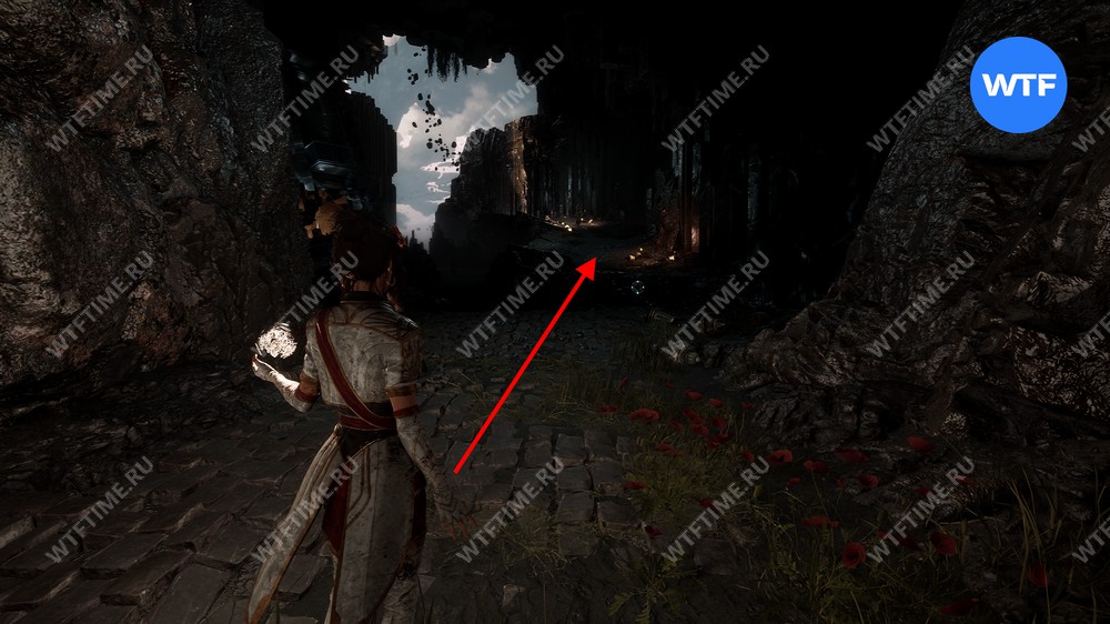 Теперь вернитесь обратно в пещеру и снова доберитесь до развилки в конце дорожки из красных цветов. На этот раз идите налево и воспользуйтесь точкой захвата.