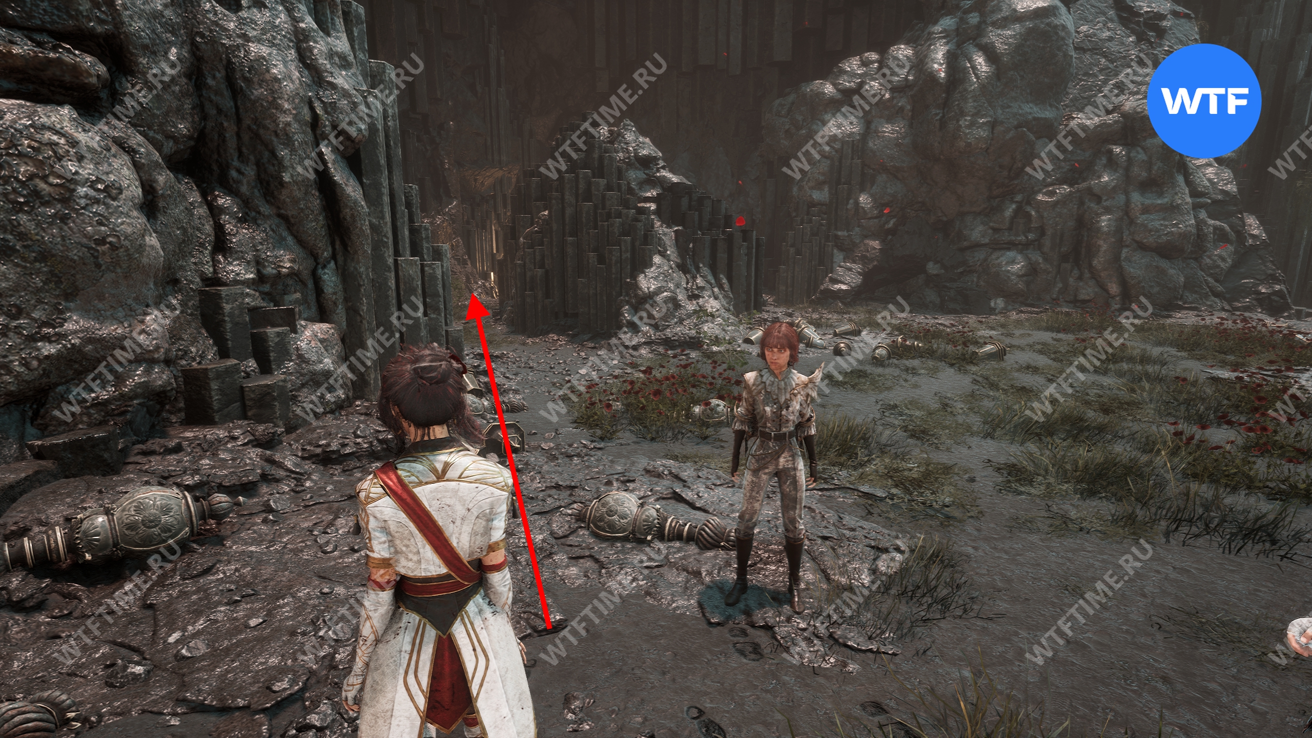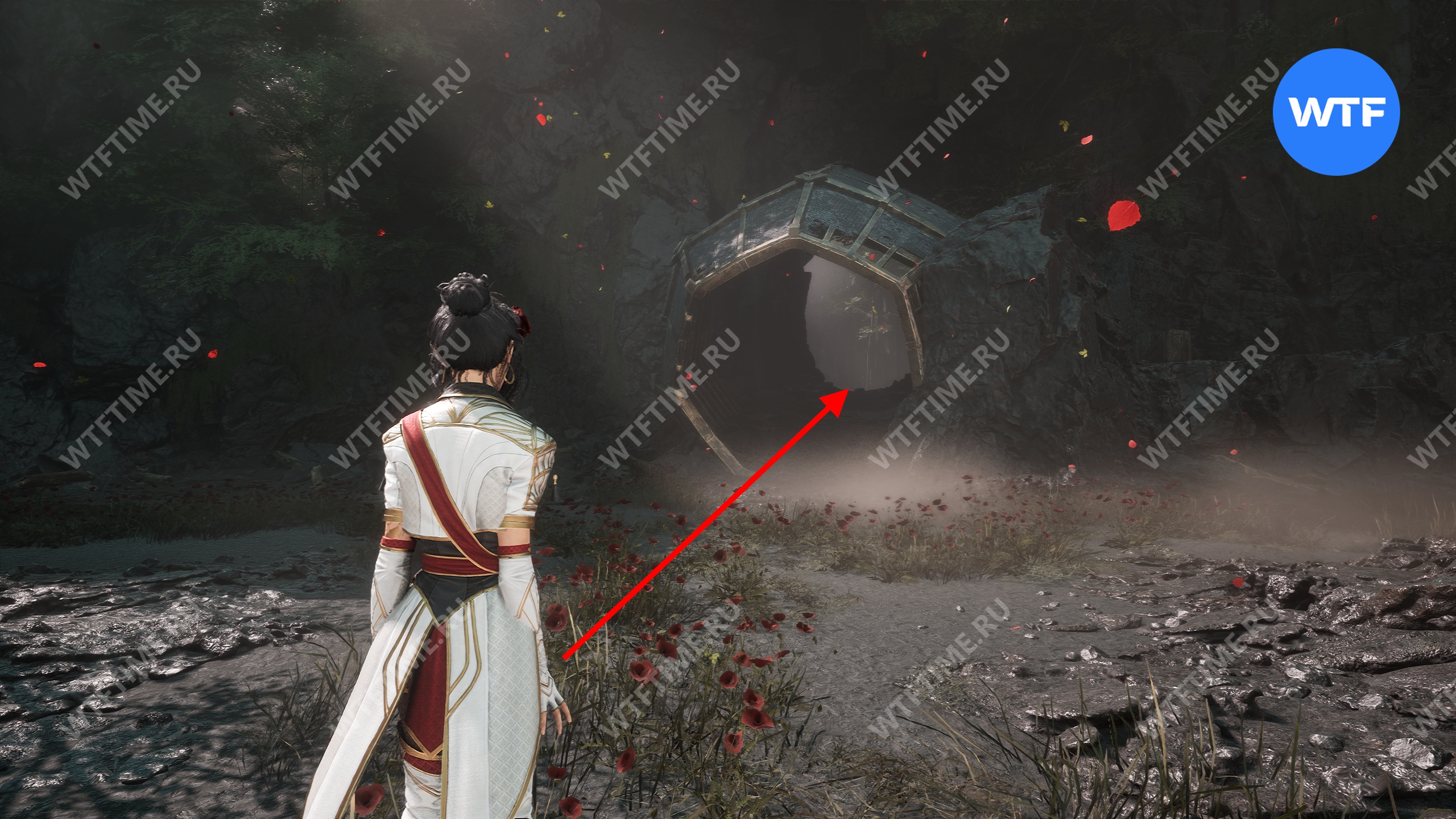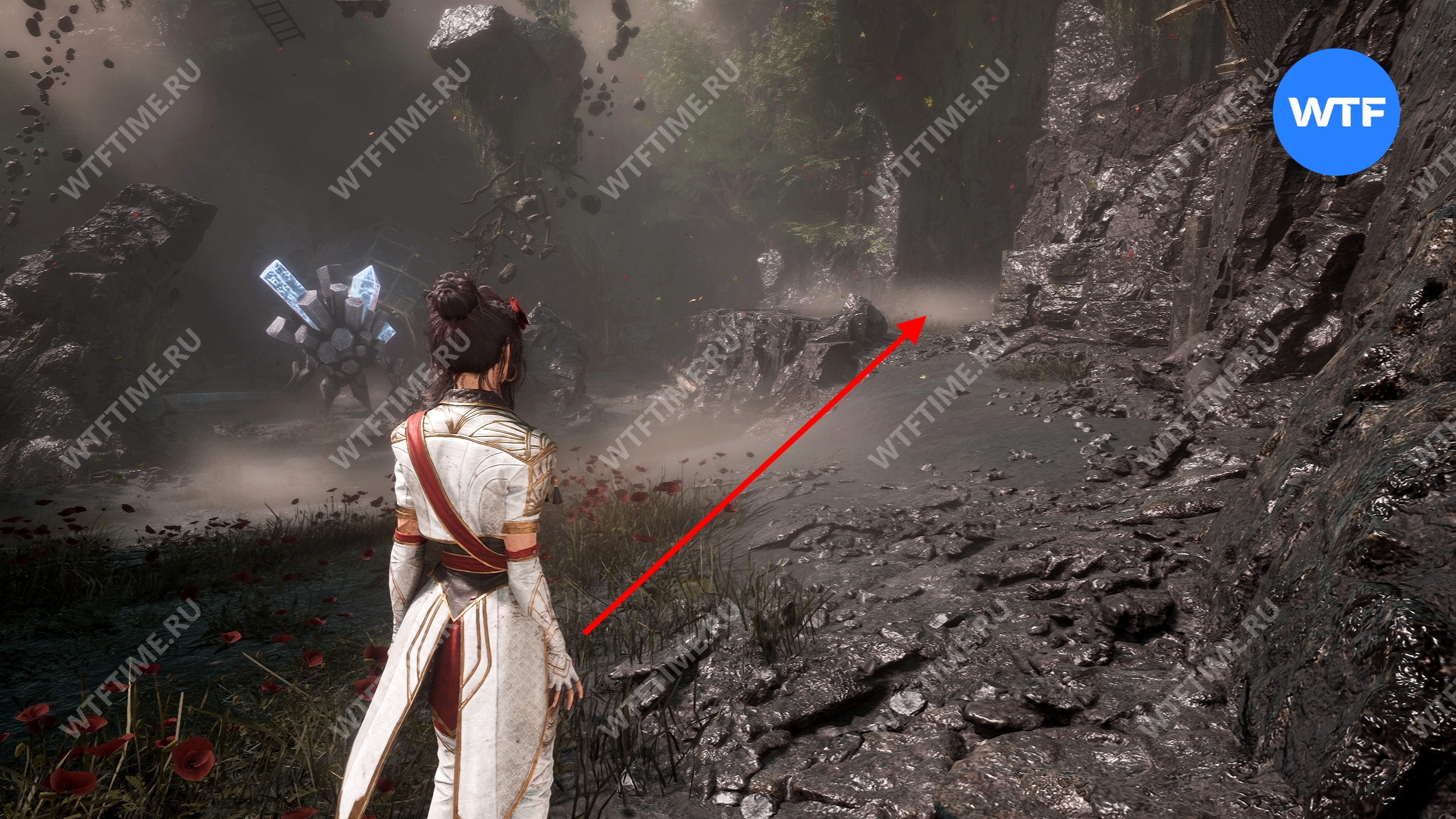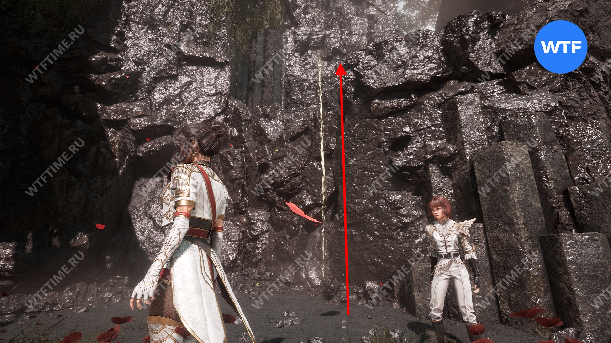 Теперь вернитесь обратно в пещеру и снова доберитесь до развилки в конце дорожки из красных цветов. На этот раз идите налево и воспользуйтесь точкой захвата.