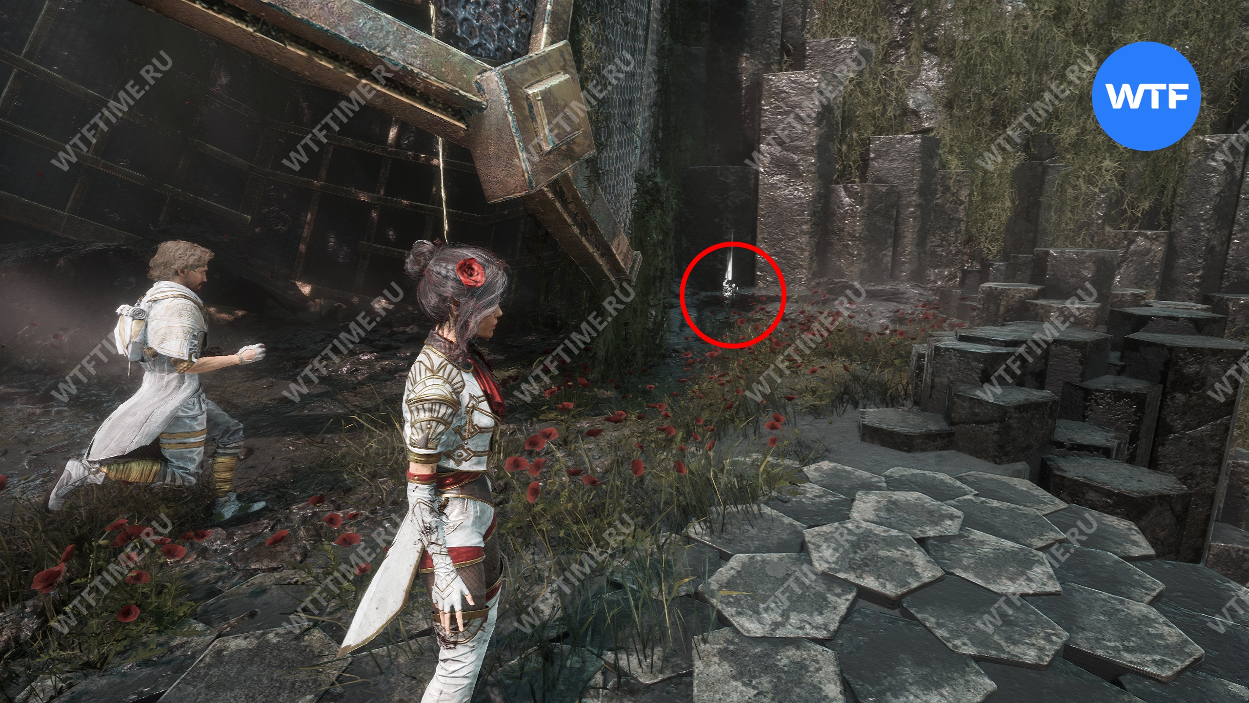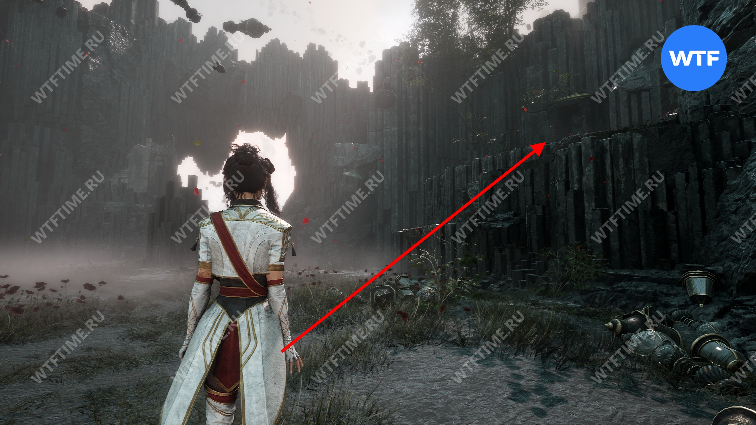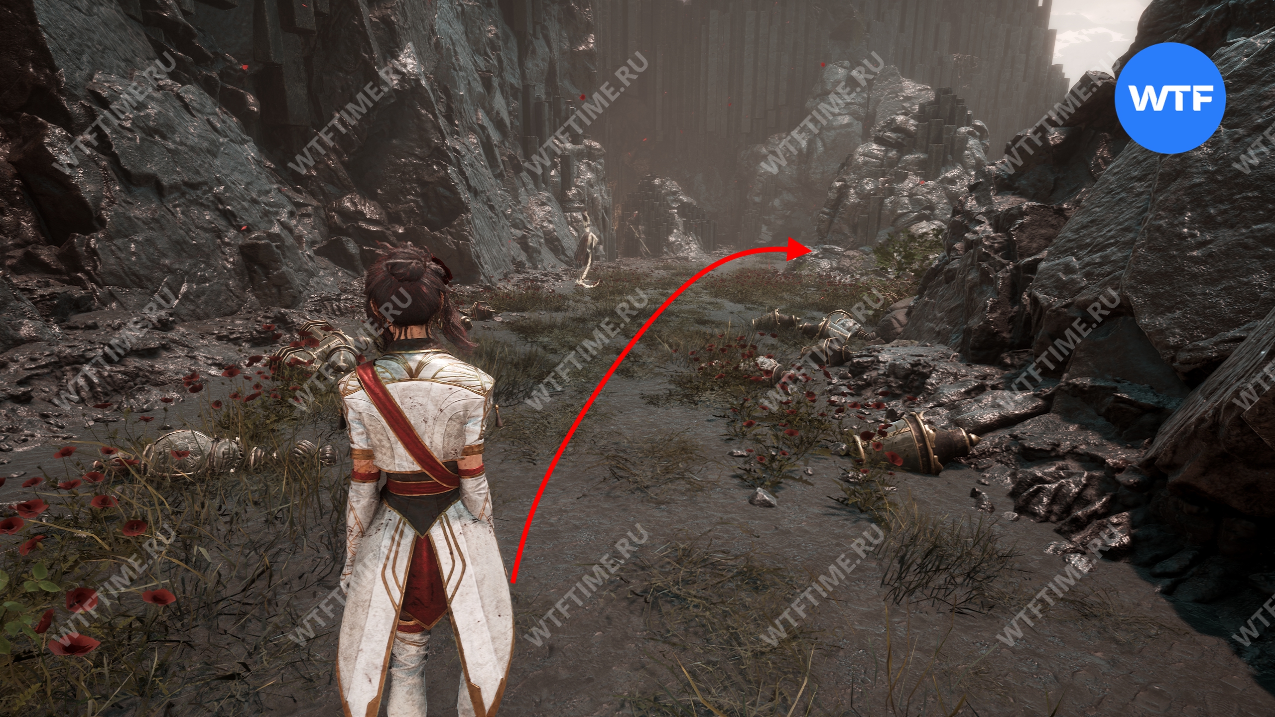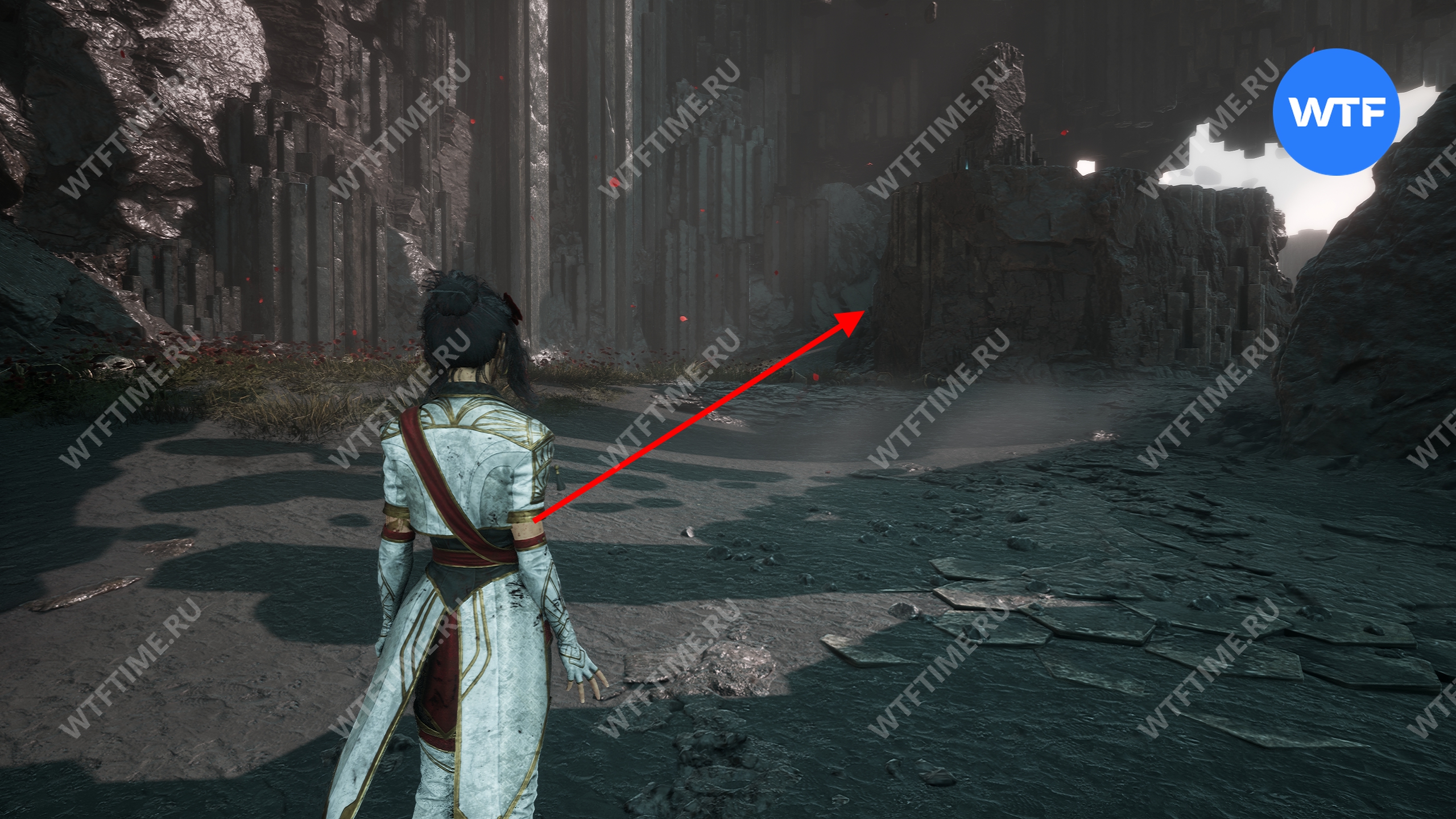 Теперь вернитесь обратно в пещеру и снова доберитесь до развилки в конце дорожки из красных цветов. На этот раз идите налево и воспользуйтесь точкой захвата.