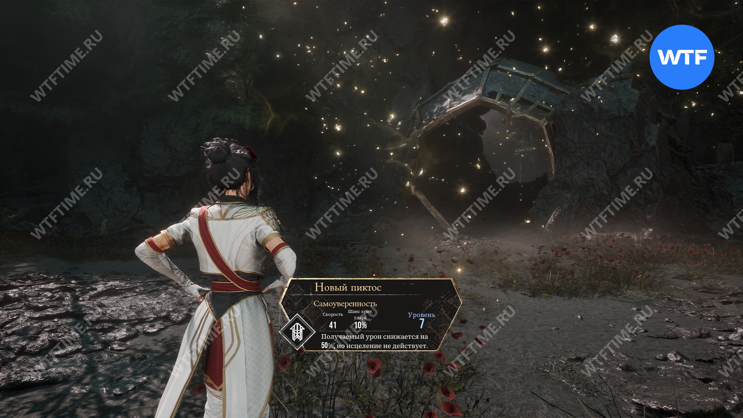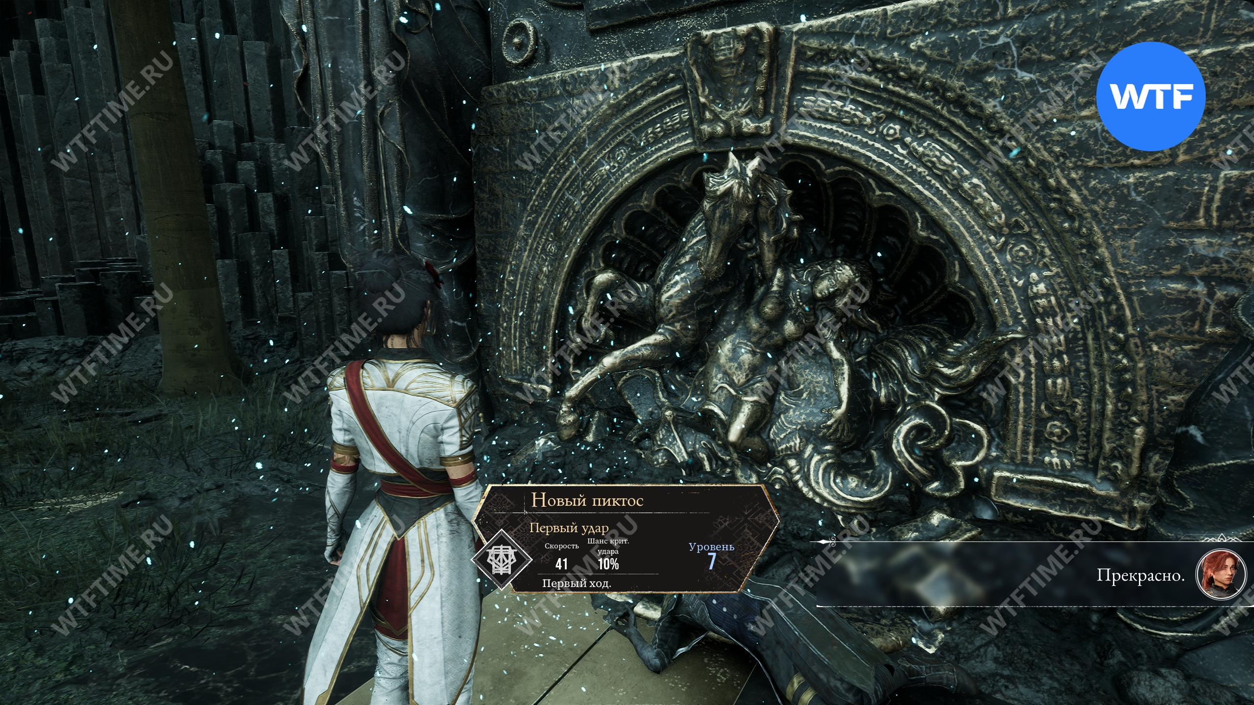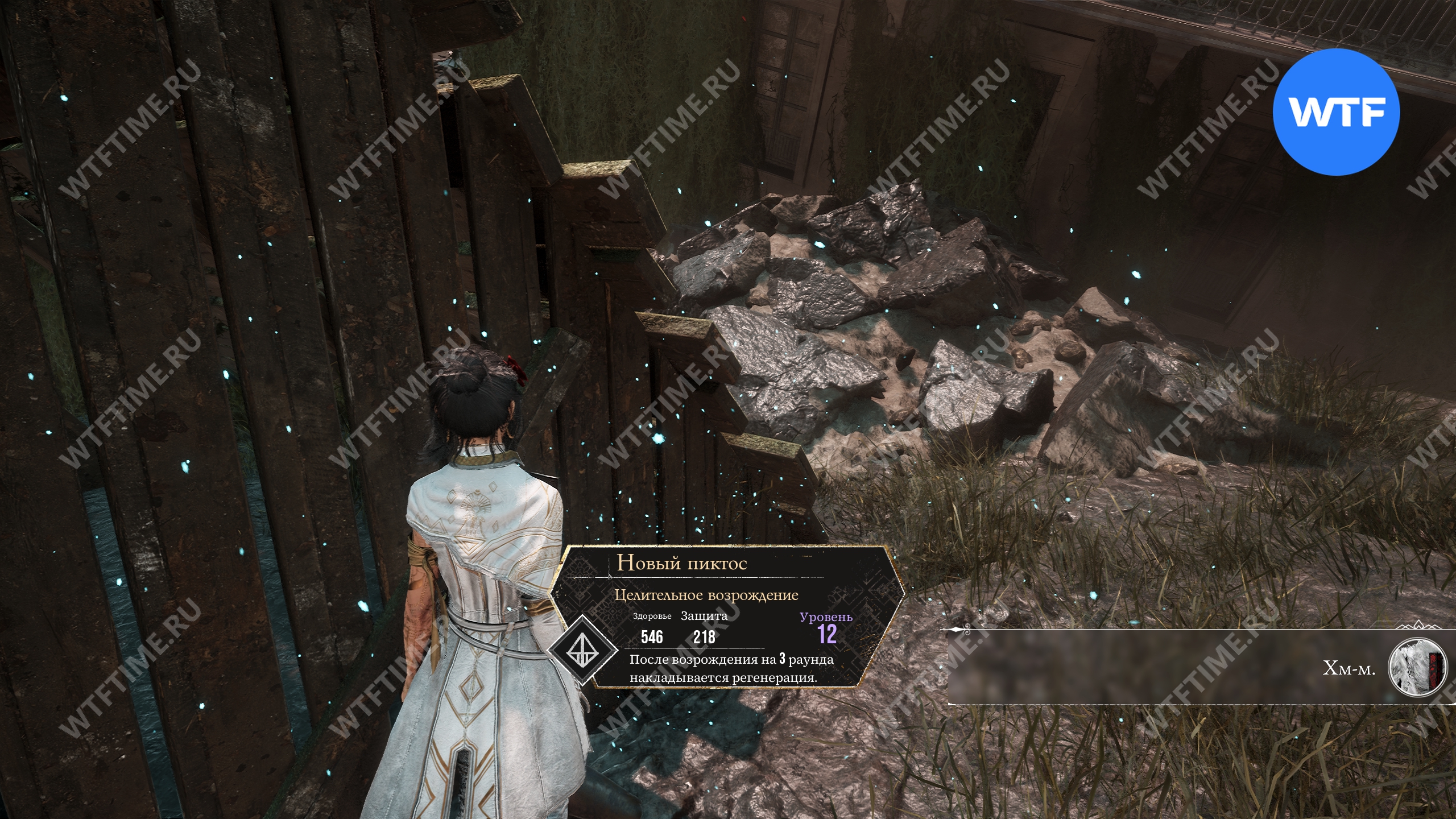Это приведет вас в небольшую секретную область, где вы найдете Хрома-гольта. Сражаться с ним самим не обязательно, можно просто пробежать за дома с правой стороны и забрать пиктос «Целительное возрождение» (уровень 12, здоровье 546, защита 218), накладывающий регенерацию после возрождения на 3 хода.