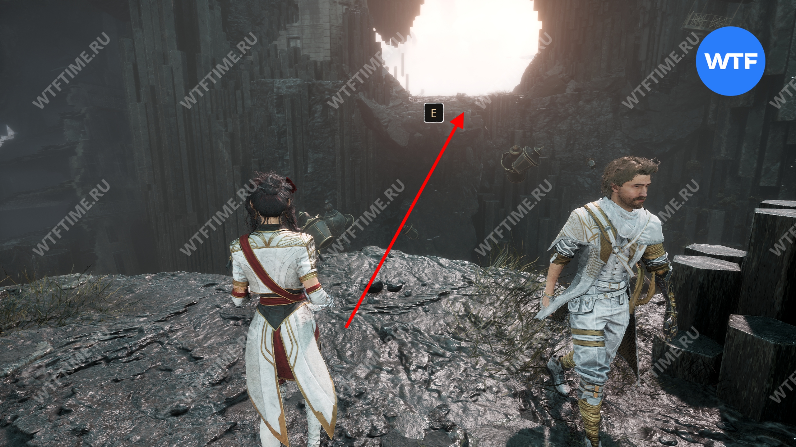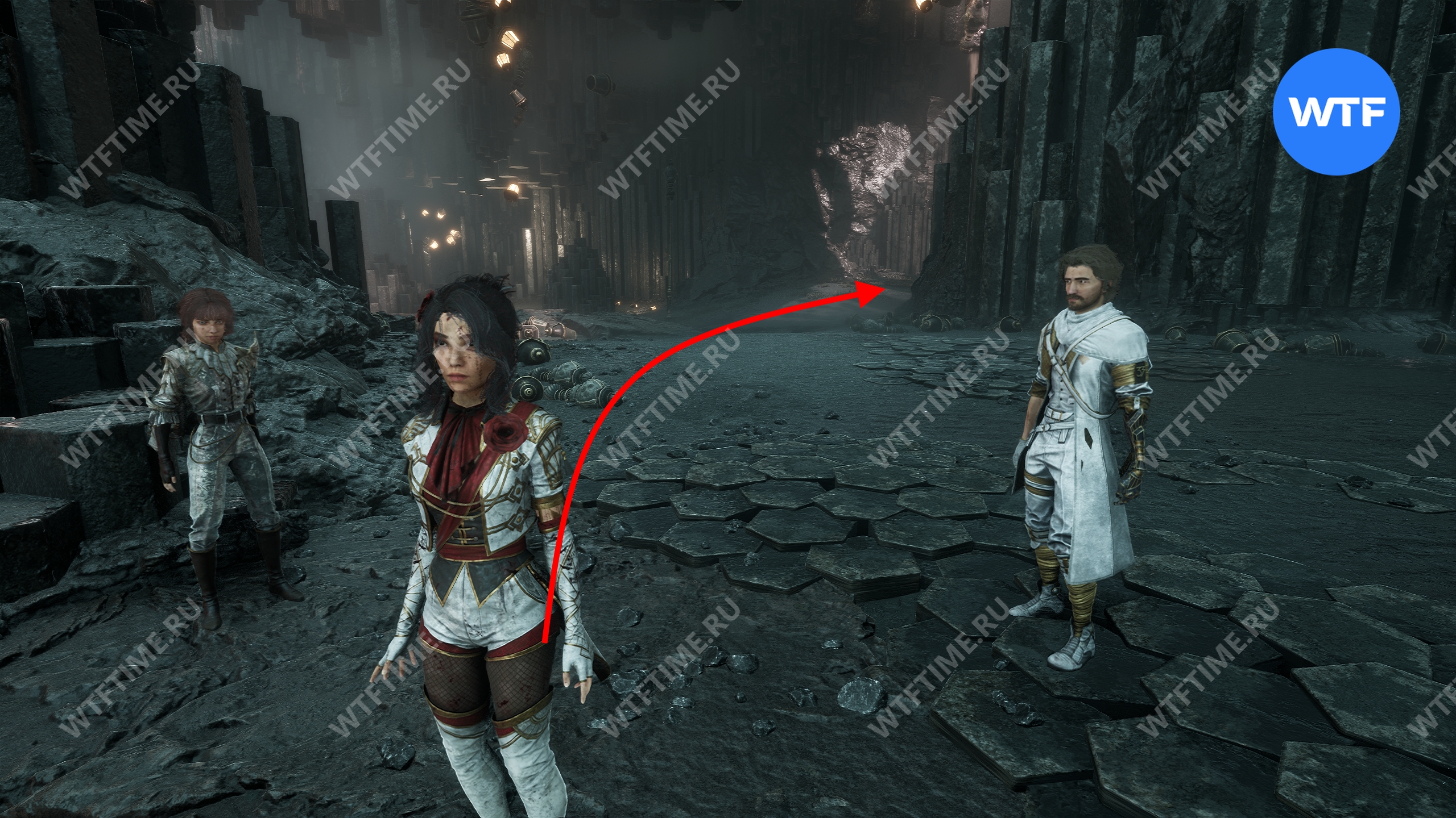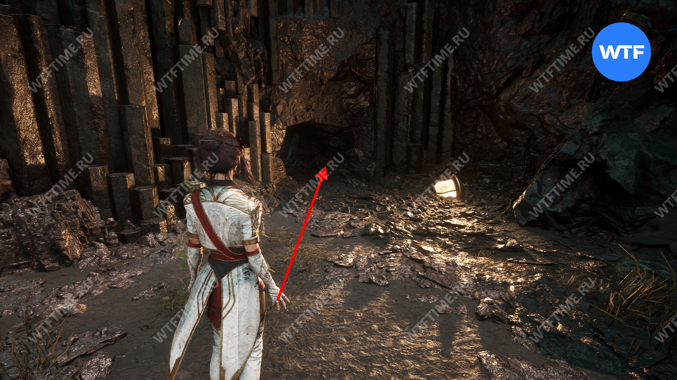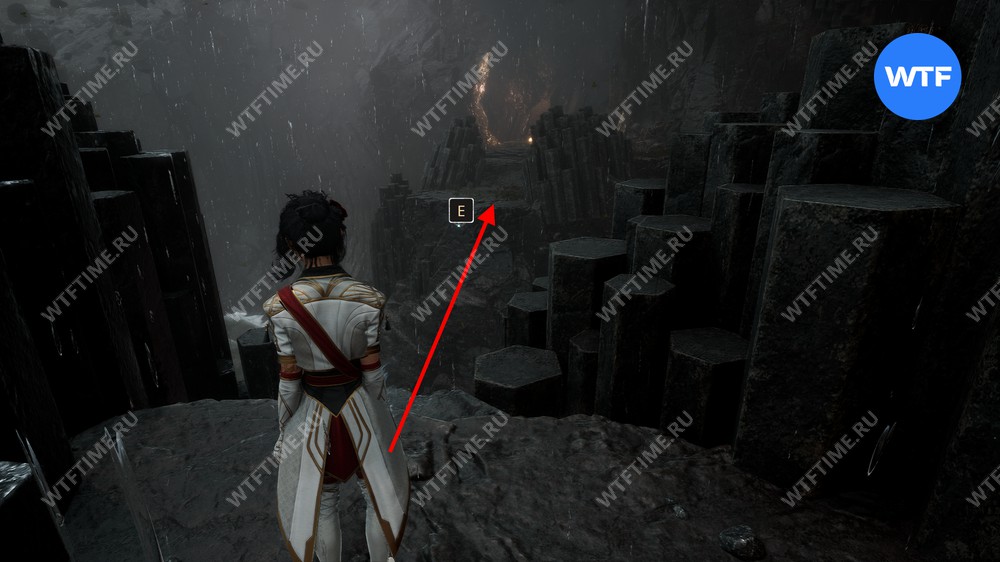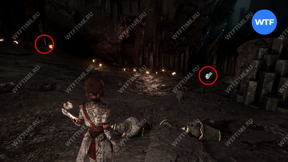 Пройдите по этому тоннелю до конца, а затем на развилке возле деревянной телеги идите направо. Переберитесь на другую сторону по опорам на стене и в итоге доберетесь до белого Шестиграна, который попросит вас принести ему камни.