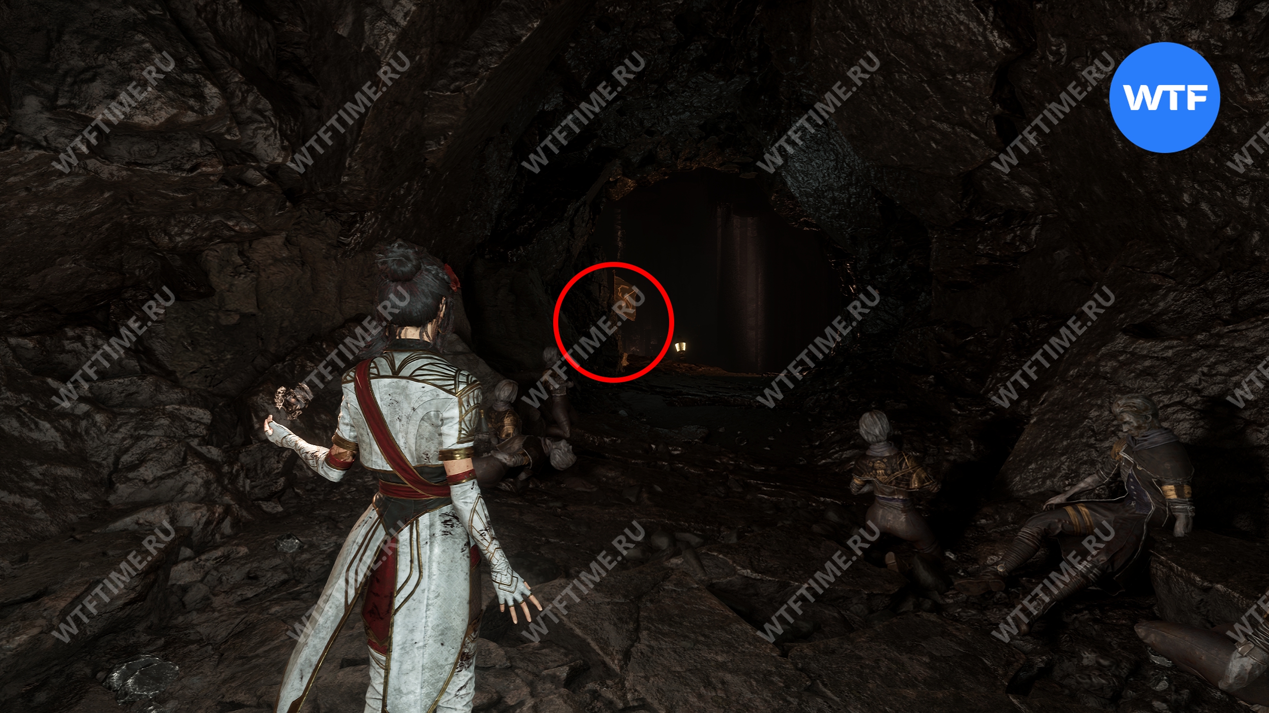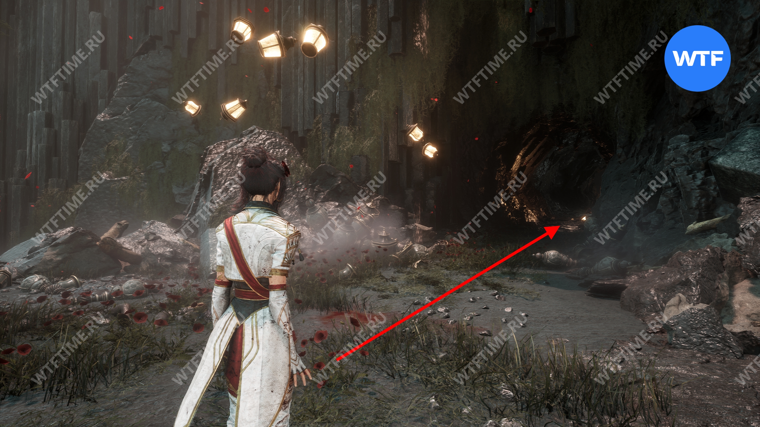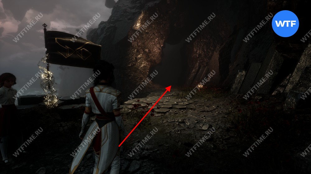 От флага идите вперед, переберитесь через пропасть, а затем продолжайте идти по дорожке с фонарями, пока не доберетесь до веревки, ведущей в нижнюю часть пещеры.