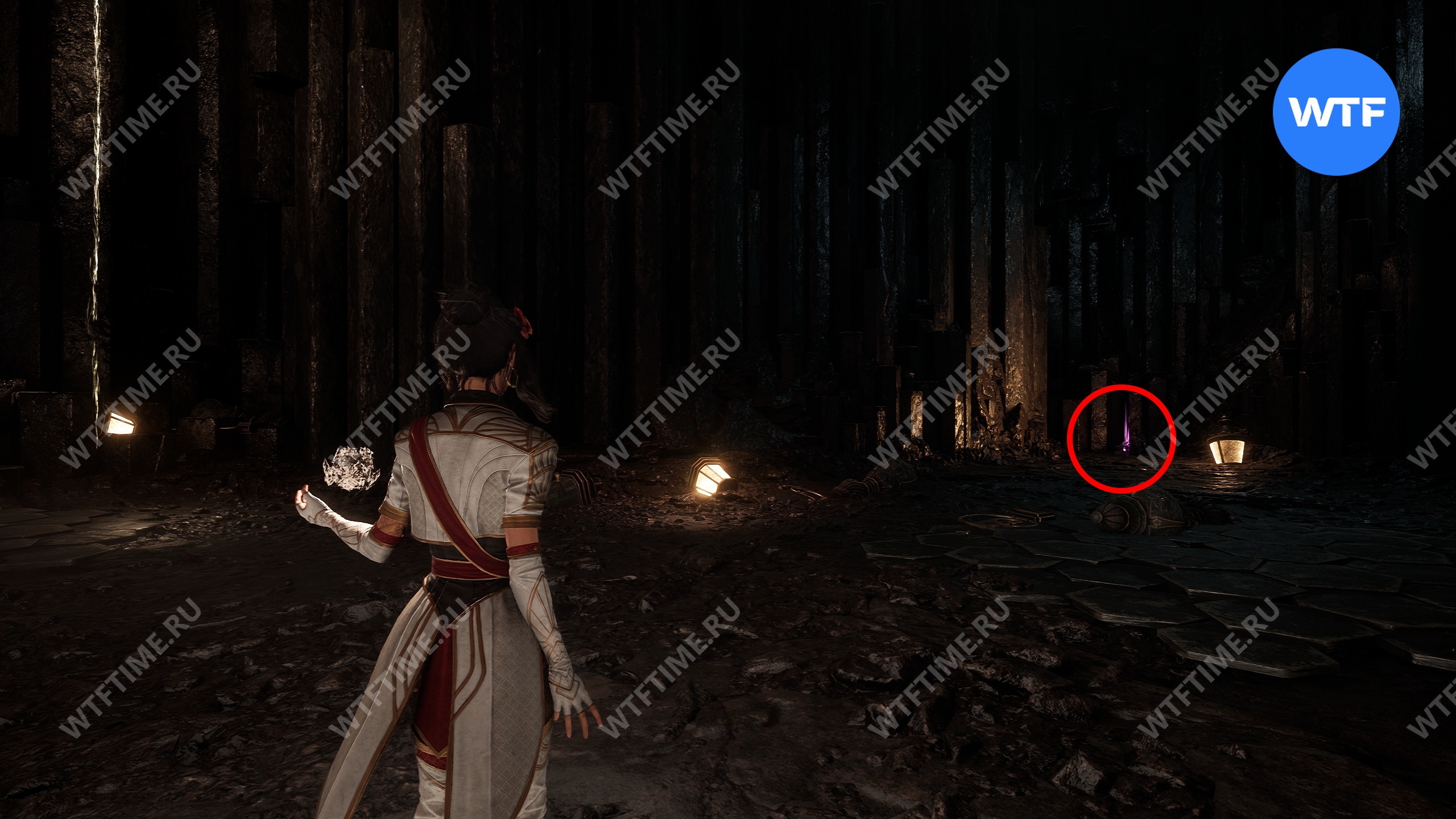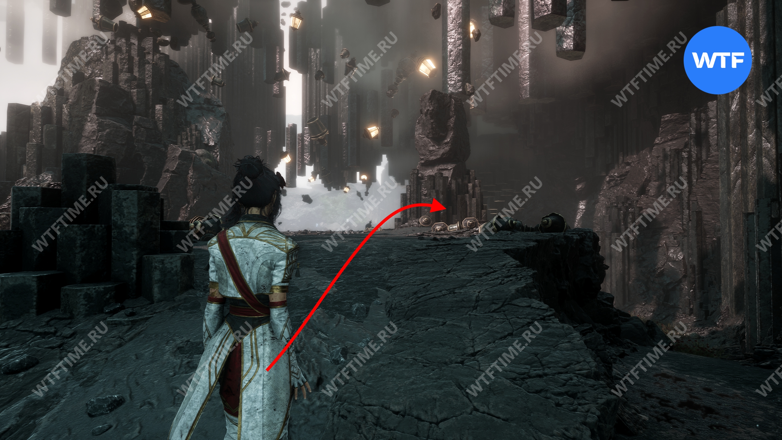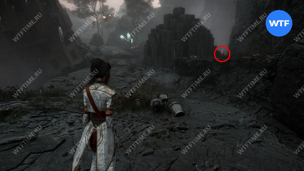 Вернитесь к тропинке, освещенной фонарями, и следуйте по ней вперед. Затем используйте точку захвата, чтобы перебраться на другую сторону. После этого справа от вас вы найдете 790 хромы.
