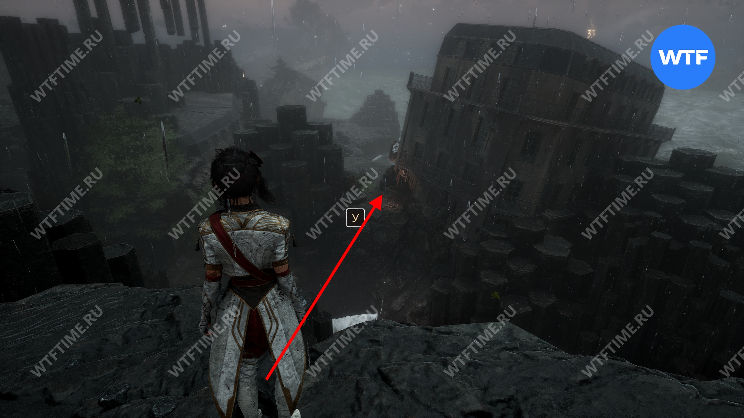 Теперь вернитесь обратно к развилке с двумя зданиями и используйте точку захвата, чтобы перебраться в здание справа.