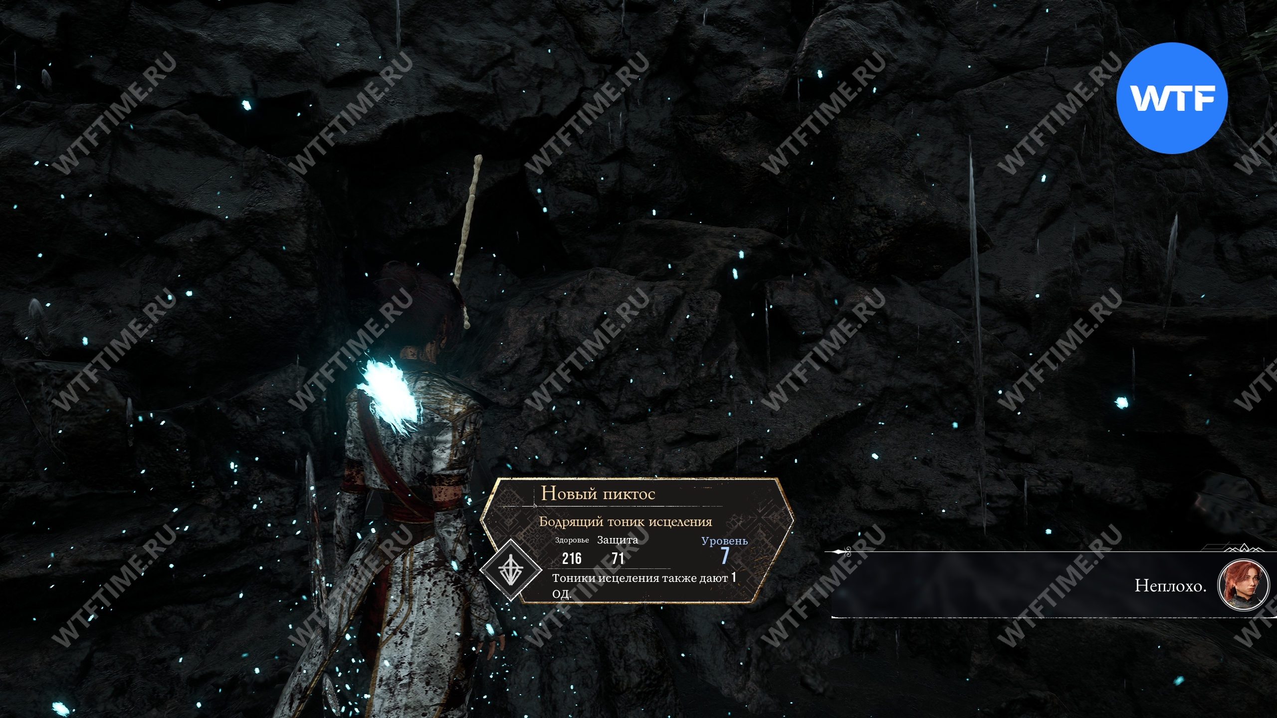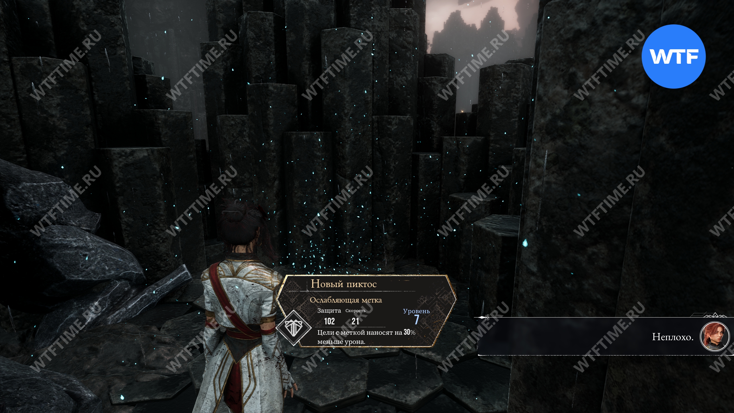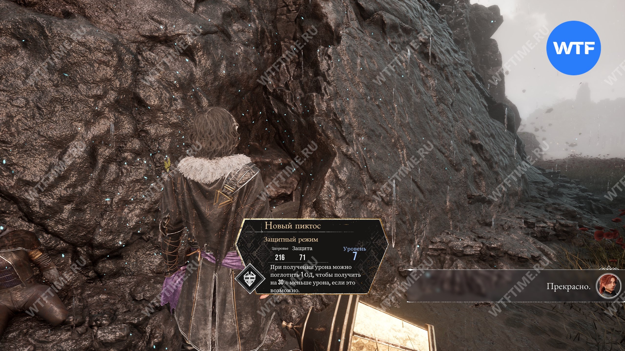 Сразу же после прохода через портал слева от вас вы увидите пиктос «Защитный режим» (уровень 7, здоровье 216, защита 71), дающий возможность поглотить 1 ОД, чтобы получить на 30% урона меньше, если это возможно.