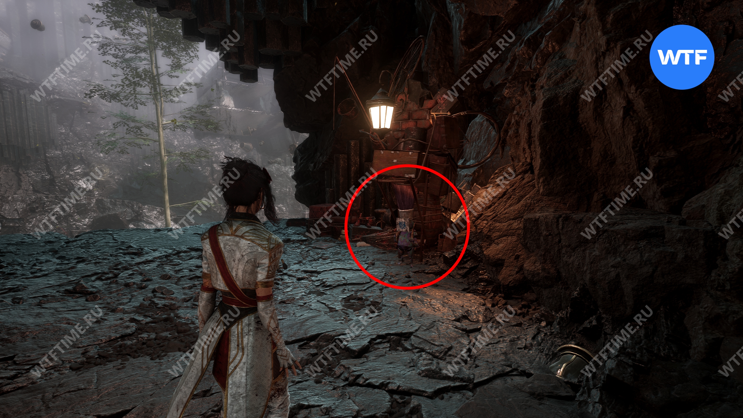 Слева от предыдущей колонны есть проход между скал, освещенный фонарем. Идите туда, а затем проберитесь через небольшой лаз, чтобы добраться до торговца Джериджери. У него можно купить стрижку для Сиэль «Хвостик».