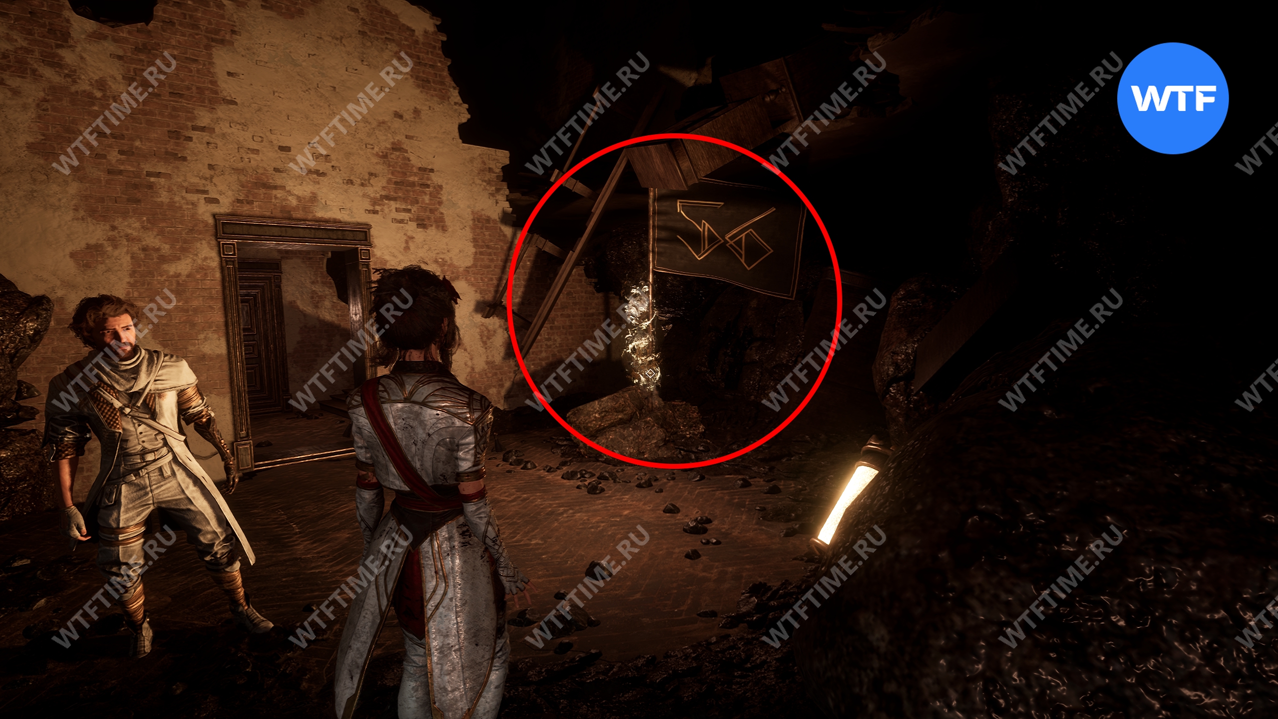 Продолжайте идти вперед по этому пути, пока не зайдете внутрь здания с флагом экспедиции «Затопленные постройки».