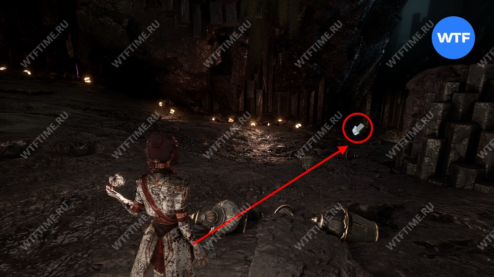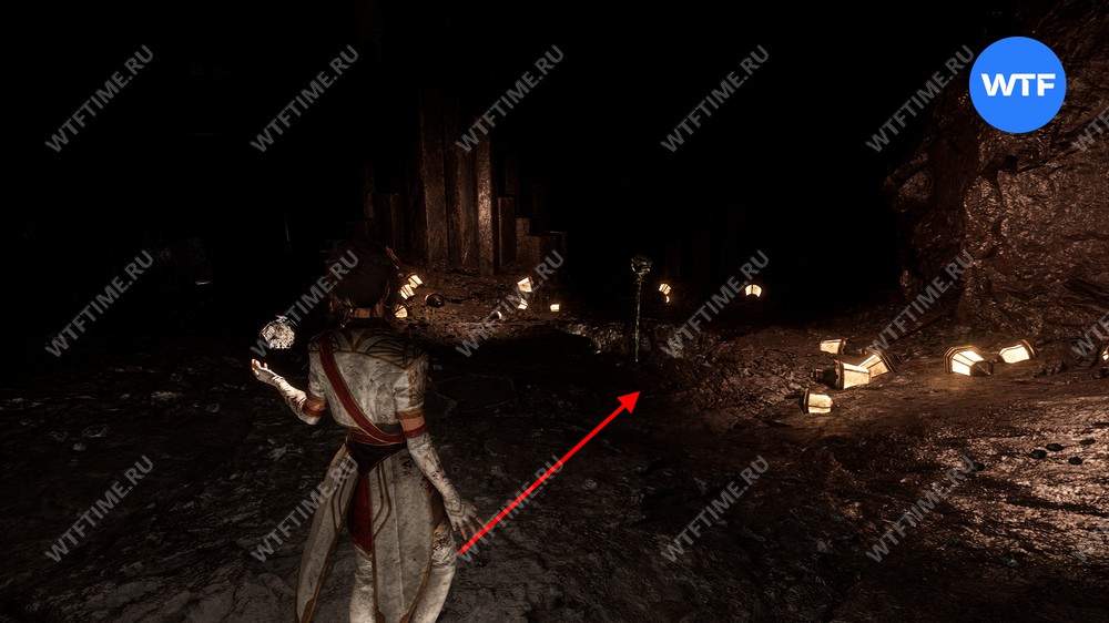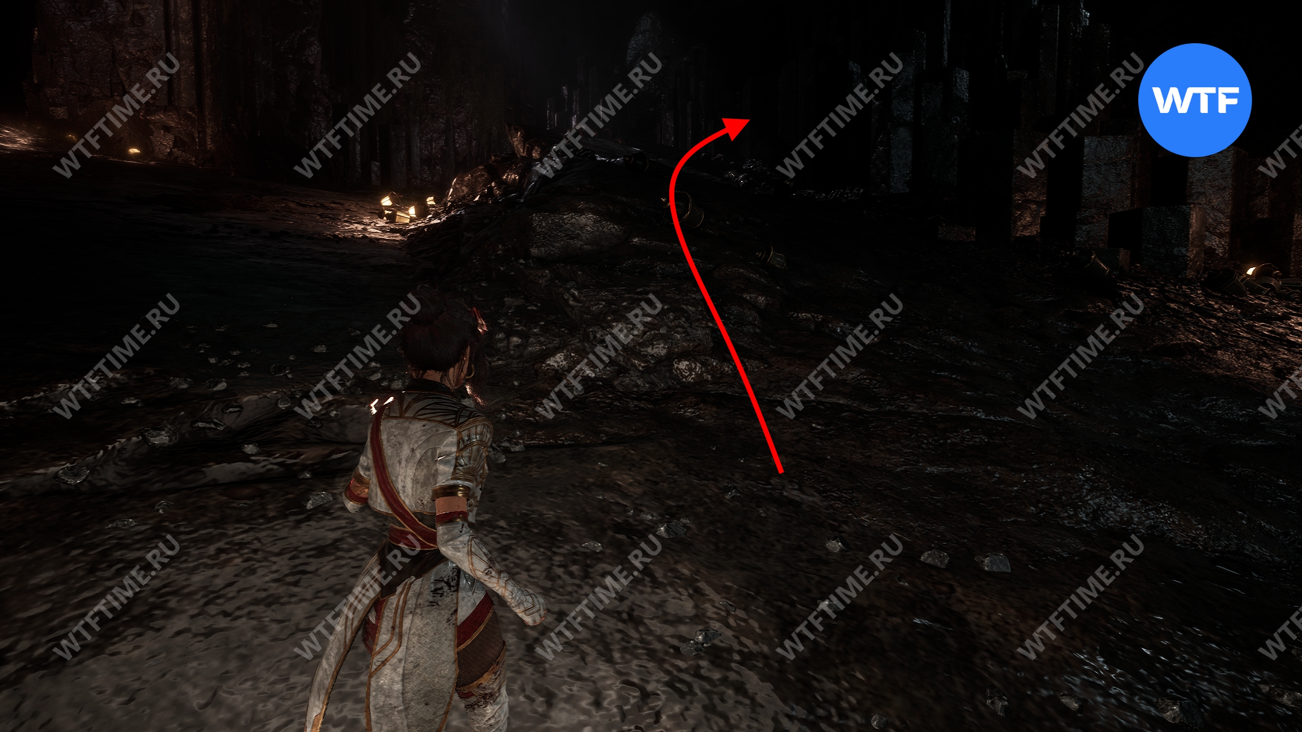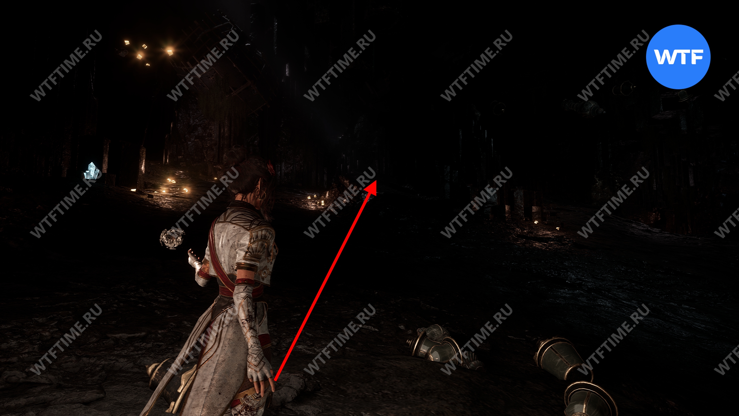 Затем вернитесь обратно к веревке. Если стать к ней спиной, то можно легко заметить три пятна света перед вами. Идите к центральному, а затем поднимитесь по небольшому склону справа от него. Это приведет вас ко второму синему кристаллу.