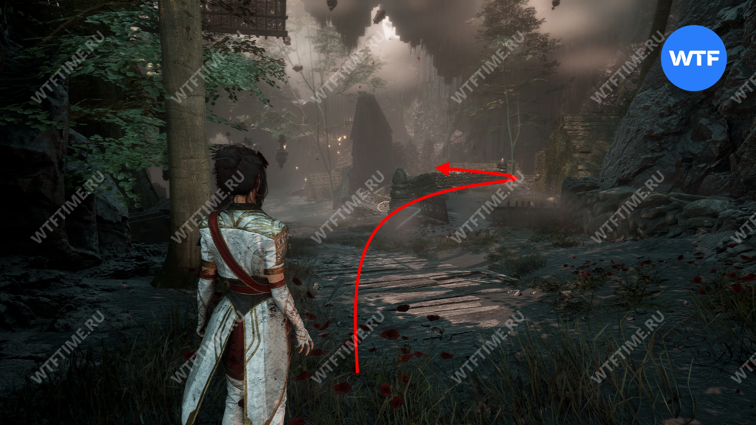 От этого флага пройдите вниз по дорожке, а затем у второго здания сверните направо. На развилке поверните налево и пройдите через тоннель, освещенный фонарями, до самого конца.