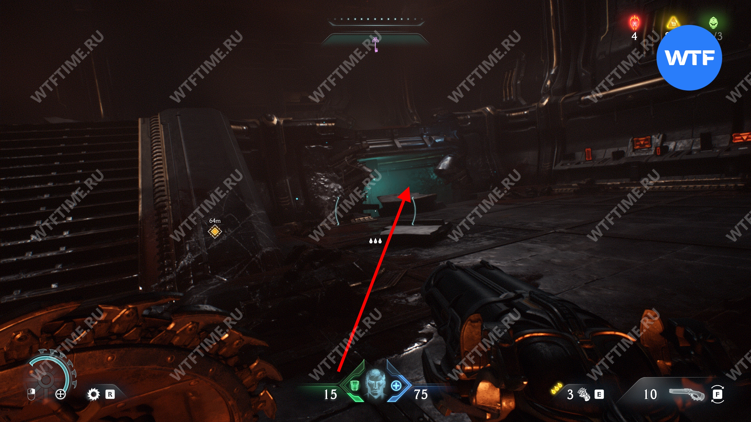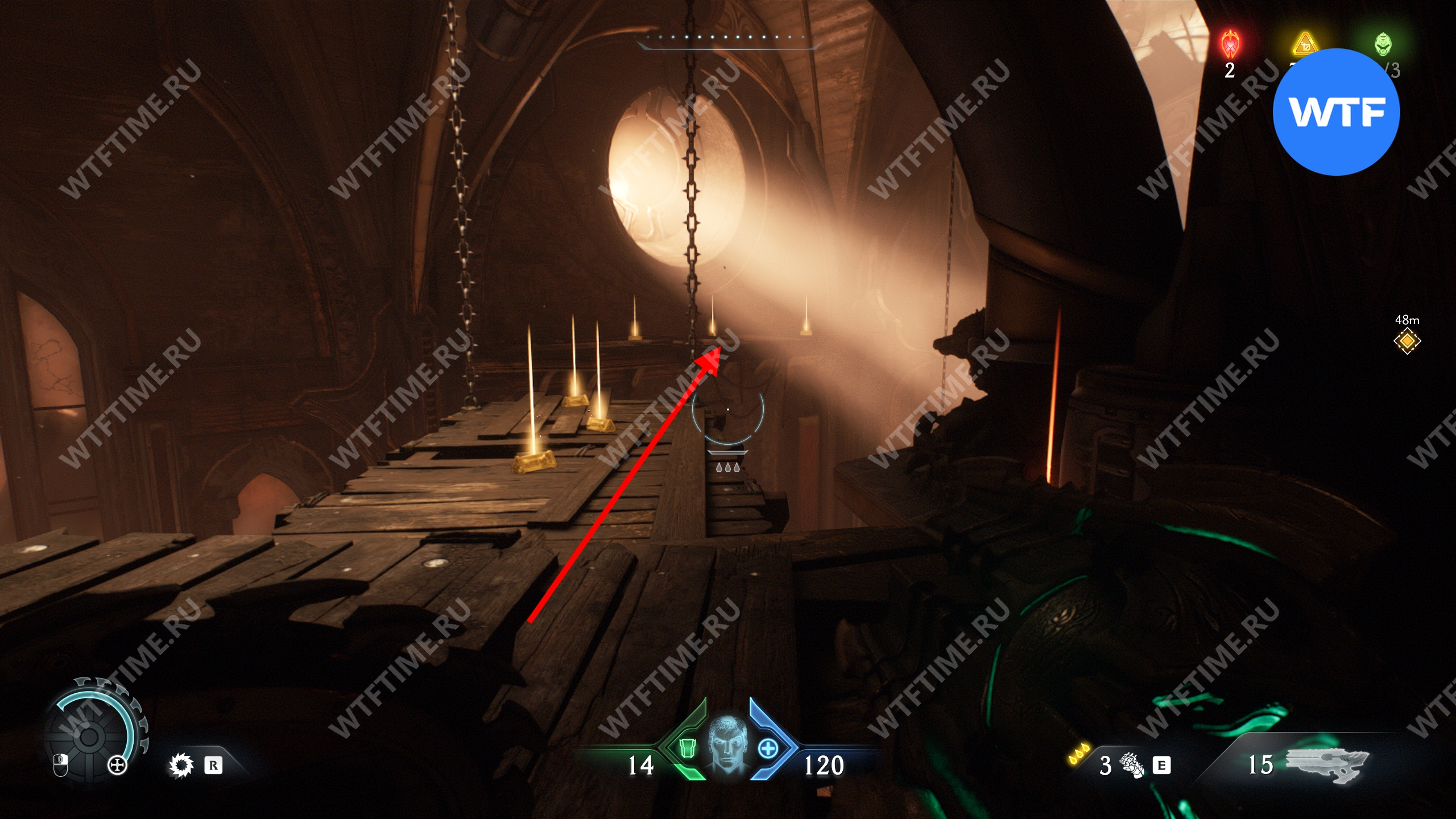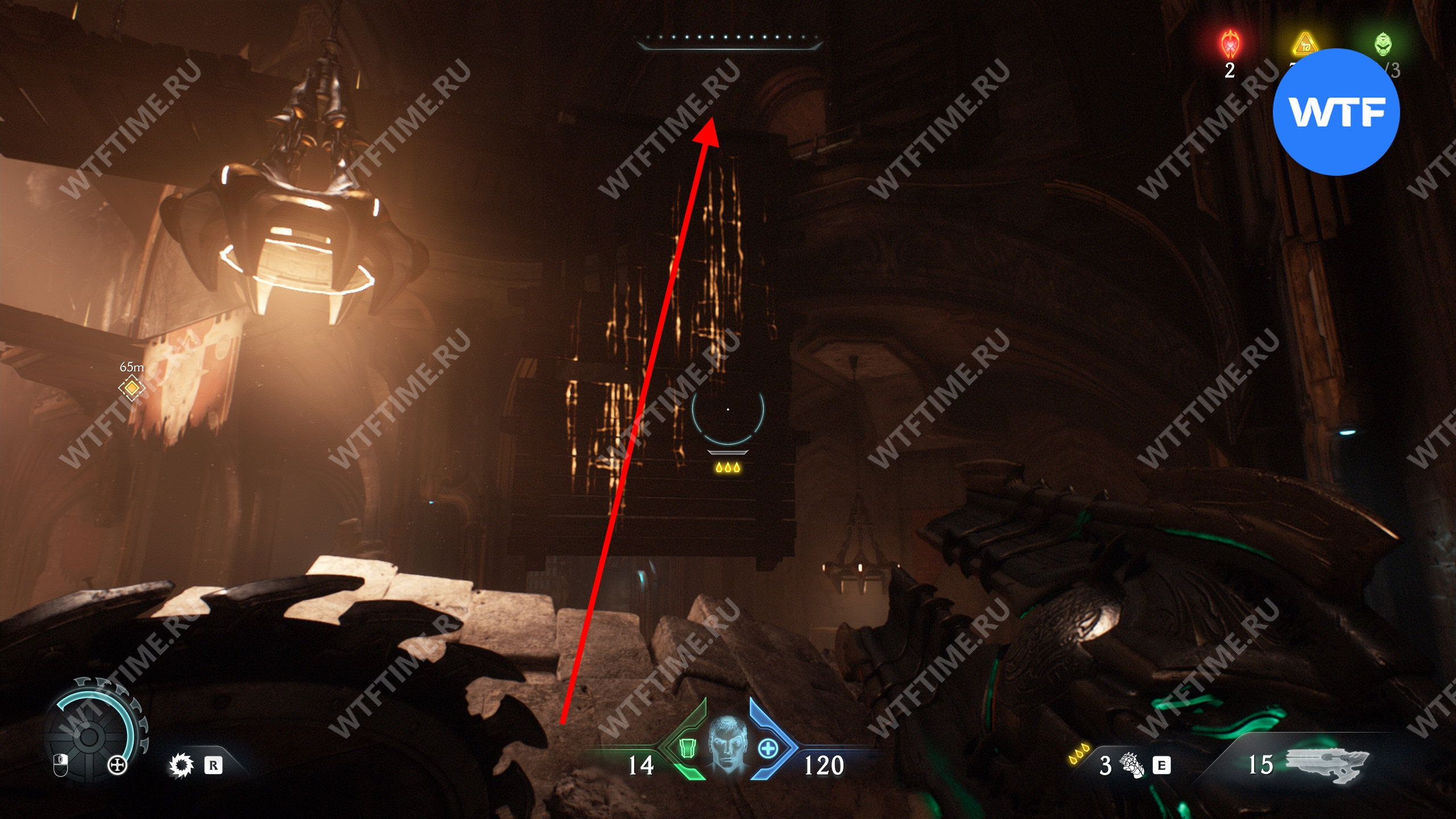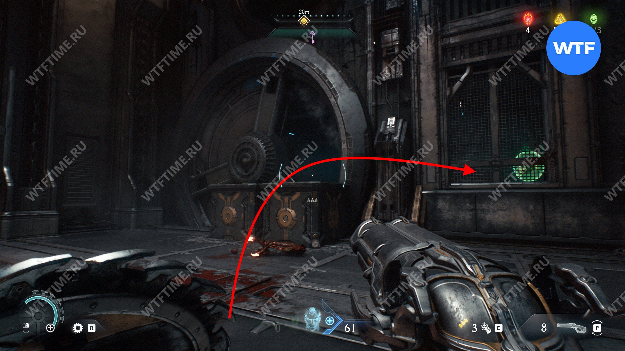 Пройдите через точку невозврата, затем зачистите платформу от врагов и поищите за дырой в стене слева цепь, в которую вы сможете кинуть свой щит. Затем вернитесь немного назад, поднимитесь на ящики и пройдите через остановившийся вентилятор, чтобы добраться до этого секрета.