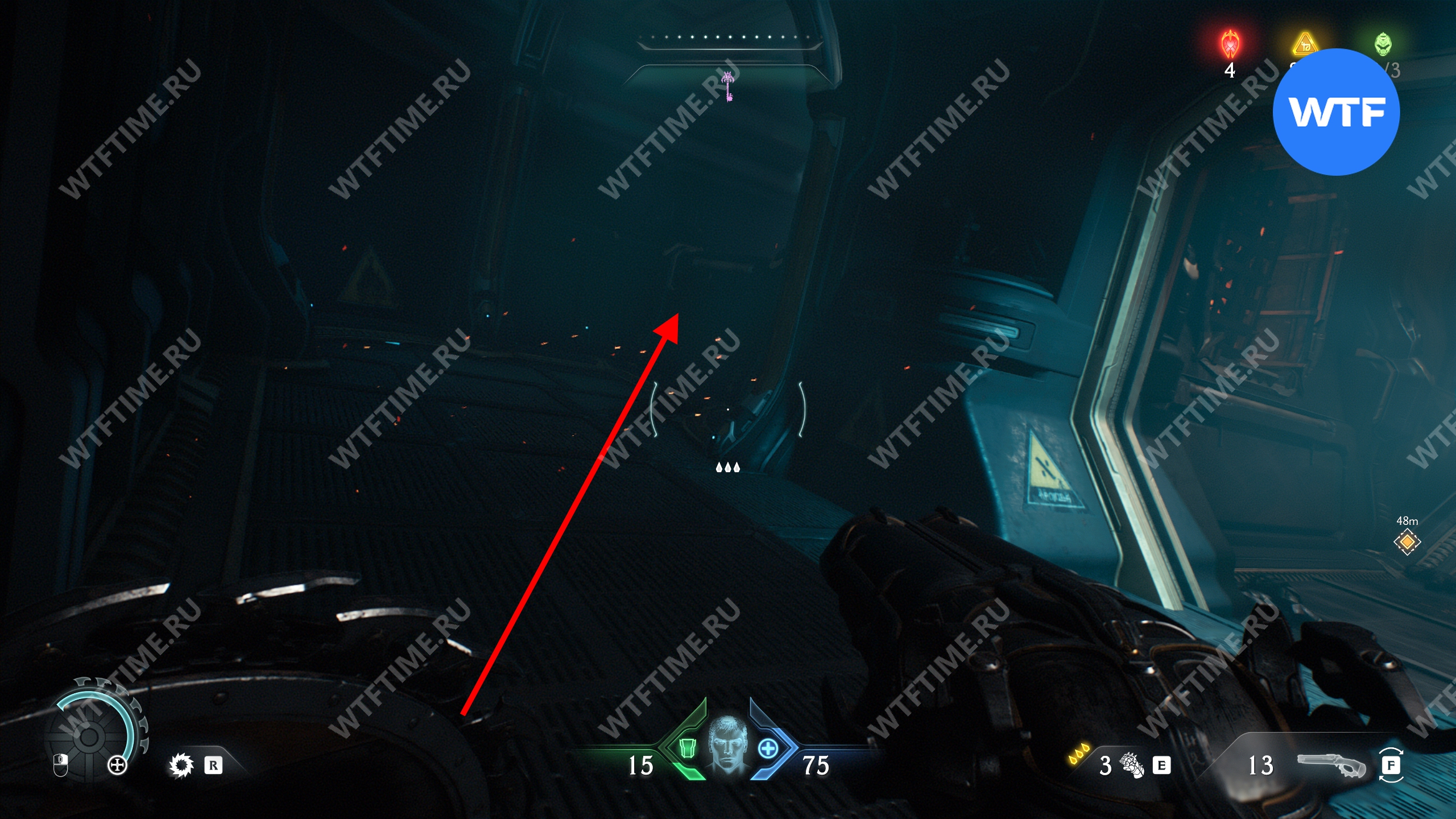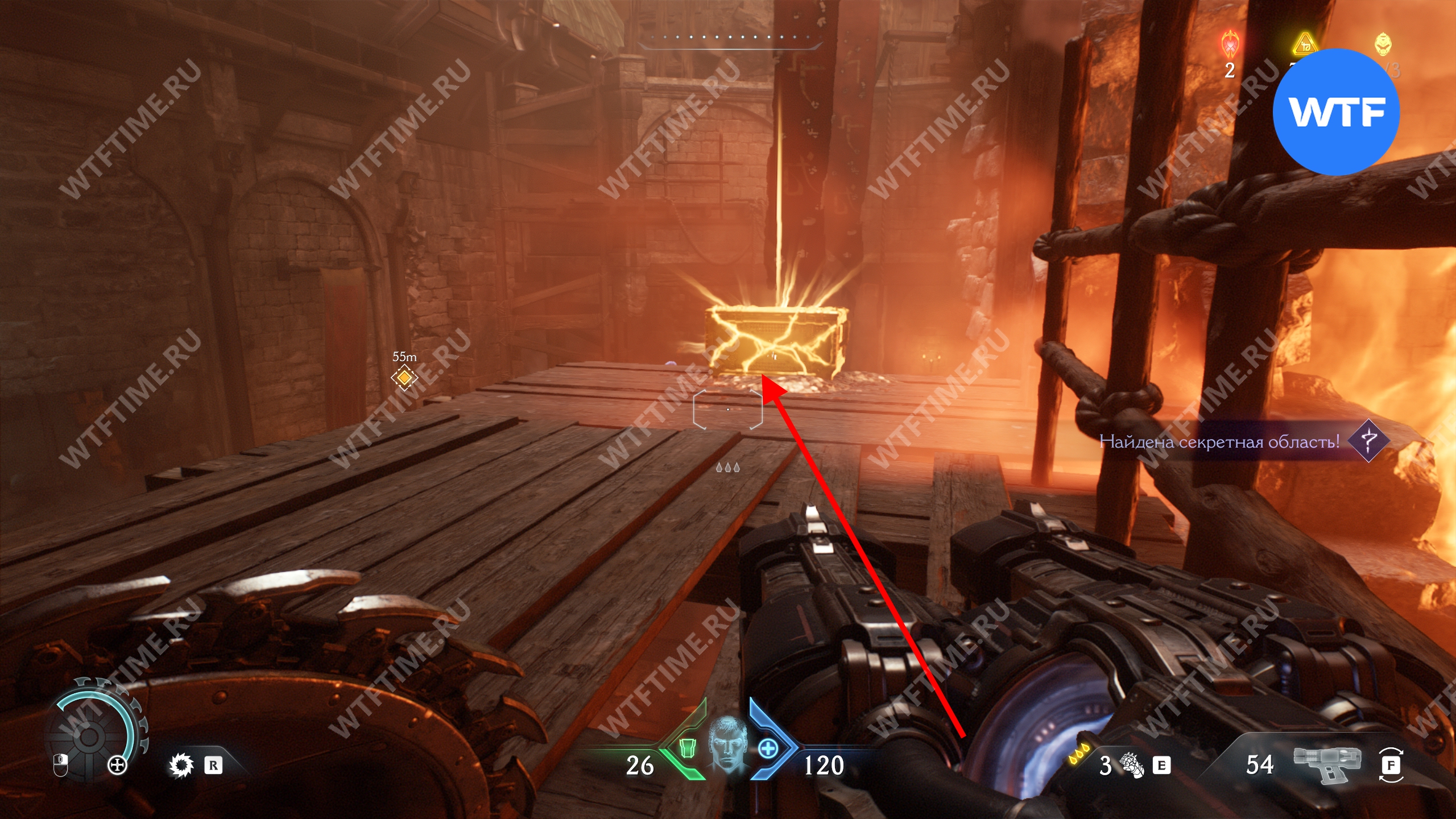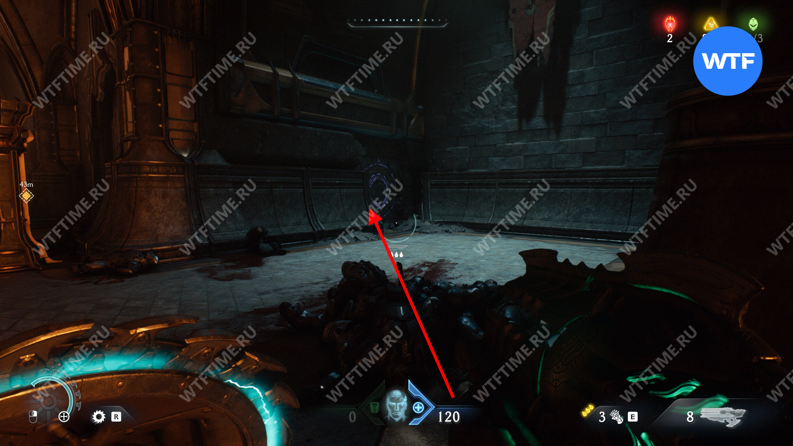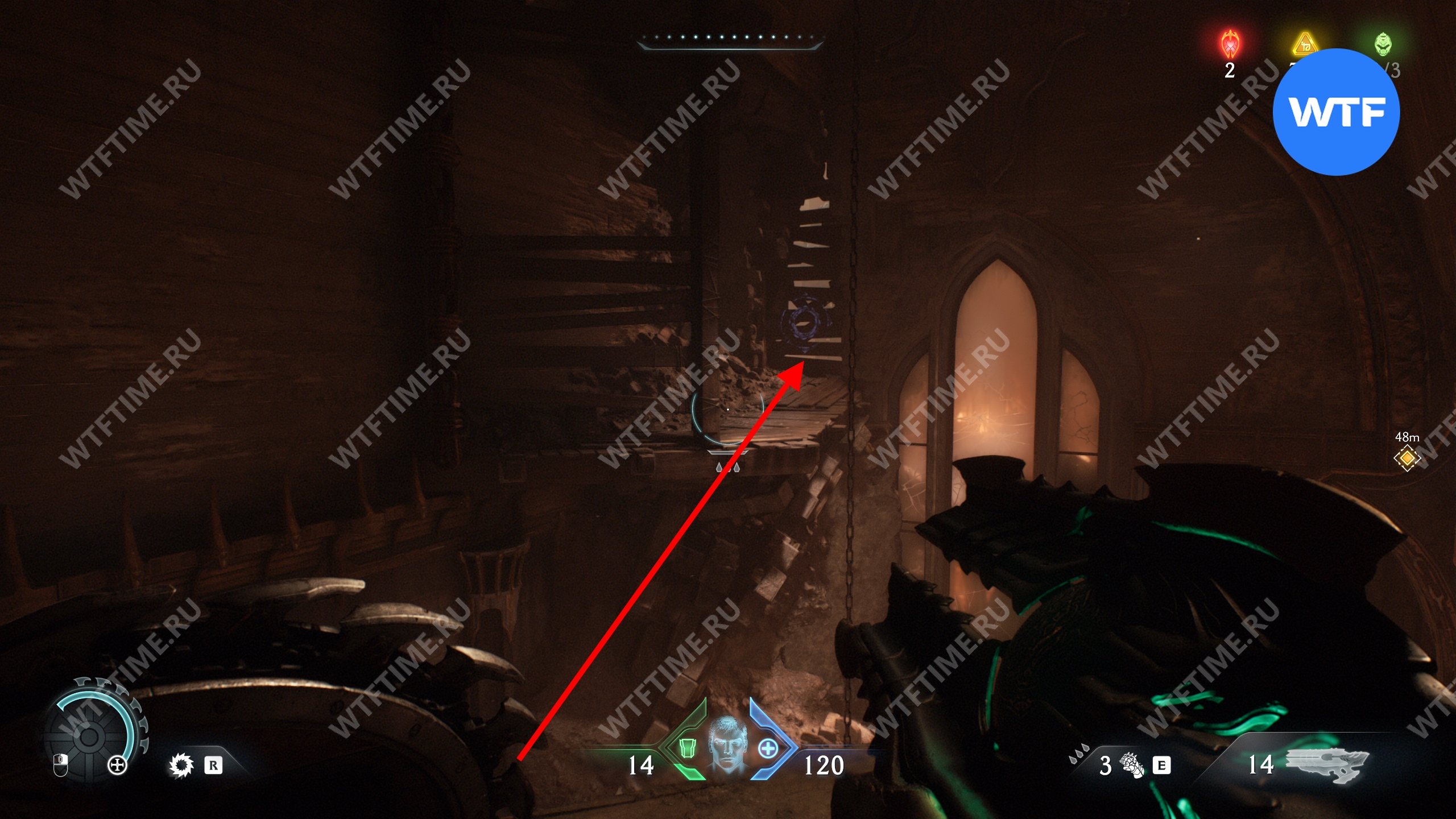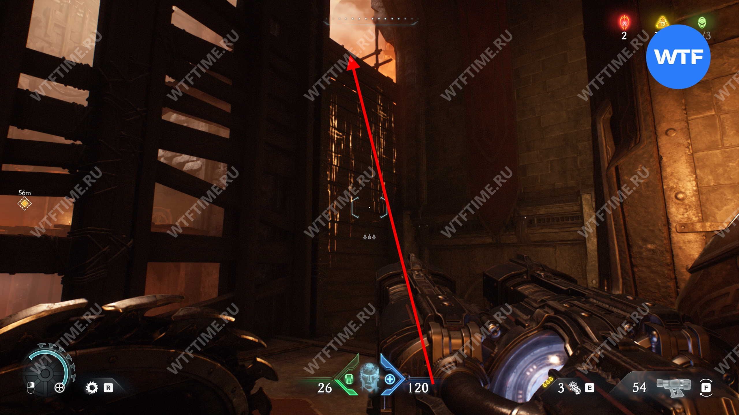 Пройдите через точку невозврата, затем зачистите платформу от врагов и поищите за дырой в стене слева цепь, в которую вы сможете кинуть свой щит. Затем вернитесь немного назад, поднимитесь на ящики и пройдите через остановившийся вентилятор, чтобы добраться до этого секрета.