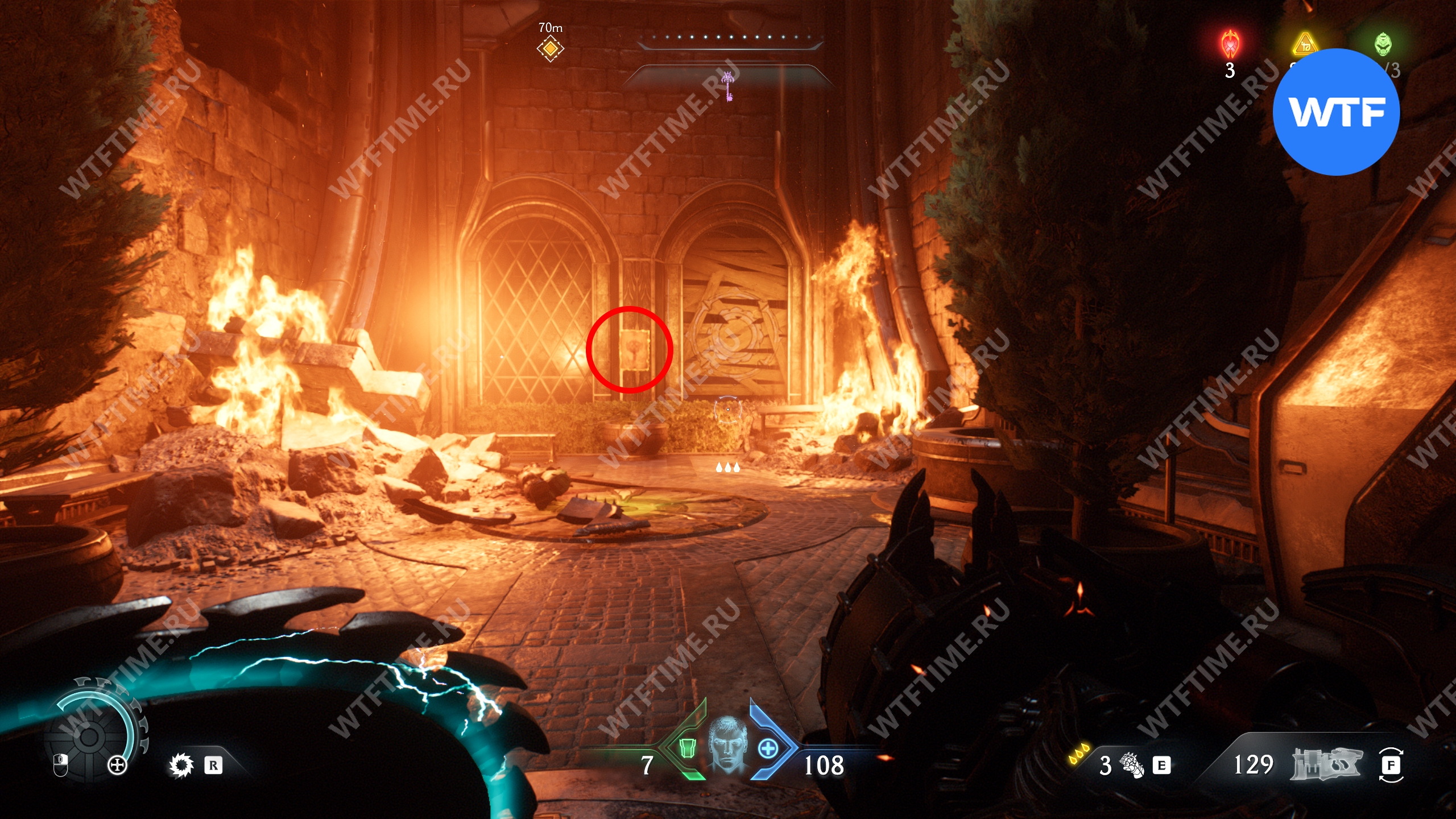 Продолжайте идти вперед, пока не окажетесь на большой открытой площадке с горящими деревьями и двумя запертыми фиолетовыми воротами. Здесь есть сразу несколько секретов, однако доступа к ним пока нет.