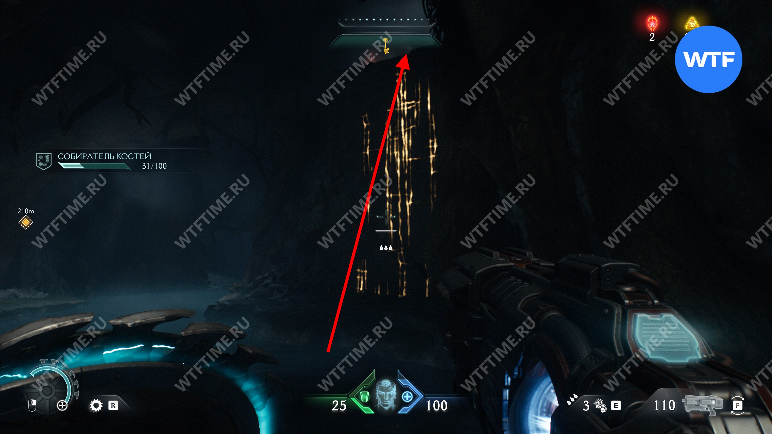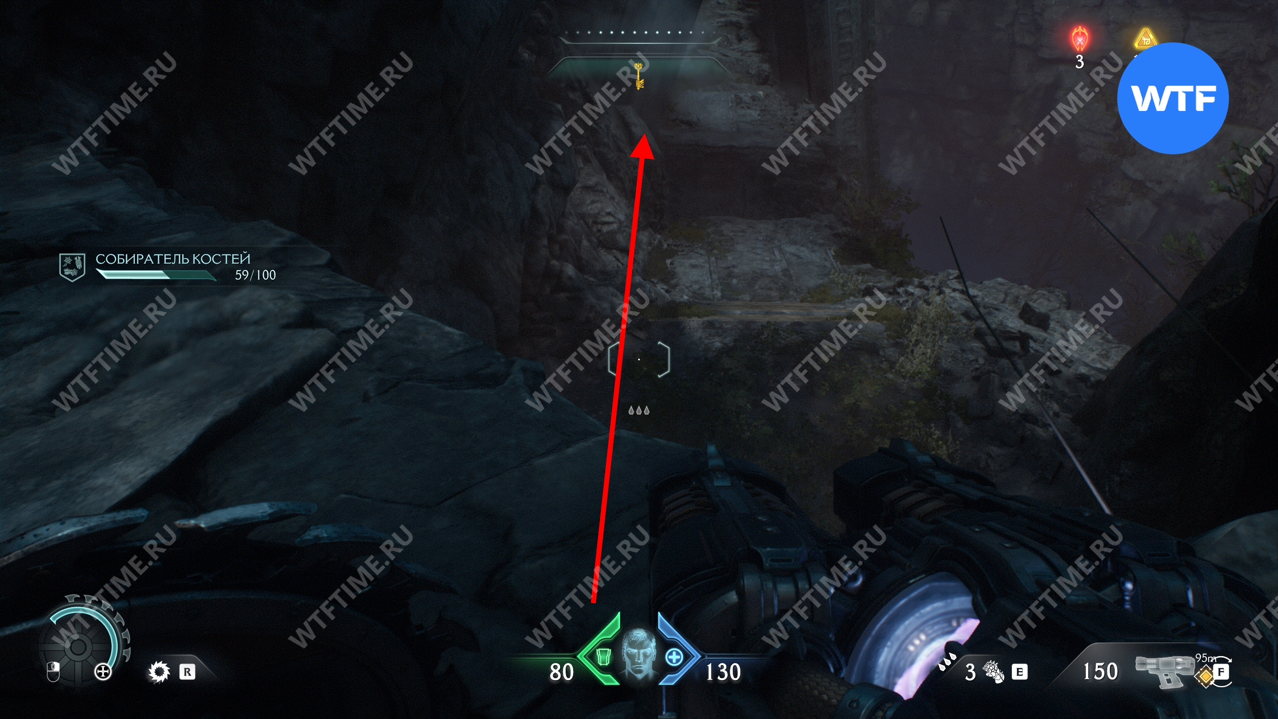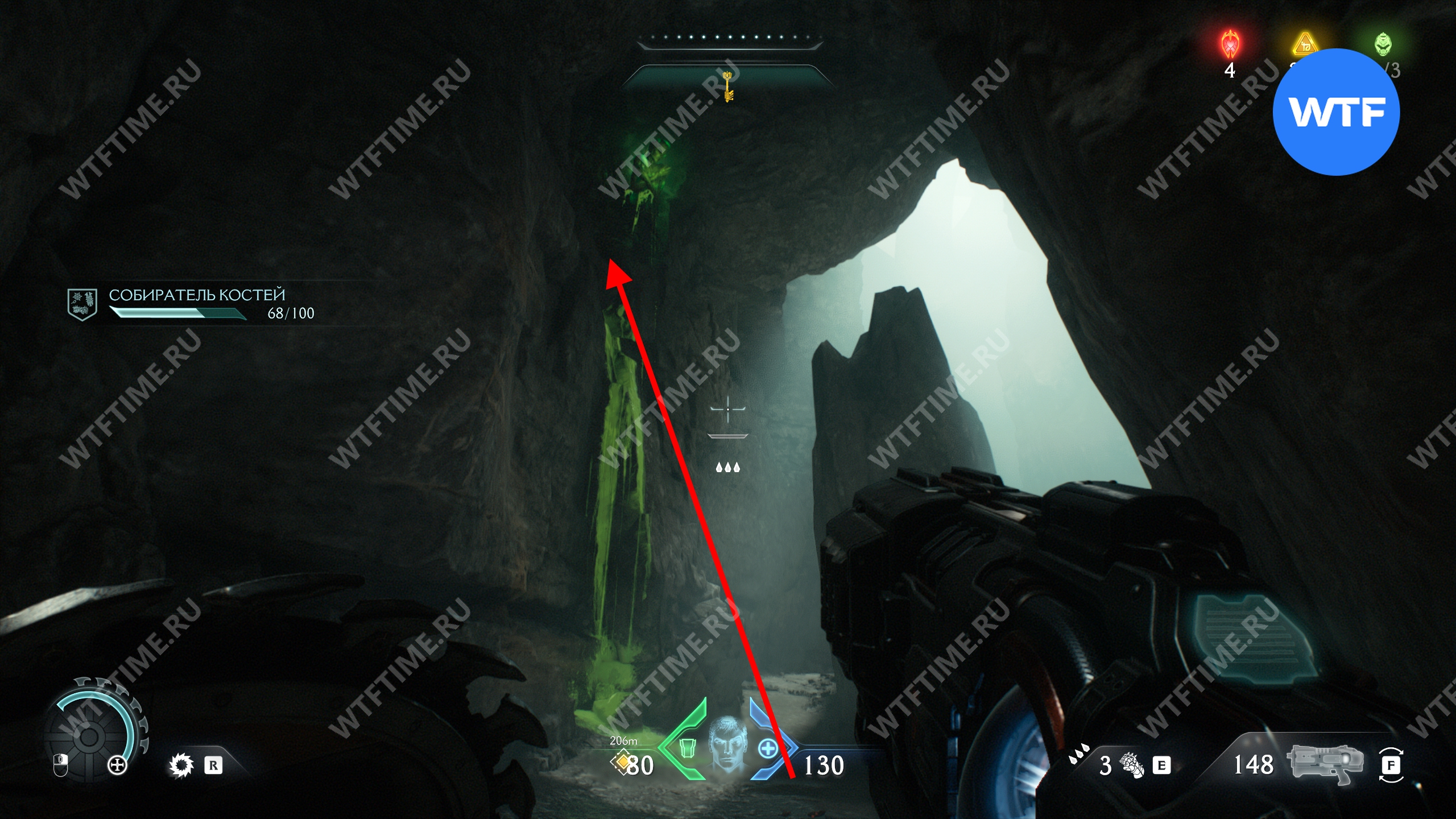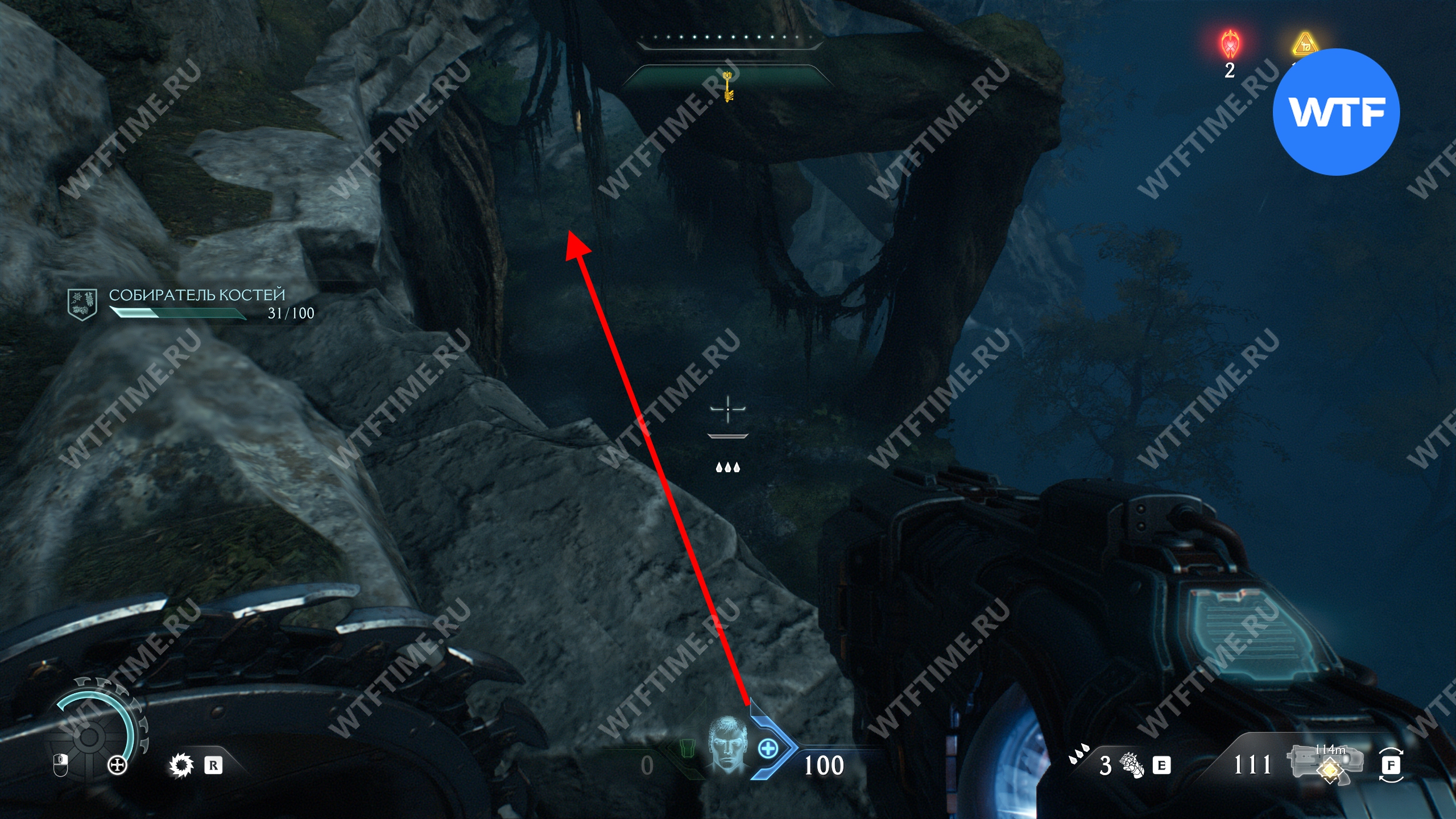 После того как вы спуститесь вниз на лифте и получите гранатомет, бегите по тропинке вперед, пока не увидите слева зеленый сгусток, к которому можно подтянуть себя щитом.