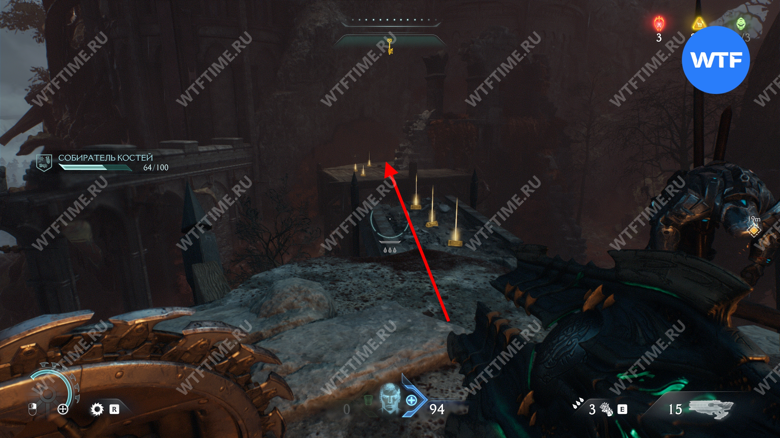 Примерно по центру основной области (рядом со значком черепа на карте), есть небольшая башня со строительными лесами, внутри которых находится статуя. Киньте щит в цепь, которая её удерживает.