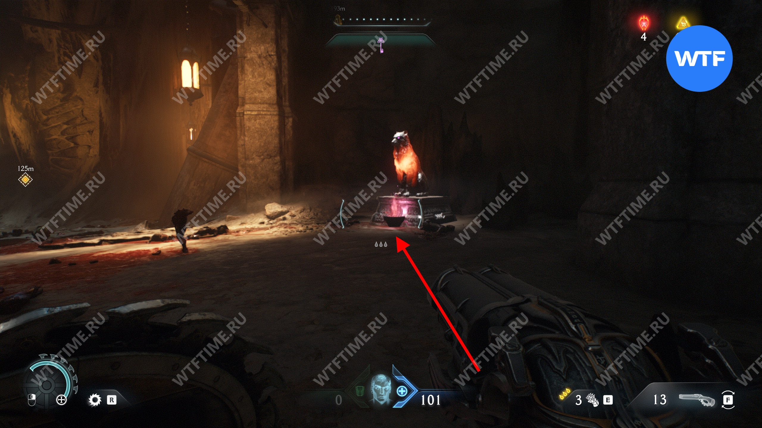 Теперь вернитесь к месту с призрачным камнем, мимо которого мы проходили вскоре после первой зарядки сердца. Последняя статуя волка находится справа сверху от алтаря с розовым барьером. Разбейте её щитом и сможете забрать призрачный камень.