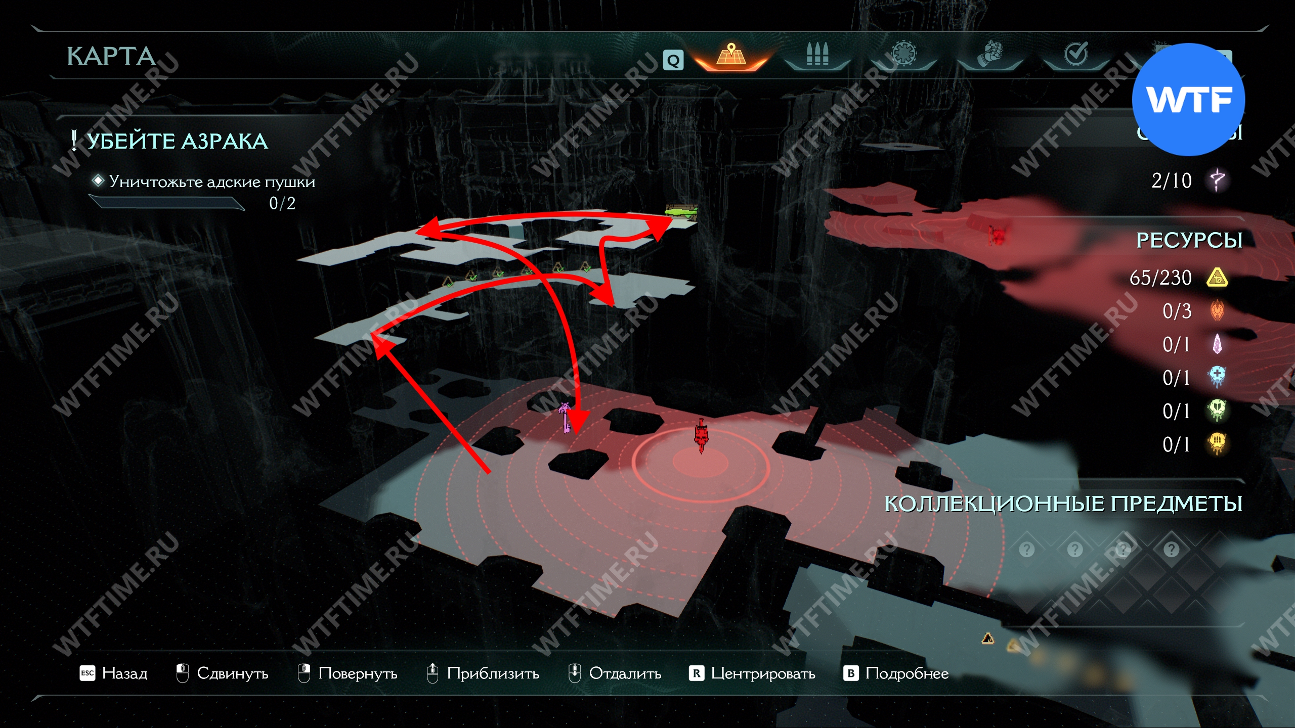 Пройдя через главные ворота, вы окажетесь в большой открытой области, где вам нужно уничтожить две адские пушки. Ваша первая цель — красная зона на западе, посреди которой находится фиолетовый ключ.