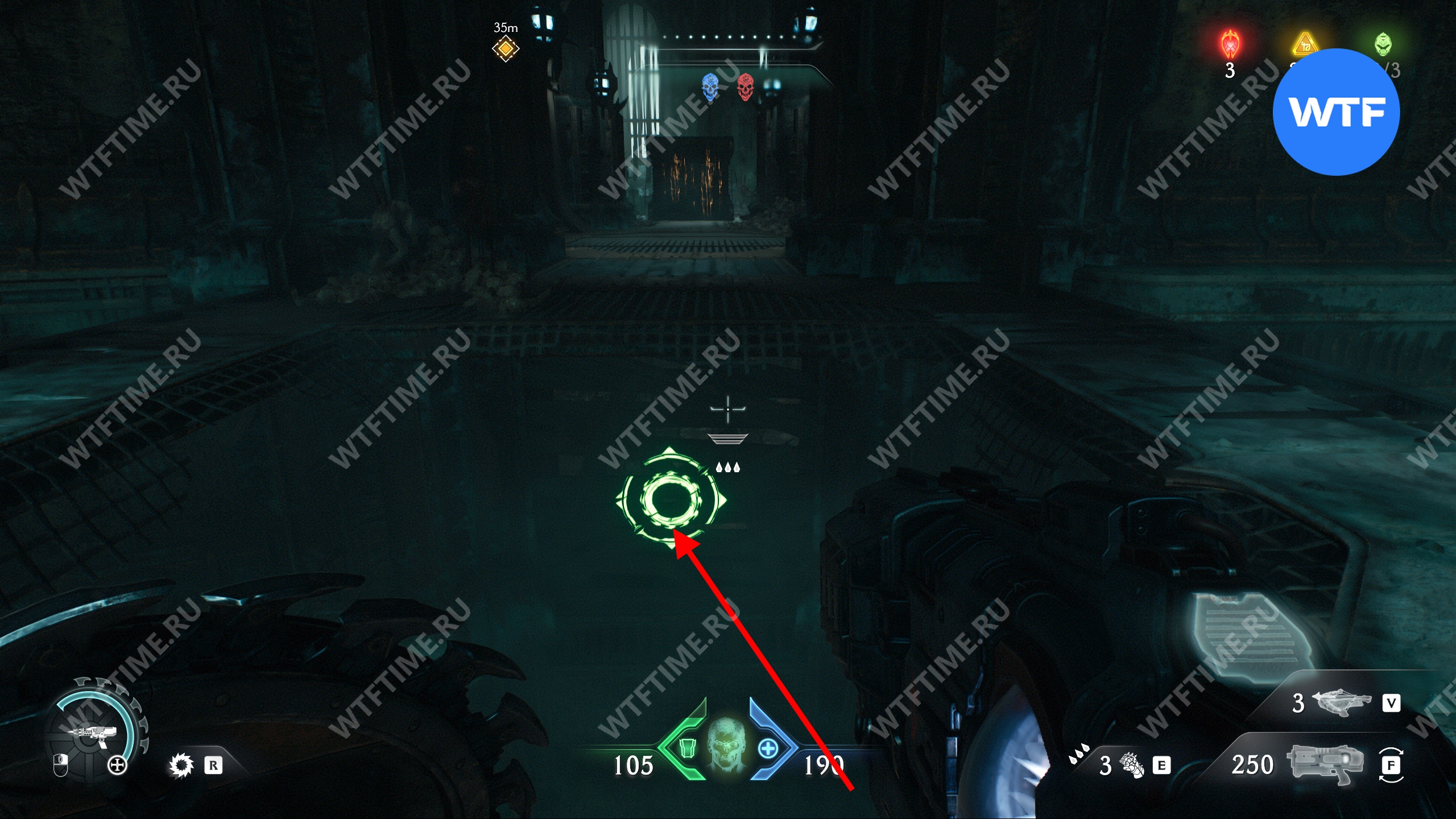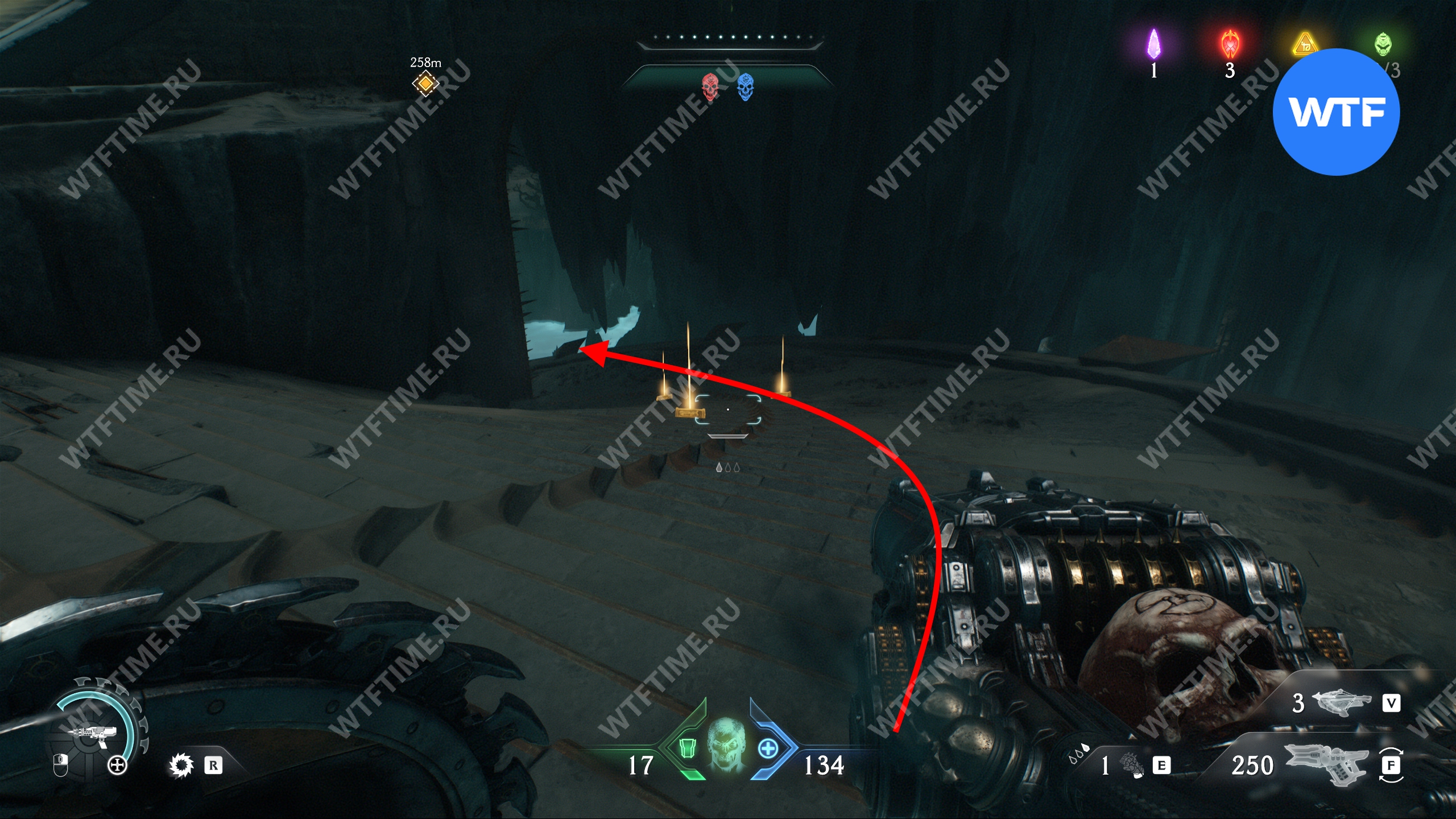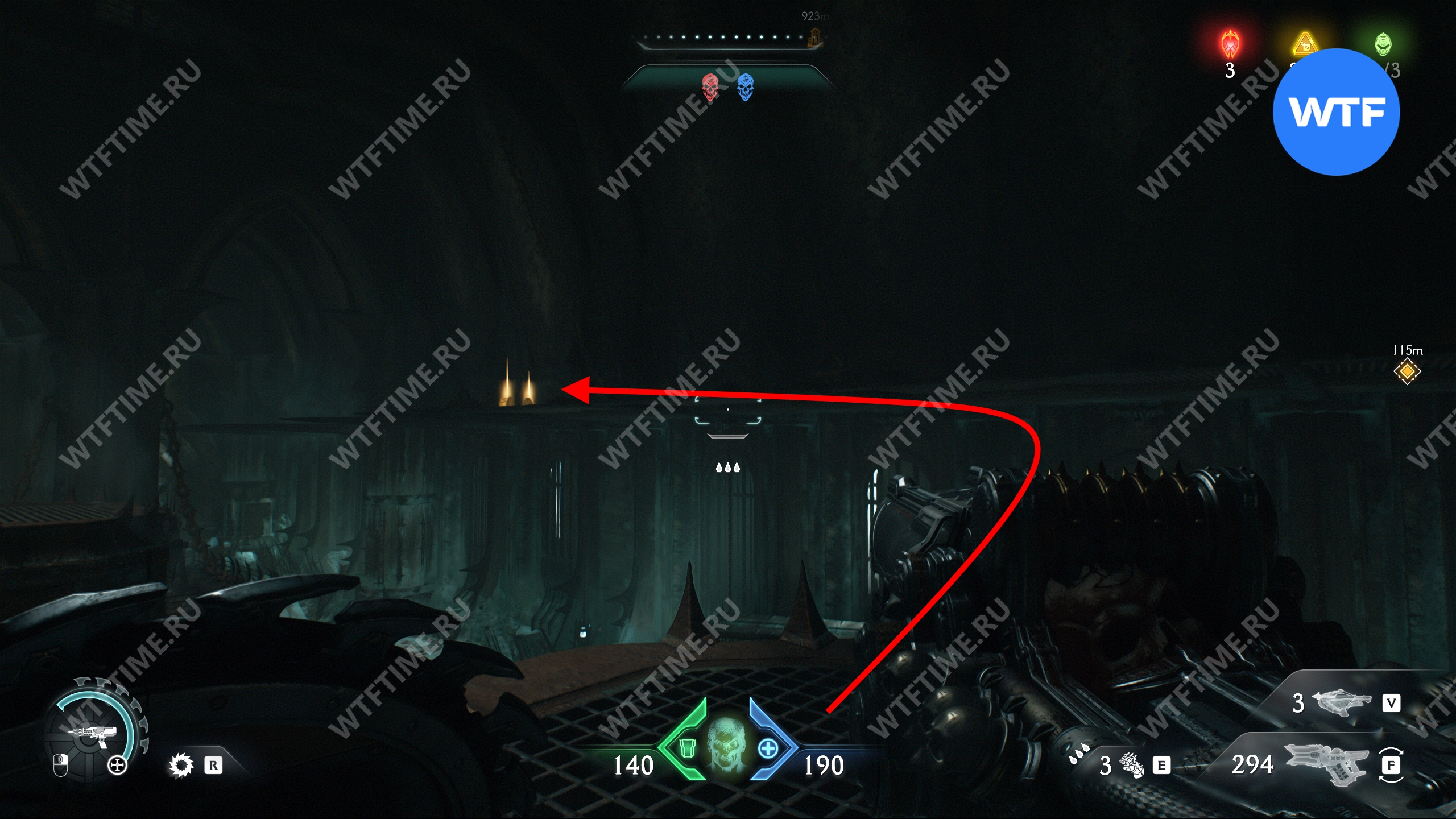 После предыдущего боя вы попадете в комнату с винтовой лестницей. У её основания есть стена, которую можно выбить при помощи щита. За ней вы увидите синюю шестеренку.