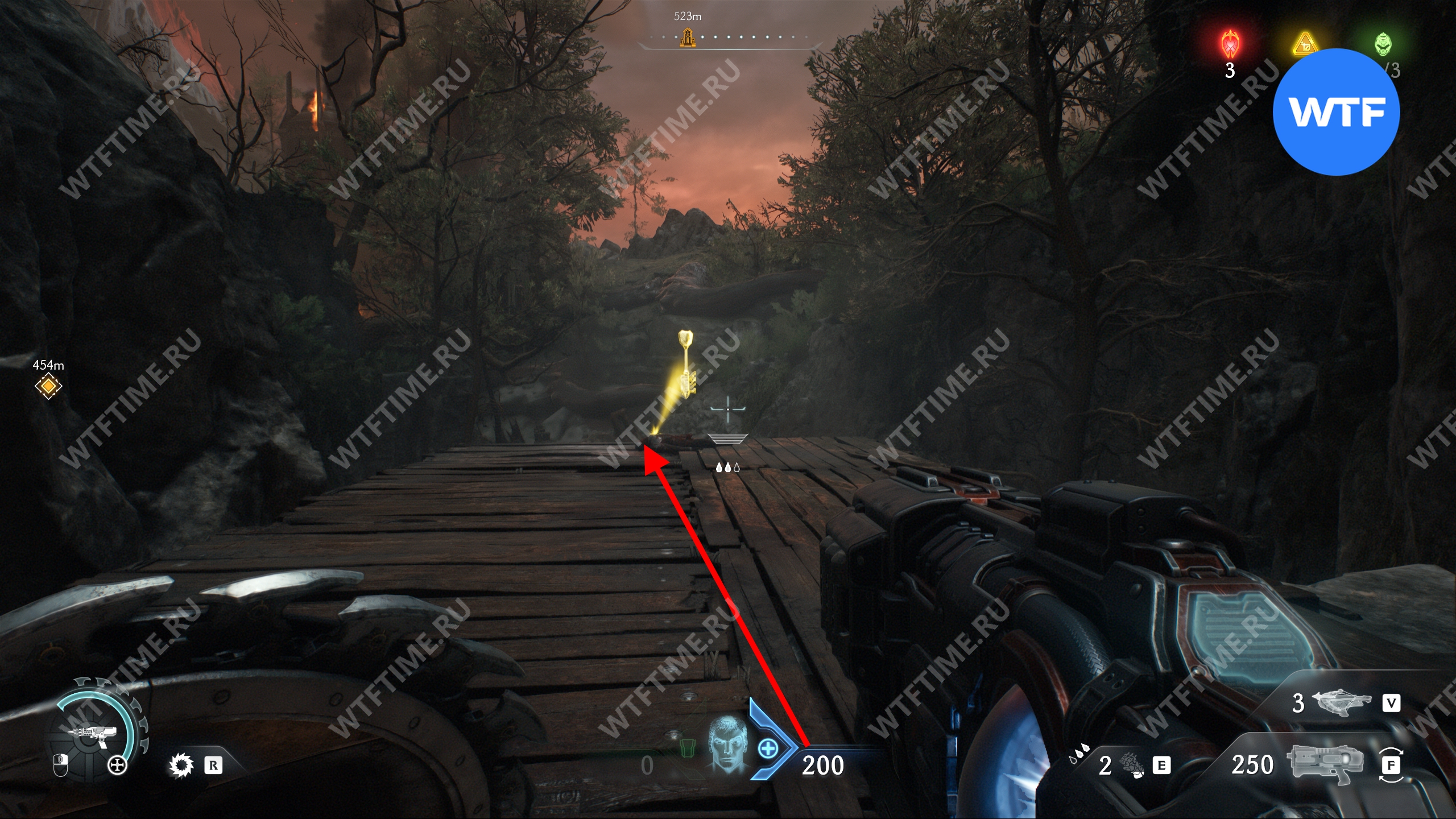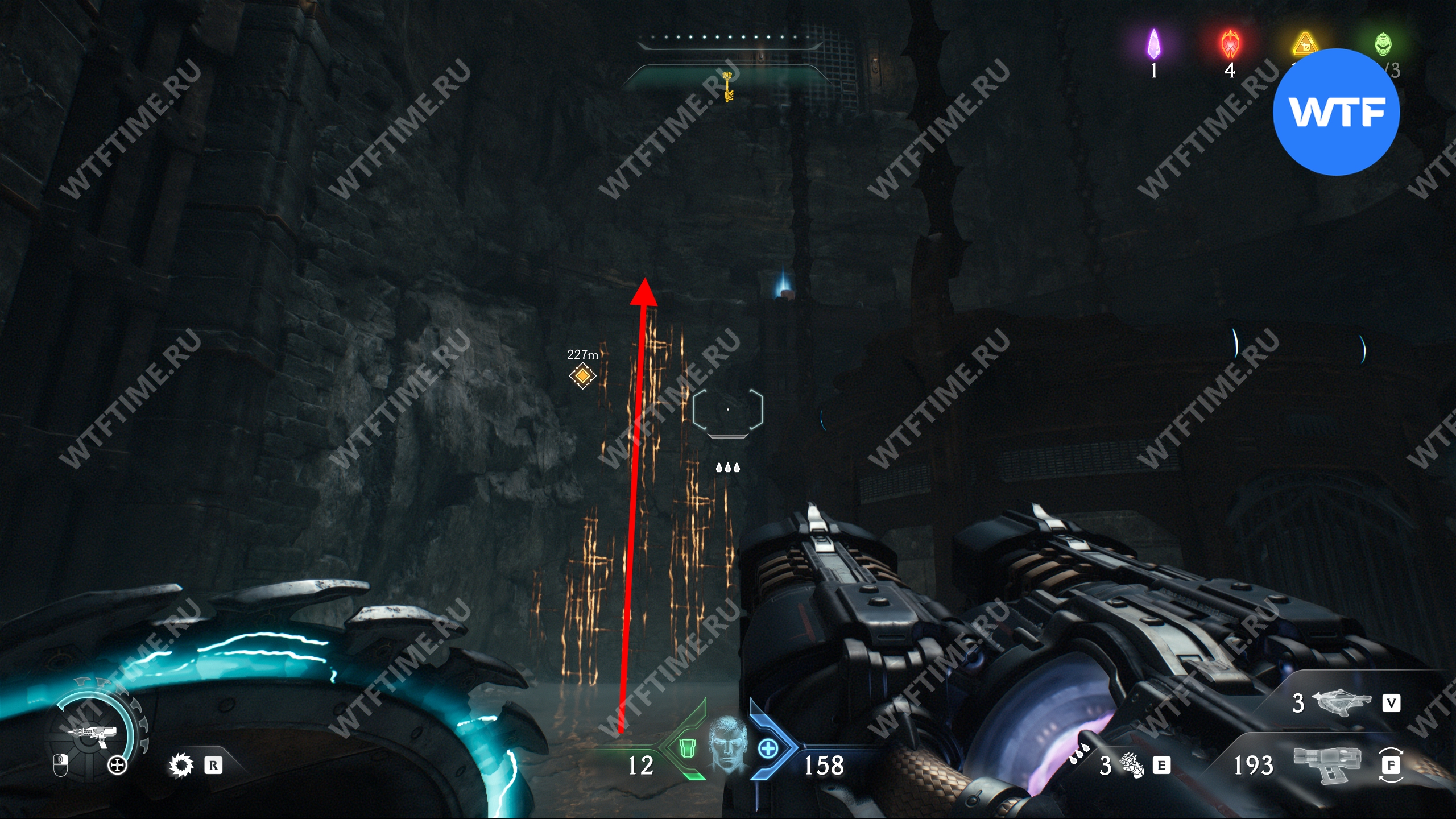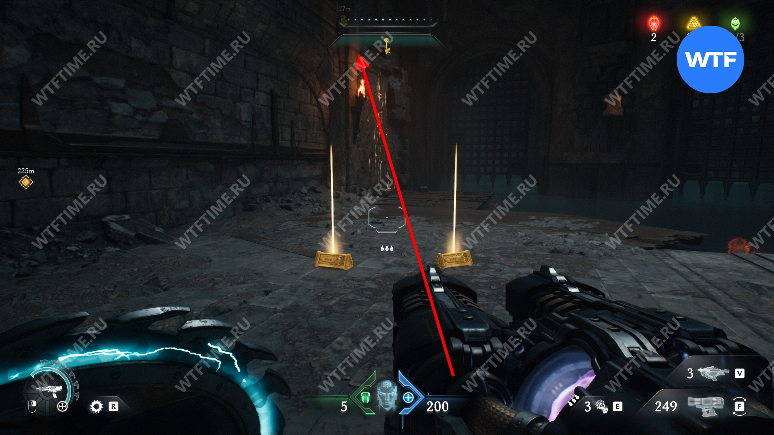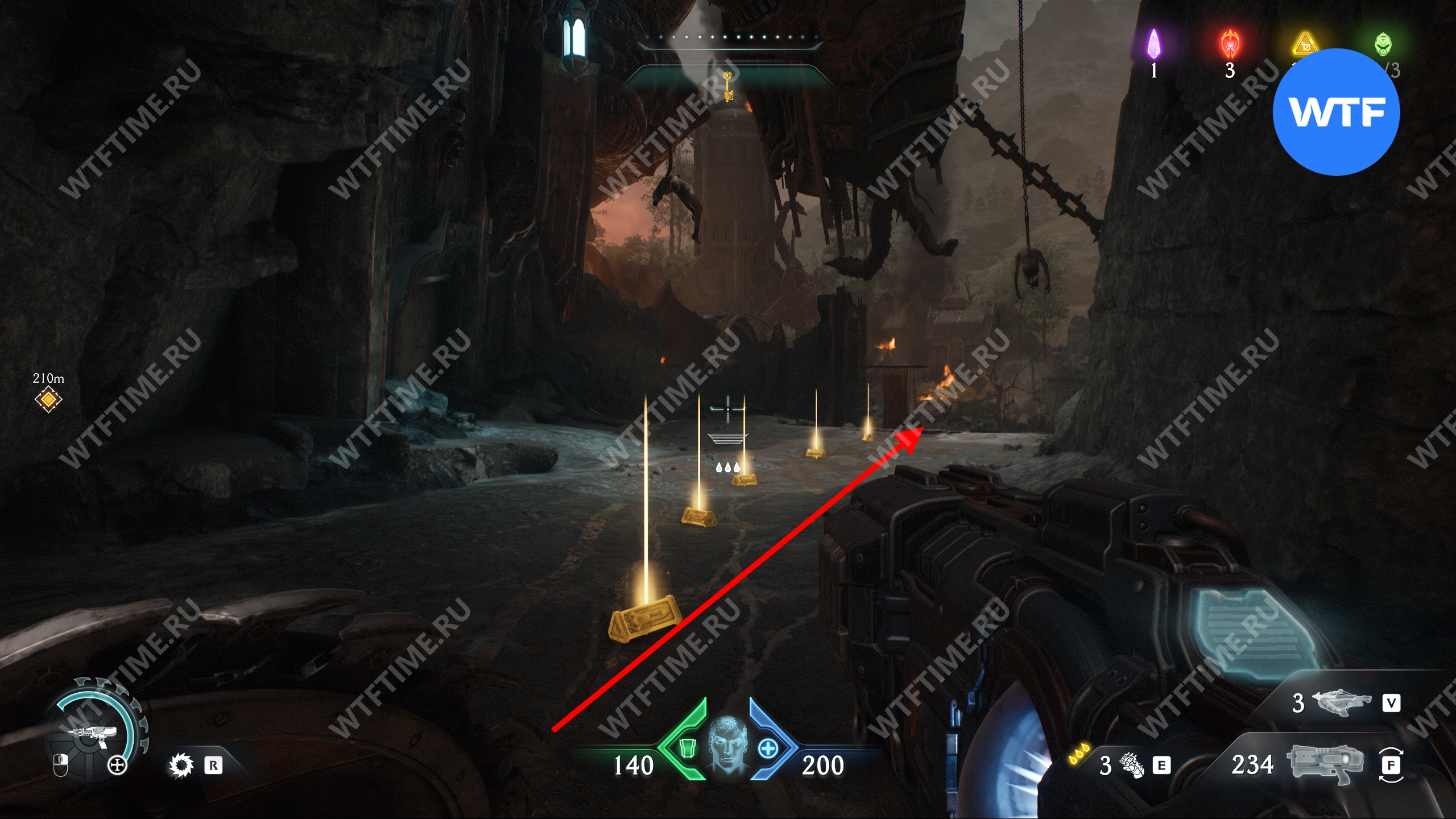 Прыгайте вниз и соберите золотые слитки, ведущие к желтым воротам. Откройте их, а затем исследуйте два боковых прохода слева, чтобы найти печать жизни и расцветку для оружия «Кошмар». После этого вернитесь обратно наверх при помощи синего трамплина.