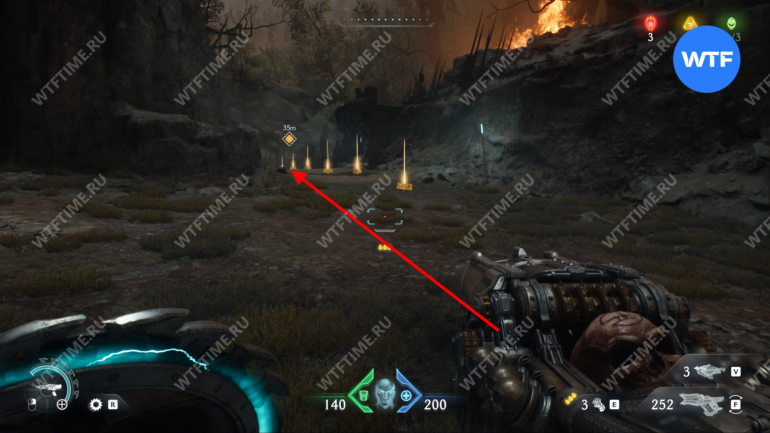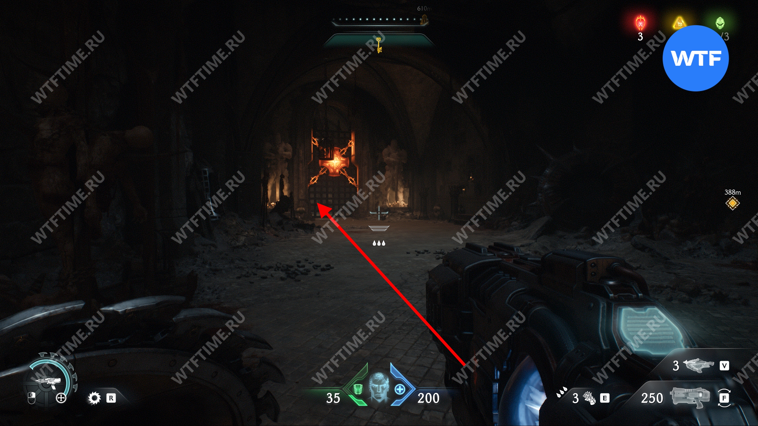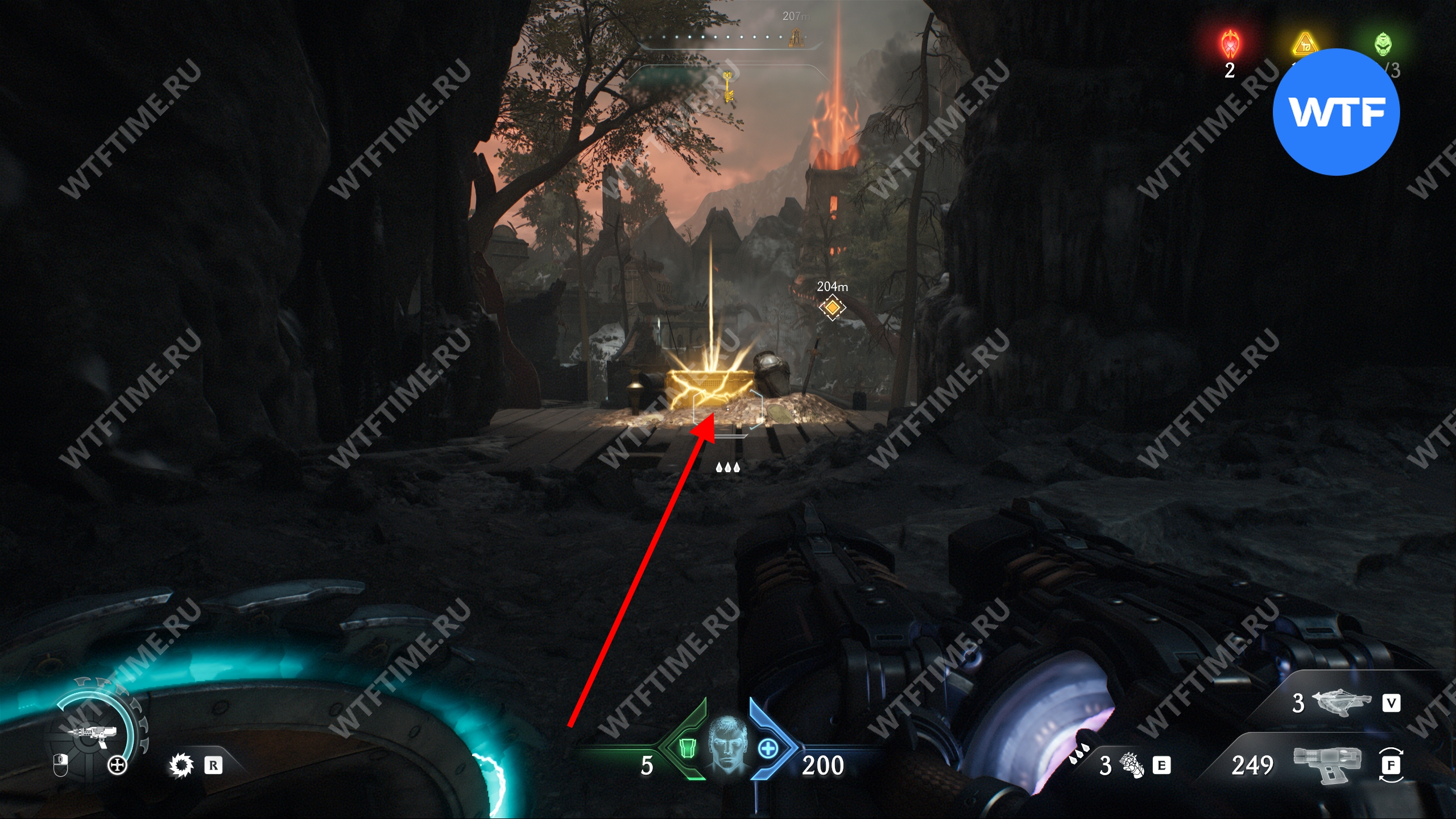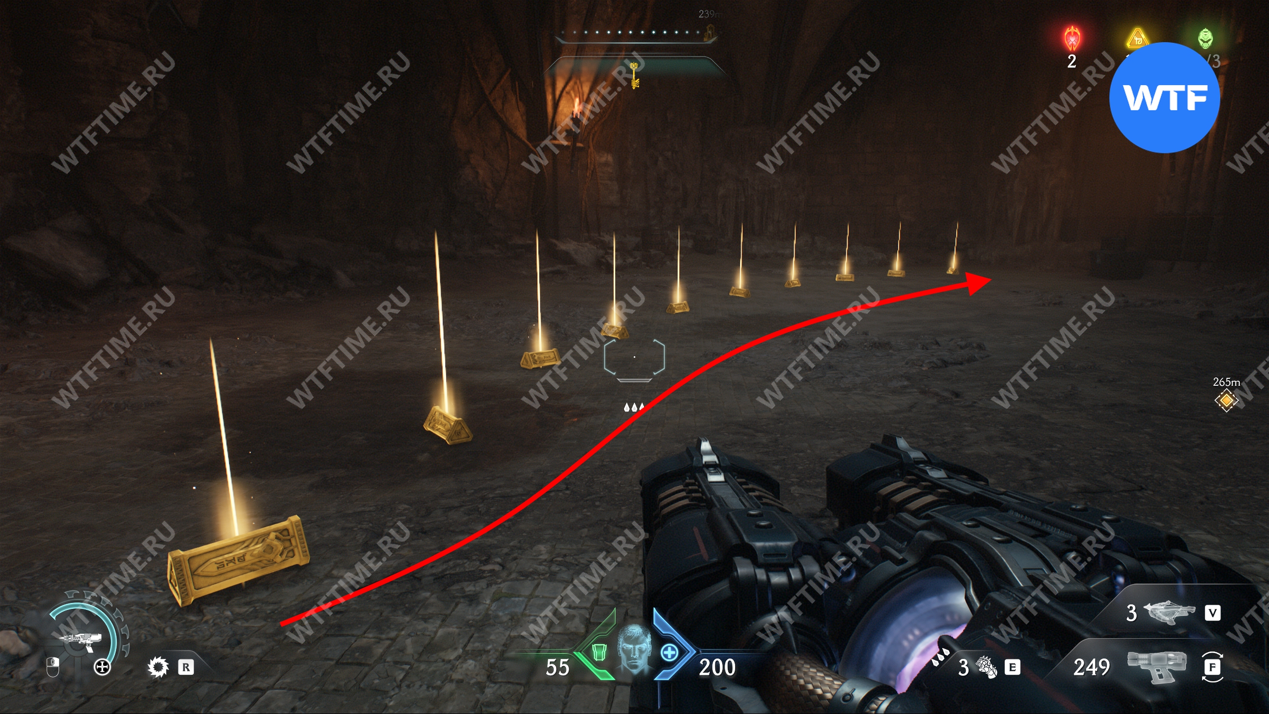 Прыгайте вниз и соберите золотые слитки, ведущие к желтым воротам. Откройте их, а затем исследуйте два боковых прохода слева, чтобы найти печать жизни и расцветку для оружия «Кошмар». После этого вернитесь обратно наверх при помощи синего трамплина.